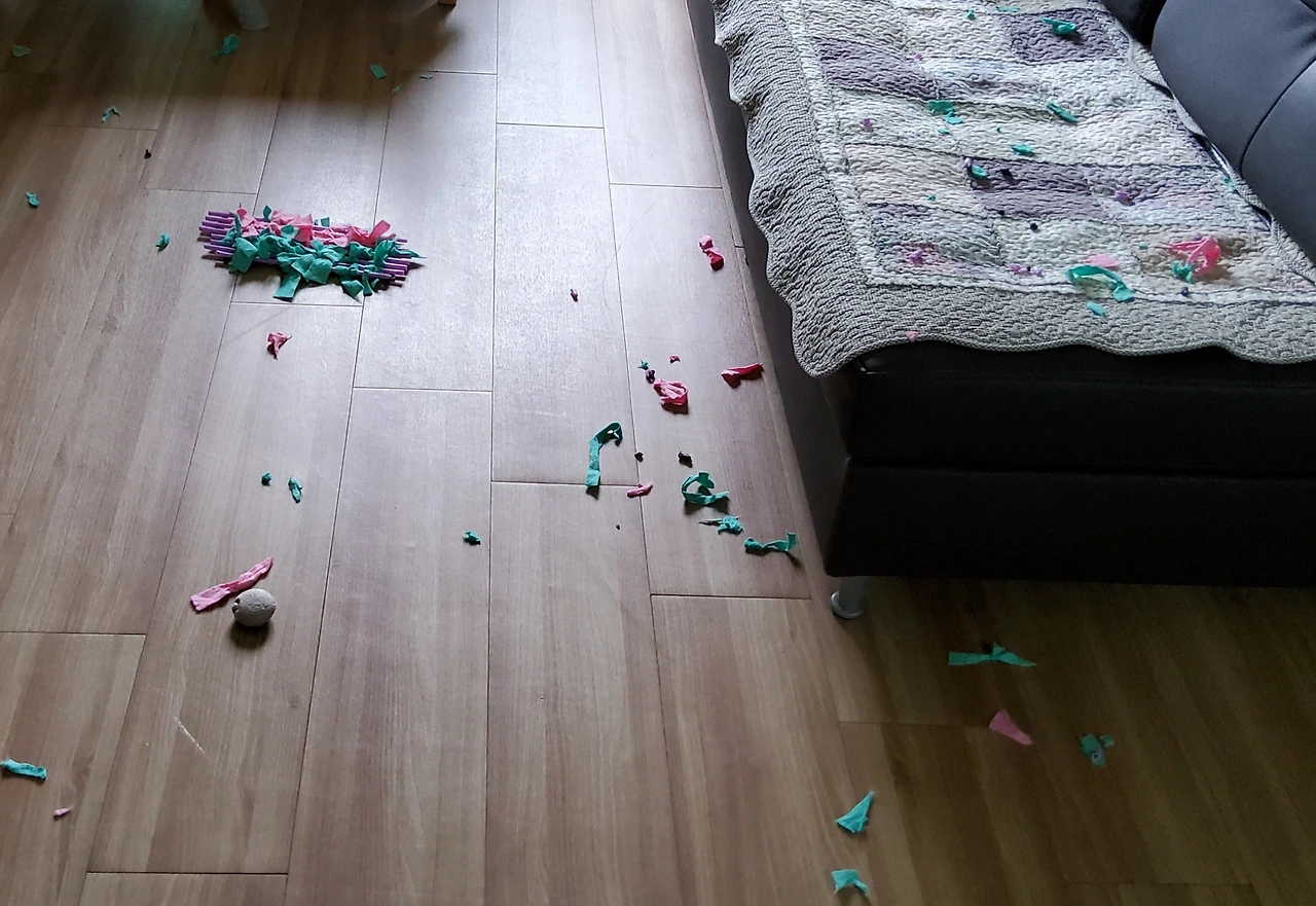 이 장마철을 건강하게 지내는 방법은 없을까. 많은 사람들이 노즈 워크 활동을 많이 시키라고 한다. 욕실 바닥에 있던 플라스틱 발판이 눈에 띄었다. 냉큼 잘라다 사은품으로 받은 일회용 행주를 길게 잘라 일일이 매달으니 노즈 워크 장난감이 되었다. 틈새마다 간식을 숨겨서 주었더니 엄청난 집중력으로 논다. 그러나 잠시 후 눈을 돌리니 집안이 엉망이다. 반나절 걸려 만든 노즈 워크 놀잇감이 처참하게 망가졌다. 행주천은 물론 긴 빨대 같은 플라스틱도 잘게 잘라져 알록달록 파편이 되어 뒹굴고 있다. 투투는 일 벌여놓고 입맛을 다시며 내 손에 코를 밀어 넣는다.
