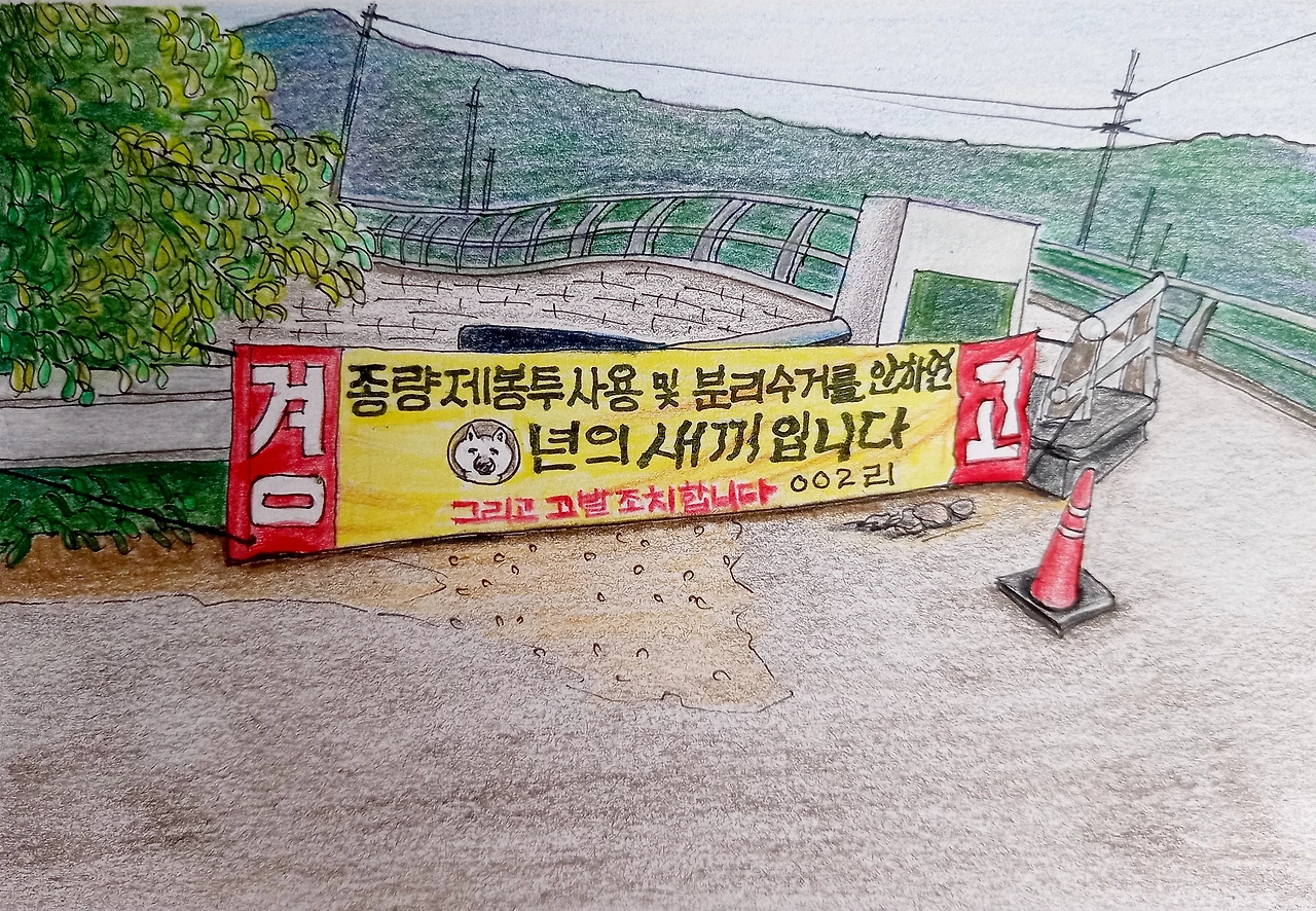 현수막을 걸자고 한 배경엔 분명 문제가 있었겠다. 문제를 해결하고자 뜻을 모았을테고 강한 경고를 전달하고자 저 현수막을 결정했을 것이다. 그런데 현수막이 걸리는 순간 oo 2리 마을의 주민들 자신이 길을 지나는 모든 사람들에겐 물론이고 그들 스스로에게도 욕설을하게 된다는 사실을그들은 알고 있을까. 그들이 비난하는 대상 안에 불특정 다수는 물론 스스로도 해당된다는 것을 알고 내걸었을까. 다른 무엇보다도 주민들은 이러한 갈등의 표출을 지켜 볼 어린 아이들을기억해야 했다.