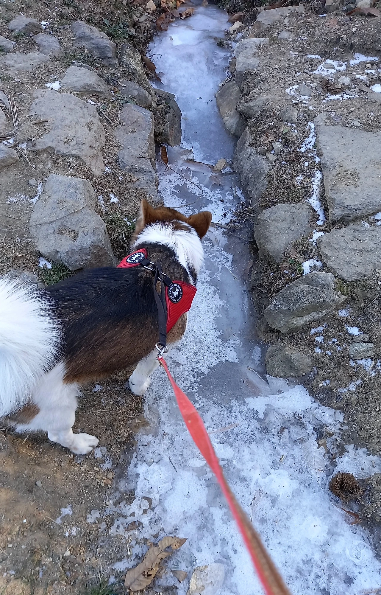 산길에 들어서니 녹지 않은 눈이 흩어져 있고 얕게 흐르던 개울물이 얼었다. 얼음을 처음 보는 투투는 냄새를 맡느라 정신이 없다. 녀석이 추울까 봐마음이 쓰인다. 얼음 맛을 보려는지 혀를 날름거린다. 문득 투투의 혀에 달라붙은 개울이 통째로 떨어지는 상상을 한다. 헉, 우리 투투 혀는 어찌 될까. 투투야, 얼음 핥으면 안 돼. '안돼.' 하는 말에 투투 움찔 물러서더니 한쪽 발을 살짝 들고 냄새를 맡는다. 발이 시린가? 신발을 신겨야 하나. 고민된다.