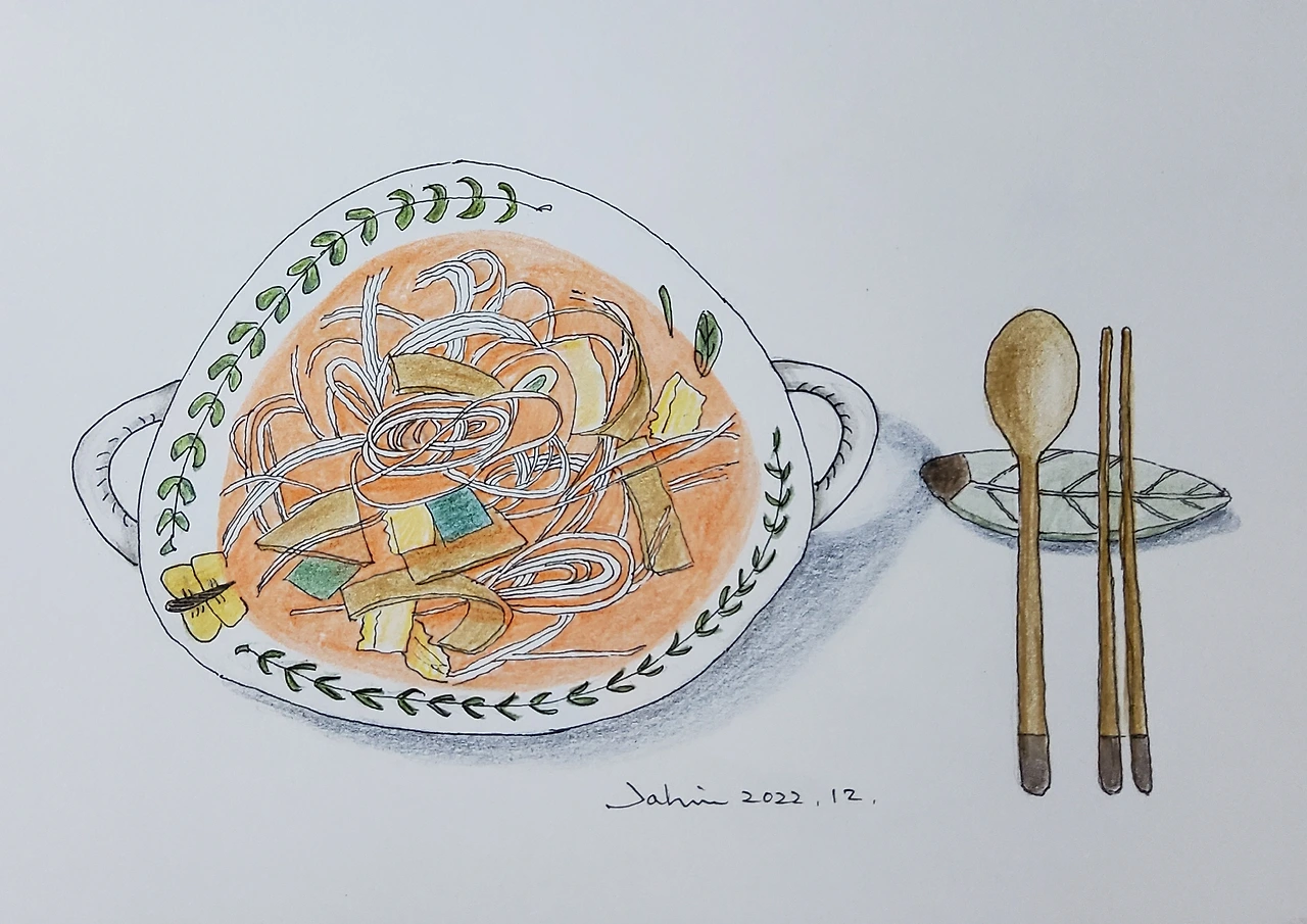 집에 돌아오니 작은 아들도 제 형네 가서 놀고 오겠다며 가고 없다. 한 해 마지막날 저녁은 약속 없는 우리 집 개랑 남편이랑 셋이서 먹었다. 우리 집 개는 고기 국물에 사료를 말아먹었고 남편과 나는 치킨과 맥주, 어묵을 넣은 김치국수를 끓여 먹었다. 김치국수를 먹으며 남편은 온 사방에 카톡을 날렸고 나는 맥주를 더 마실까, 넷플릭스 영화를 볼까 생각하는 동안 슬그머니 12시가 되었다. 여행 프로그램을 보던 남편이 어, 12시 넘었네, 하고 말했다. 우리는 식탁을 치우고 보던 TV와 마당의 등을 끄고 잠자리에 들었다.