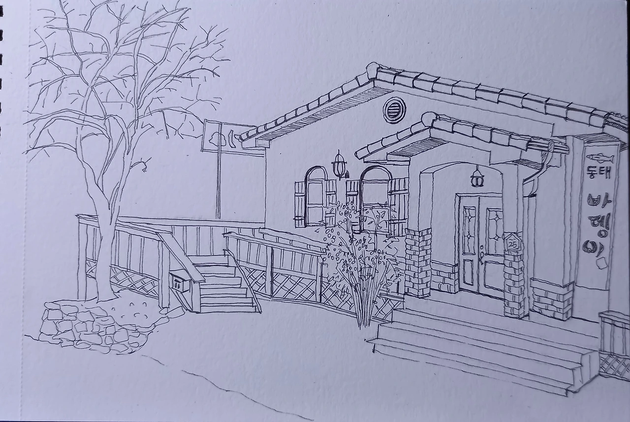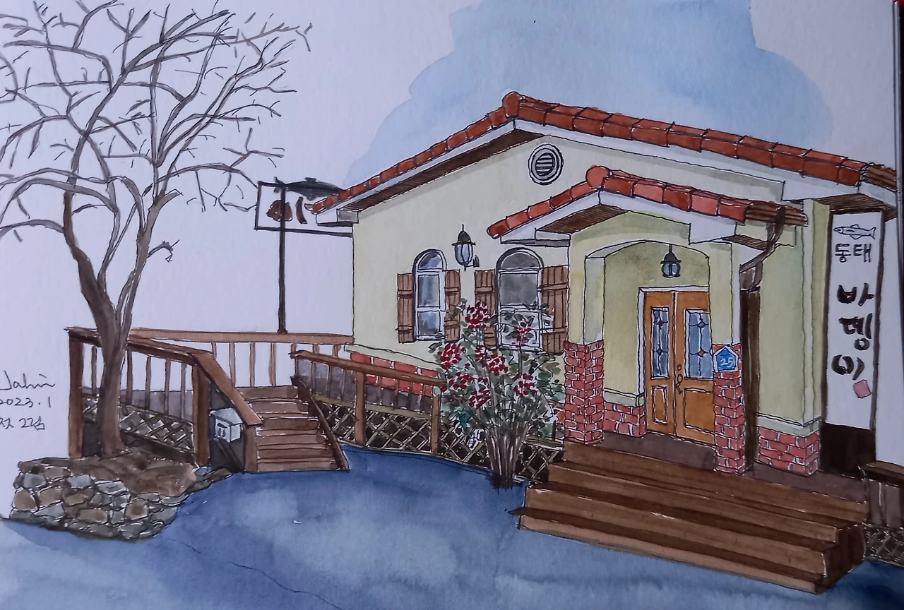 남편은 나와 반대로 바다에서 나는 것들을 아주 좋아한다. 생선회가 있다면 먼 거리도 마다하지 않고 간다. 그런 사람과 살다 보니 조금씩 생선을 먹을 수 있게 되었다. 여전히 고등어는 먹지 못하지만 삼치도 먹고 흰 살 생선은 거부감 없이 먹을 수 있으니아주 장족의 발전이다. 요즘은 동태탕 생각이 난다며 일부러 찾아가 먹기도 하는 지경에 이르렀다. 지금 살고 있는 곳으로 이사 오기 전 옆동네인 팔당댐 근처에서 살았는데 그곳 지인들이 맛있고 정갈한 집밥이 있다며 소개해 준 곳이 오늘 그림의 식당이다.