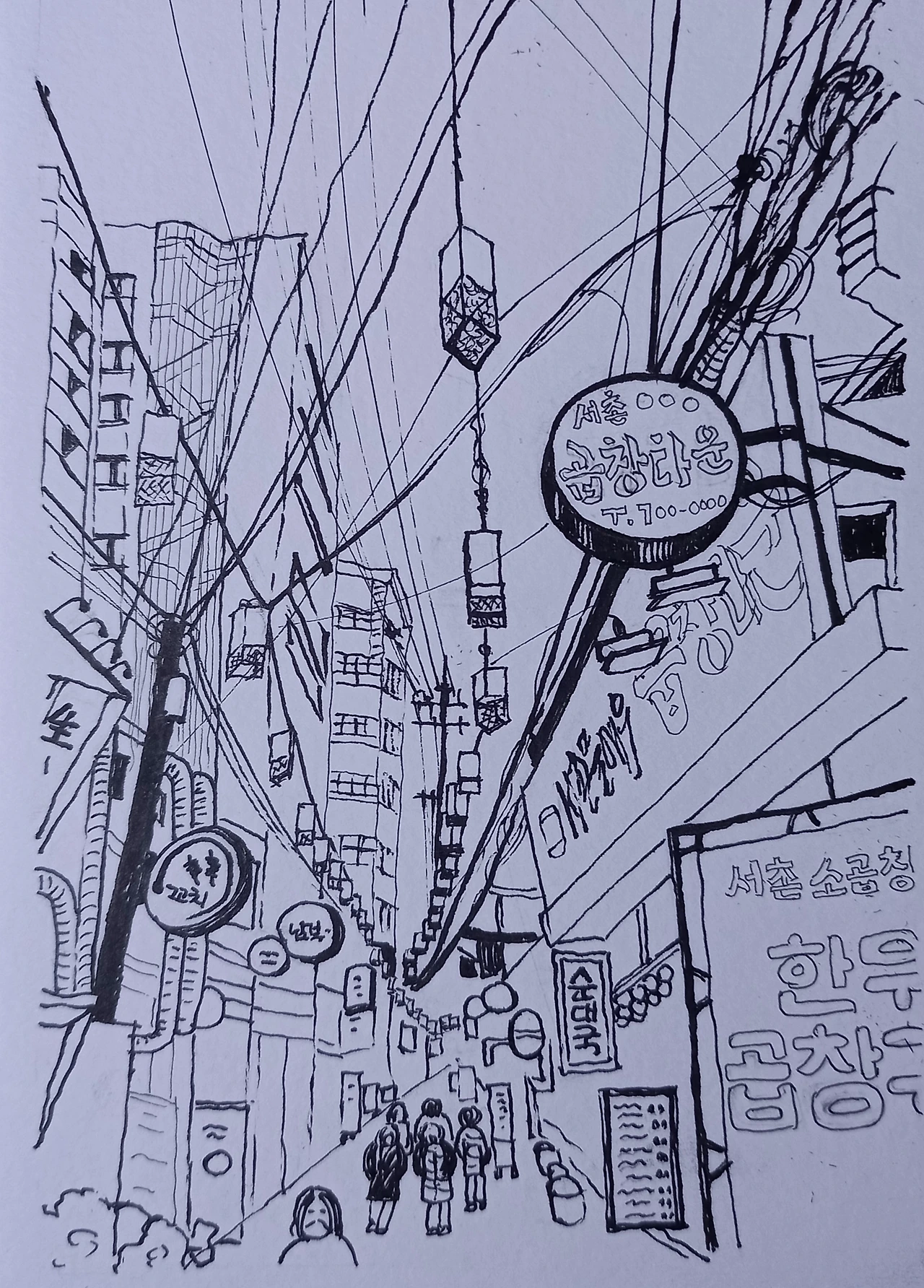 금천교 시장에서 찍은 사진을 고르고 그중 하나를 그려 본다. 전깃줄이 눈에 띈다. 도시의 삶은 저 엉킨 전깃줄이구나. 전류가 흐르는 저 선을 따라 빛과 에너지가 흐르고 찌릿한 위험도 흐른다. 그 속에서 사람들은 밥을 먹고 돈을 벌며 얽혀 살아가는구나. 그림을 그리며 또 객쩍은 생각 한 보따리가 엉켰다.