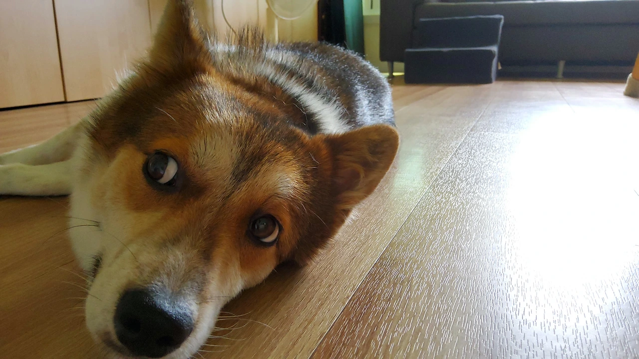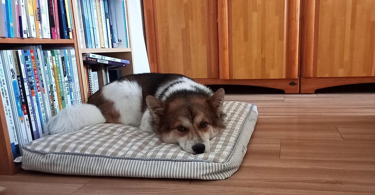 거실의 에어컨이 돌아가면 그 앞에 누워있다가 슬그머니 방으로 들어가 제 잠자리에 바싹 엎드려 있는다. 처음엔 시원했지만 시간이 지나니 너~무 시원해진 거다. 엄마 아빠의 움직임을 쫓으며 눈만 굴린다.