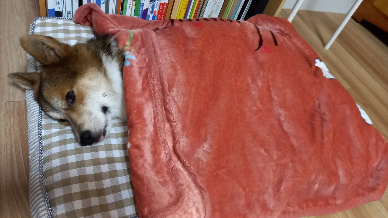 담요를 덮은 채 덜덜 떨고있는 투투. 혀가 조금 나와있다