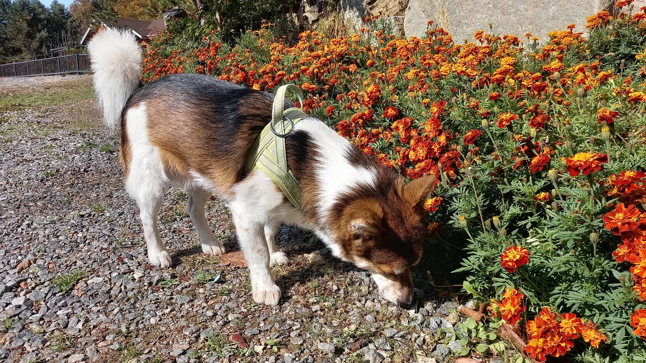 수술 후 9일째. 투투는 다시 걷기 시작했다. 서툰 걸음이지만 퇴근하는 아빠를 반기러 나가고 밖으로 나가 꽃밭에 오줌도 누었다. 투투 발에 진한 향기의 노란 메리골드 꽃잎이 붙어있었다.