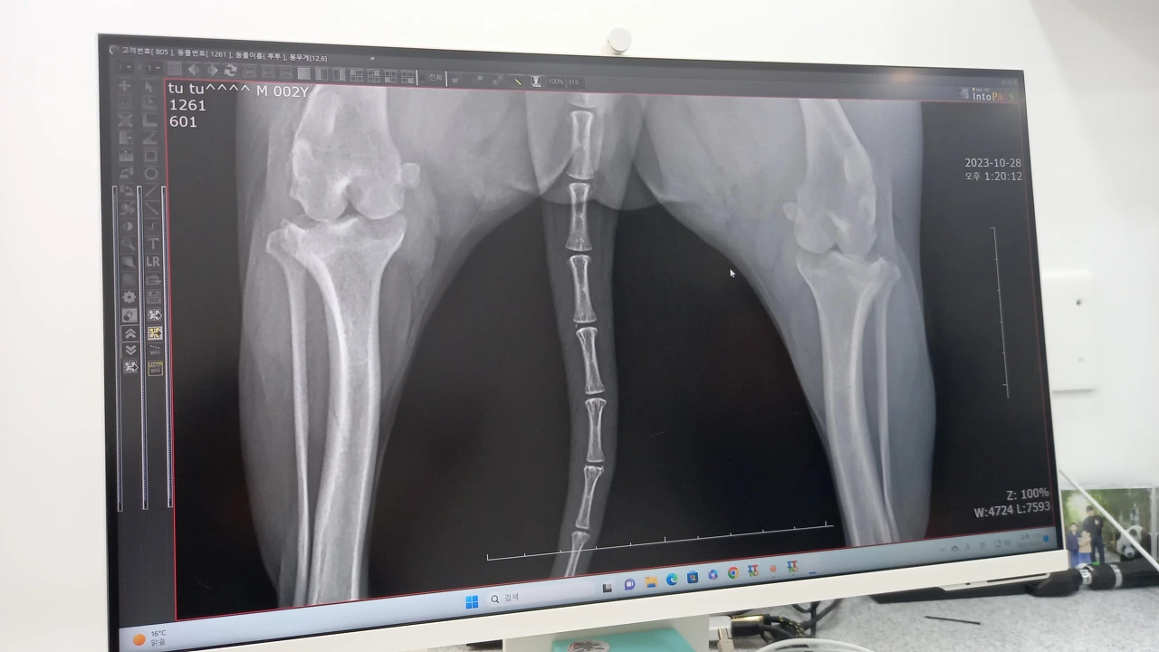 다음 날 오전, 서둘러 병원에 갔다. 엑스레이를 찍어보니 슬개골 탈구가 된 상태였고 인대도 끊어졌을 가능성이 높다고 했다. 엑스레이엔 인대가 보이지 않았다. 또 철렁! 엑스레이 사진은 의학적 지식이 없는 사람이 보아도 알 수 있을 만큼 상황이 나빠보였다. 뼈와 뼈 사이가 간격 없이 바짝 붙어 있고 아래 뼈는 휘어져 있었다. 수의사는 그동안 통증이 심했을 거라며 당장 수술을 해야 한다고 했다. 눈물이 쏟아졌다. 겁에 질려 덜덜 떠는 투투를 끌어안고 나 또한 겁이 나 울었다.