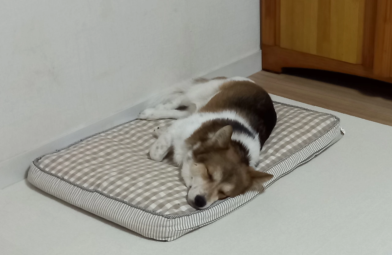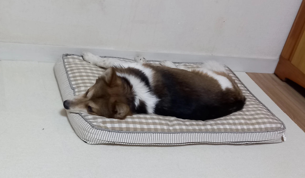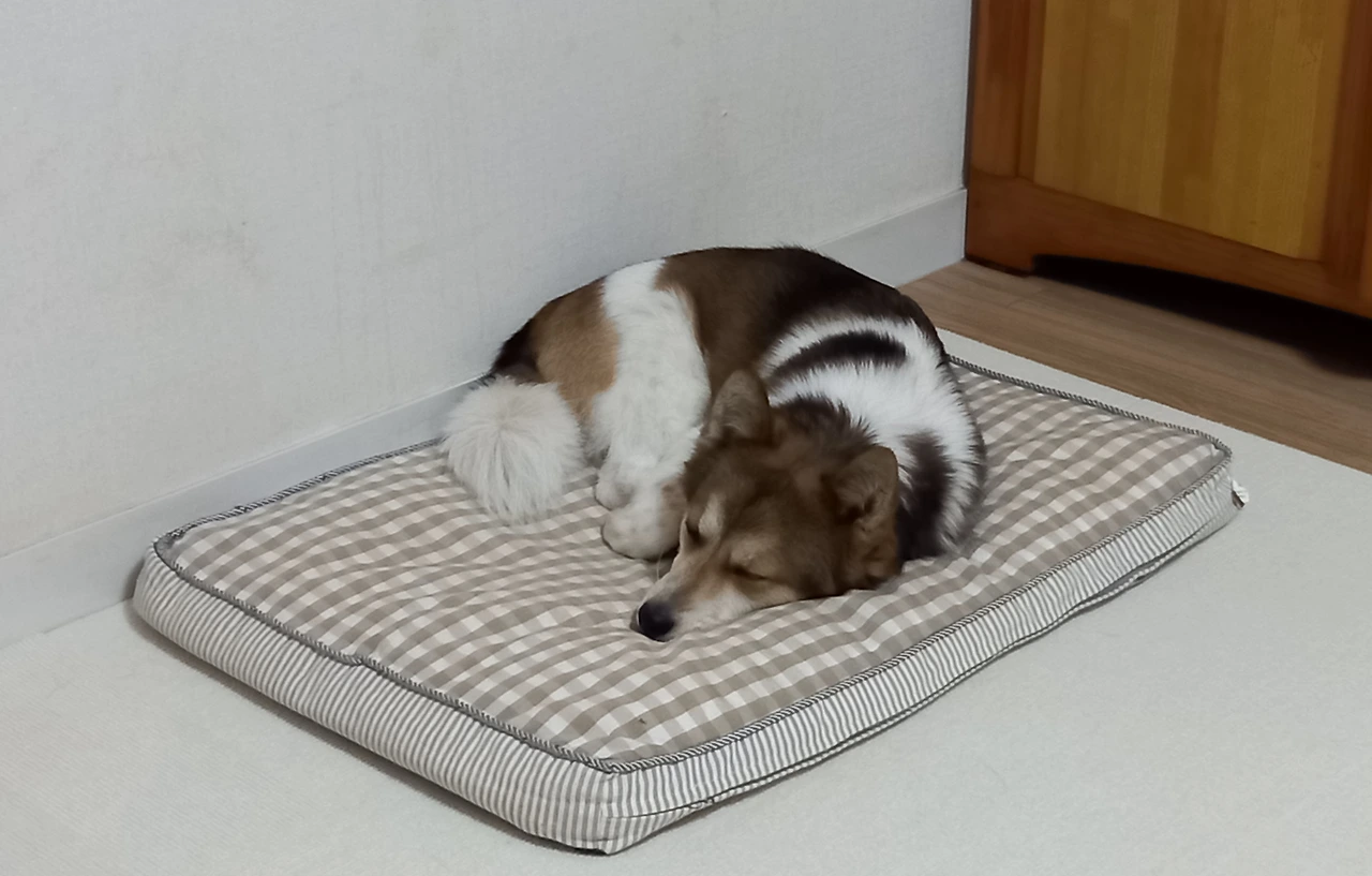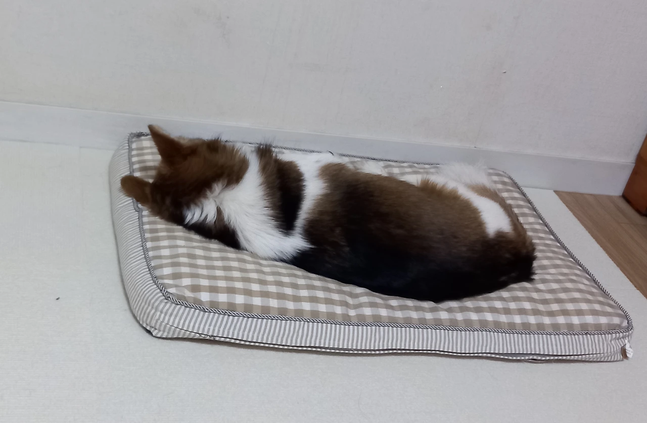 문득 드르릉 푸~, 드르릉 코~하는 소리가 들린다. 투투의 코 고는 소리다. 투투, 코 고는 거야? 찰칵! 카메라 소리에 번쩍 눈을 뜨더니 대수롭지 않다는 듯 눈을 감고 다시 코를 곤다. 다시 찰칵! 투투는 대부분 엄마를 향해 머리를 두고 자는데 찰칵 소리가 성가셨나 보다. 끄~응 하더니, 등을 돌리고 잔다. 등 돌린 투투의 모습이 우습다.