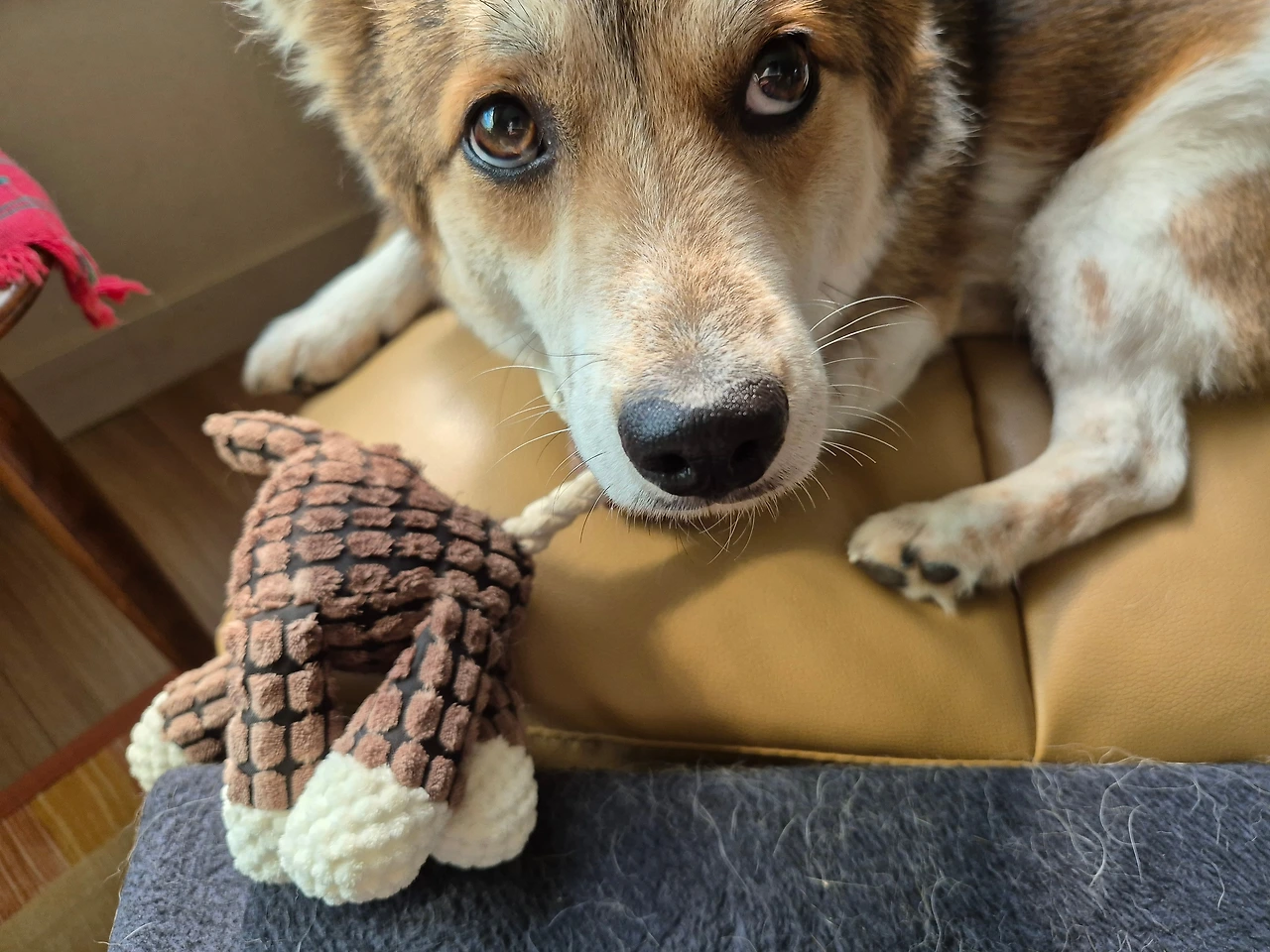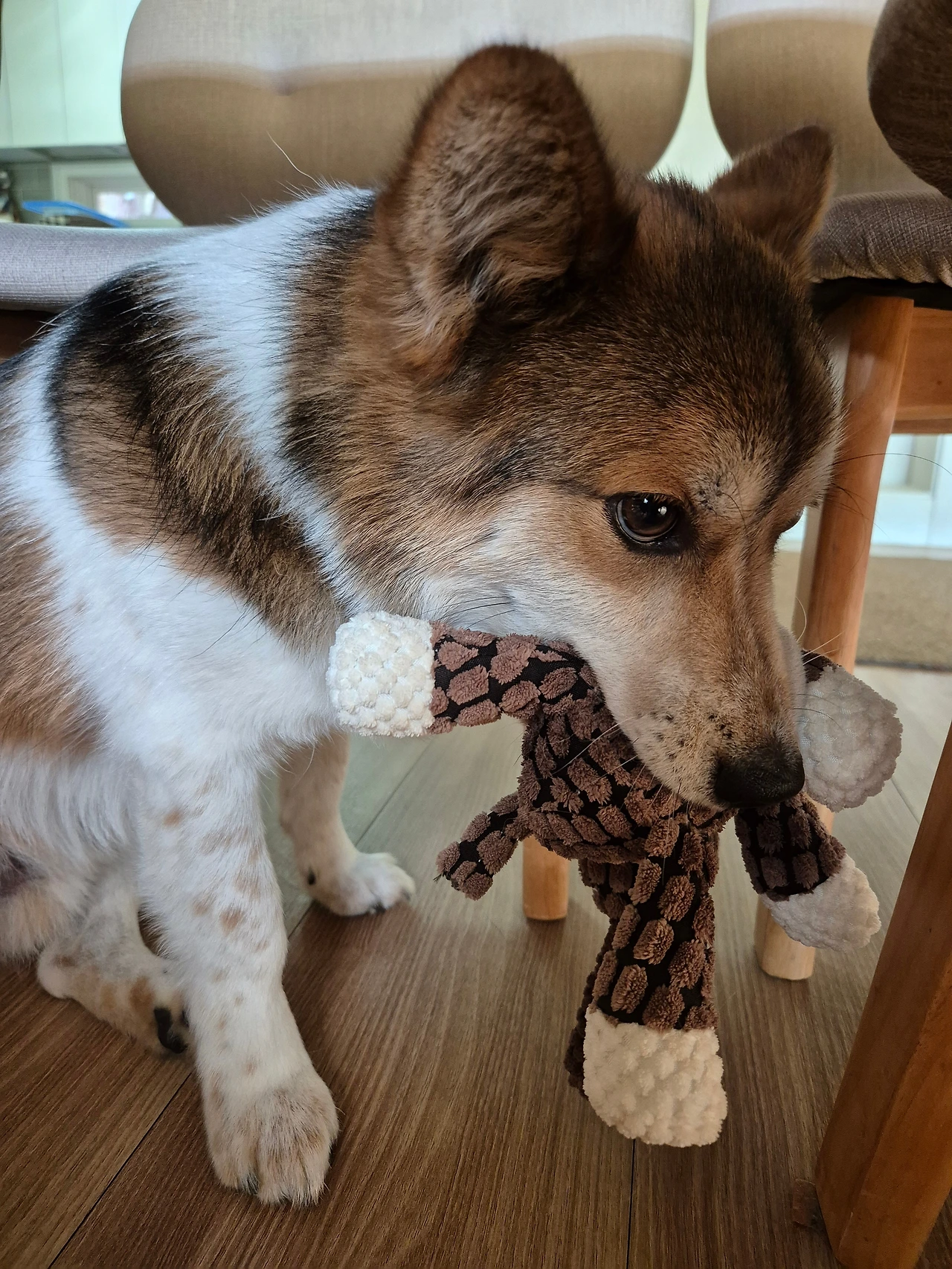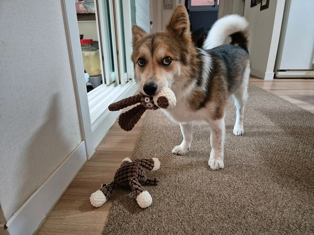 인형을 물고 엄마를 맞이한 투투는 꼬리를 치고 좋아합니다. 투투 그거 뭐니? 하고 물으니 후다닥 테이블 밑으로 들어가 나오지 않습니다. 엄마에게 살짝 으르렁 거립니다. 어이가 없습니다. 제 것이라고 건들지 말라고 합니다.
