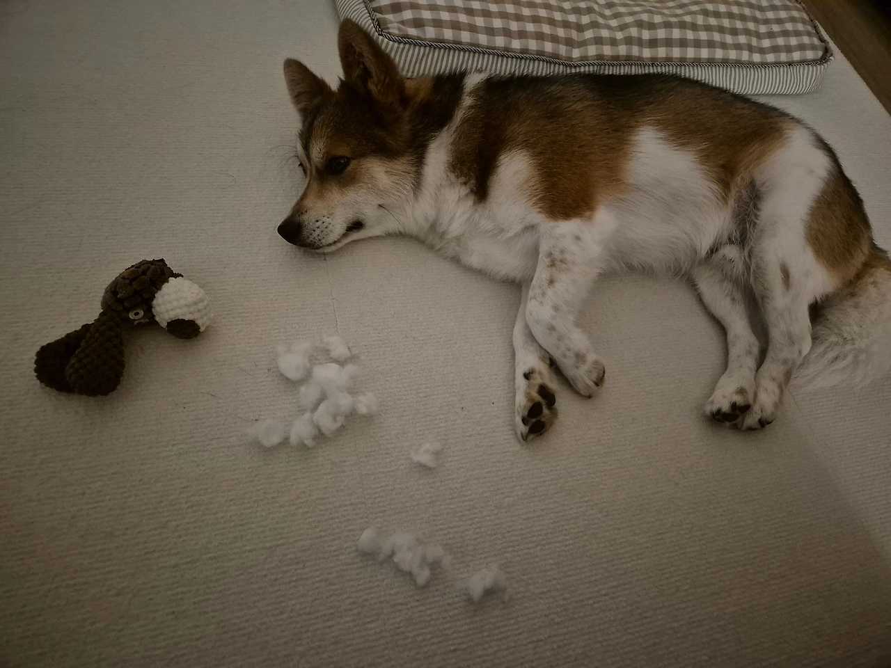인형머리를 채웠던 솜까지 다 빼버리곤 이제 관심 없다는 듯 낮잠을 자려고 합니다. 나가서 자라고 해도 들은 체를 안 합니다.