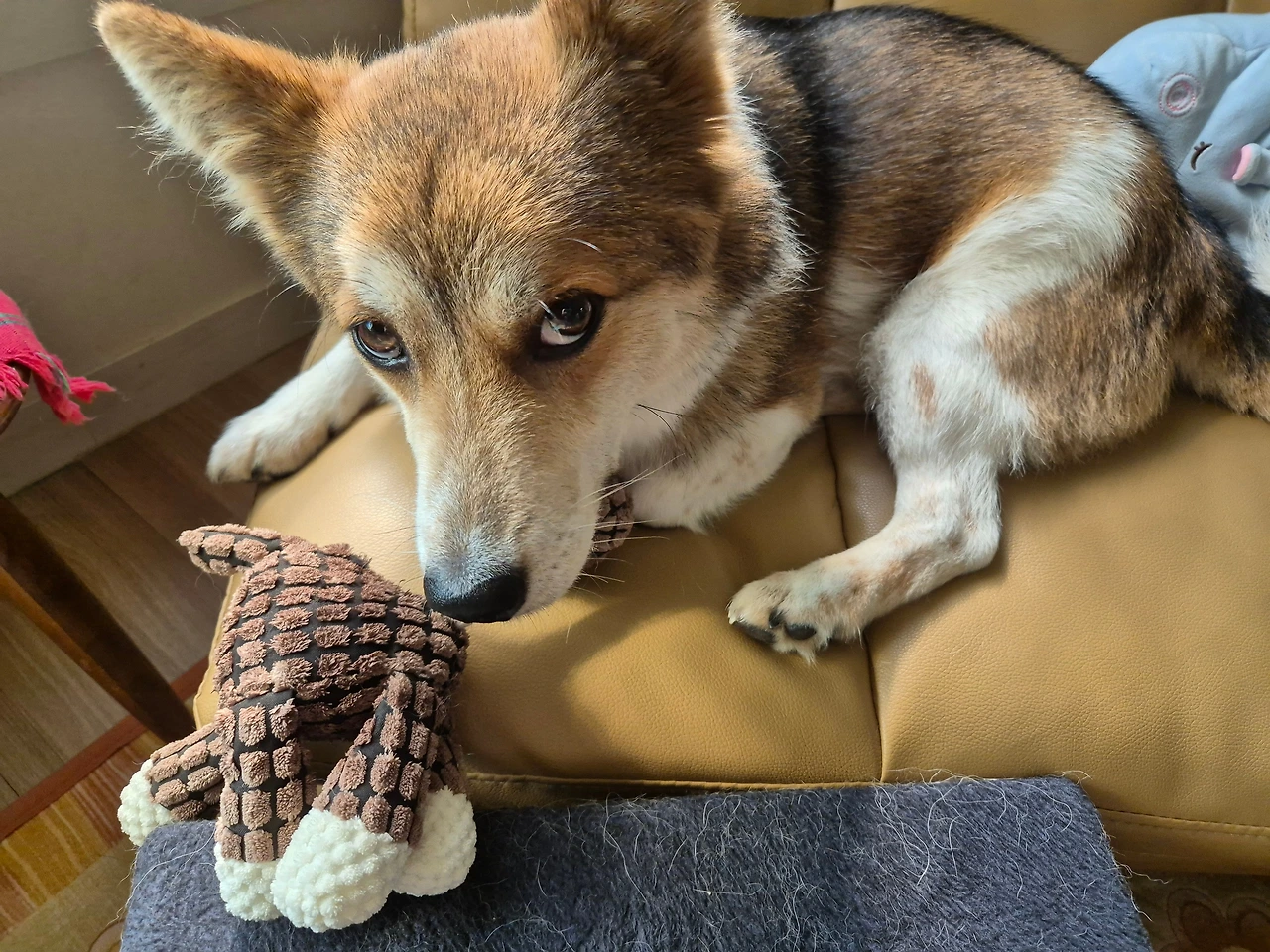 엄마 꺼니까 달라고 손을 내미니 몹시 곤란한 표정을 짓고는 발로 잡고 인형을 사수합니다.으르렁거리는 소리는 안 내지만 주둥이가 살짝 떨립니다.