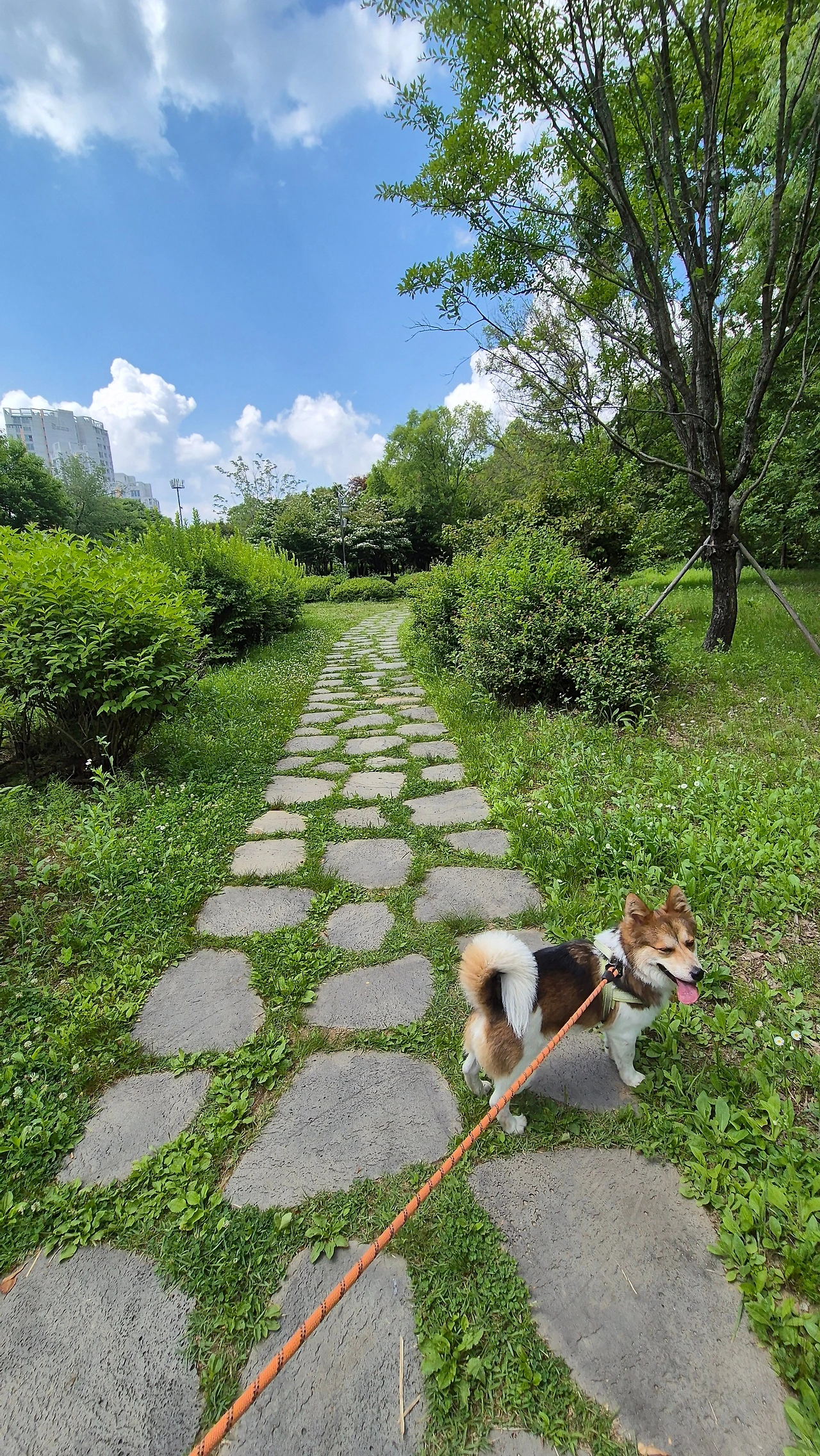 쾌청한 날씨와 청량한 바람이 기가 막힙니다. 구름도 어찌나 예쁜지요. 바람이 앞쪽에서 불면 꽃냄새가 났고 옆에서 불어오면 강물 냄새가 났습니다. 쥐똥나무가 많아 특유의 진한 향이 주변을 맴돌았습니다. 몸을 숙이면 토끼풀향이 나는 공원에는 온갖 향기로 가득합니다. 후각을 자극하는 것이 너무 많아투투는 매우 흥분해서 정신없이 냄새를 맡고 다리를 번쩍 들어 마킹을 합니다.들어 올리는 다리가 하늘을 찌르겠습니다.