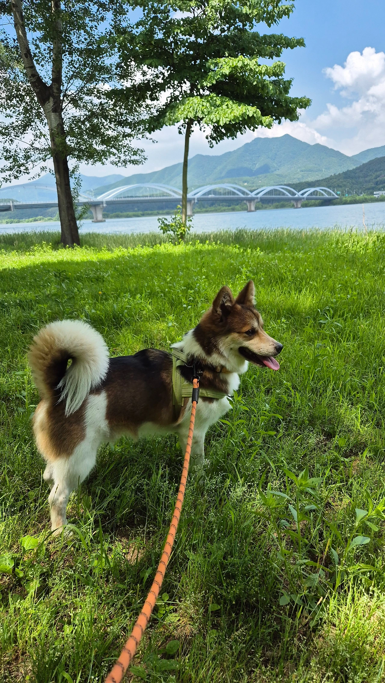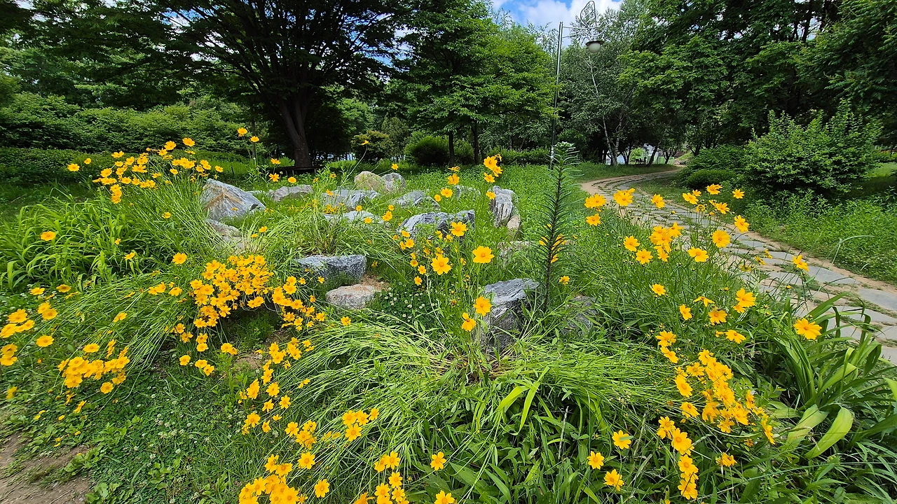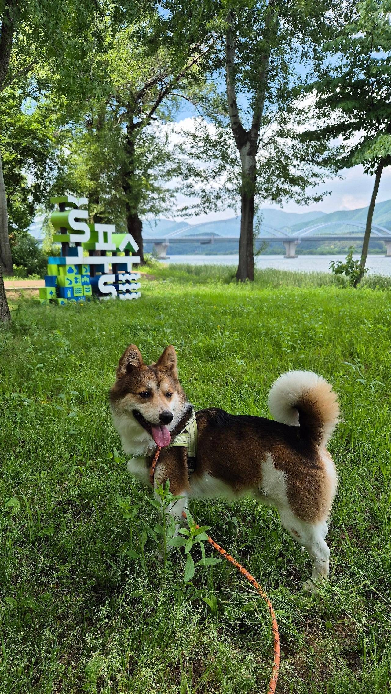 구름이 참 예뻤습니다. 그래서인지 투투 엉덩이에 자꾸 바람이 들어갔나 봐요. 마당에서 놀던 투투가 집에는 안 들어오겠다며 " 낑낑낑~ " 떼를 썼습니다. 혼자 놀면 되는데 엄마도 마당에 나와 서 있으라고 성화입니다. 간식을 준다고 해도 들어오질 않습니다. 그래서 엄마는 하던 일을 접고 투투와 공원으로 갔습니다. 환경부가 조성한 공원인데 강이 있고 나무 그늘이 시원하여 자주 찾는 곳입니다. 주차를 하는데 투투는 벌써 흥분하기 시작했습니다. 빨리 주차를 하라고 하품을 해대며 재촉을 합니다. 산책이 그렇게 좋은 걸까요?