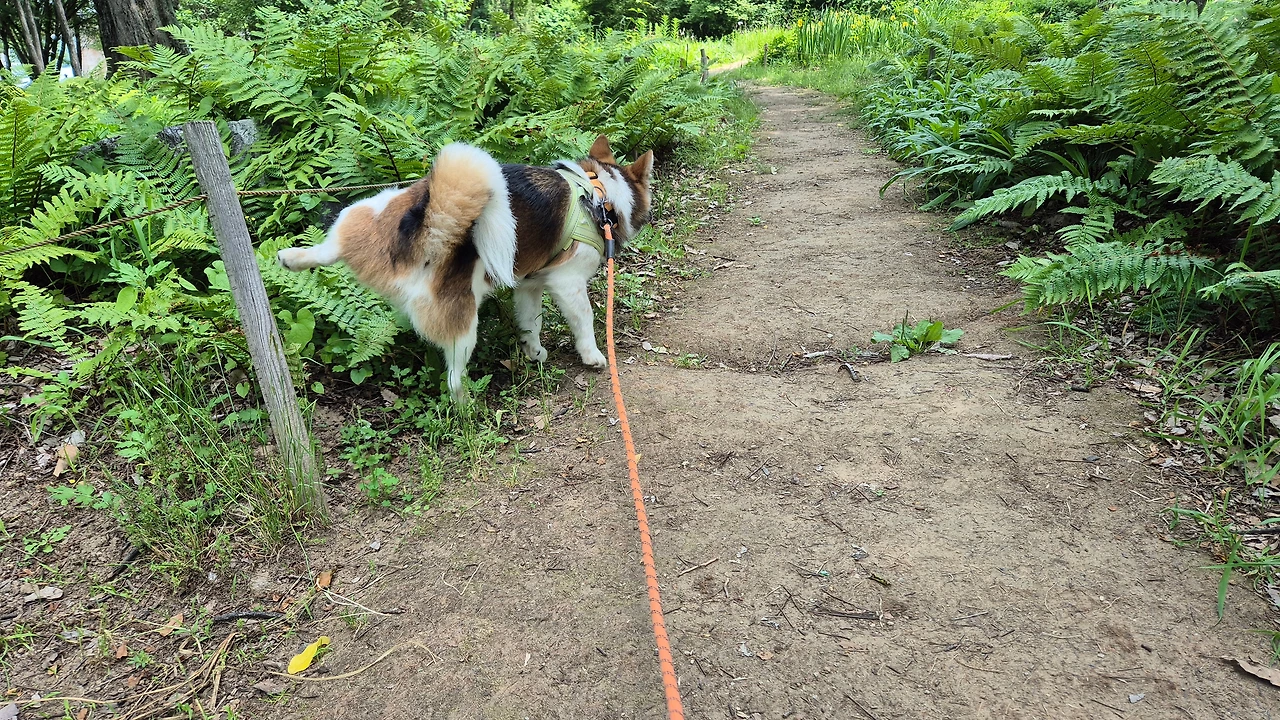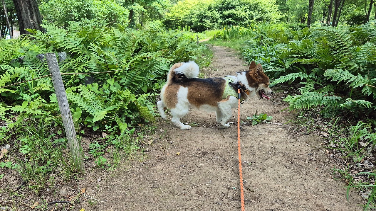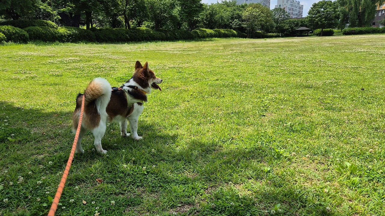 입구에 들어서면 넓은 잔디 마당이 있습니다. 도착하자마자 다리를 번쩍 들고 마킹을 합니다. 투투는 집 앞에서 볼일은 다 보고 왔습니다만 또 몰라서 배변봉투를 준비했습니다. 주말 오전이라 사람도 강쥐도 많이 보이지 않습니다. 투투는 사람들에게 관심이 없는 반면 개들을 보면 흥분하고 특히 큰 개에겐 짖으며 달려듭니다. 엄마를 보호하려는 걸까요? 아니면 겁이 나서 그러는 걸까요? 정말 뭘 믿고 그러는지 모르겠습니다. 그래서 조심해야 합니다. 가슴줄과 목줄을 한꺼번에 채우고 끈은 짧게 잡은 채 엄마는 주변을 살핍니다. 개들이 오면 방향을 바꿔 다른 길로 가야 하니까요. 기분 좋게 나온 산책에서 서로 얼굴 붉힐 일이 생기면 안 되기 때문입니다.