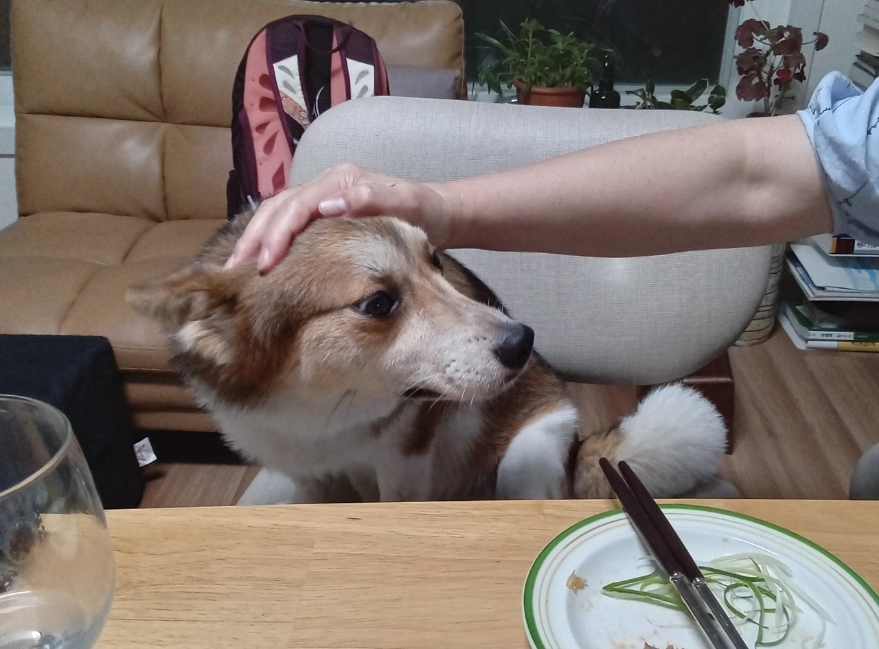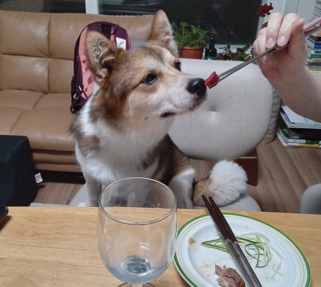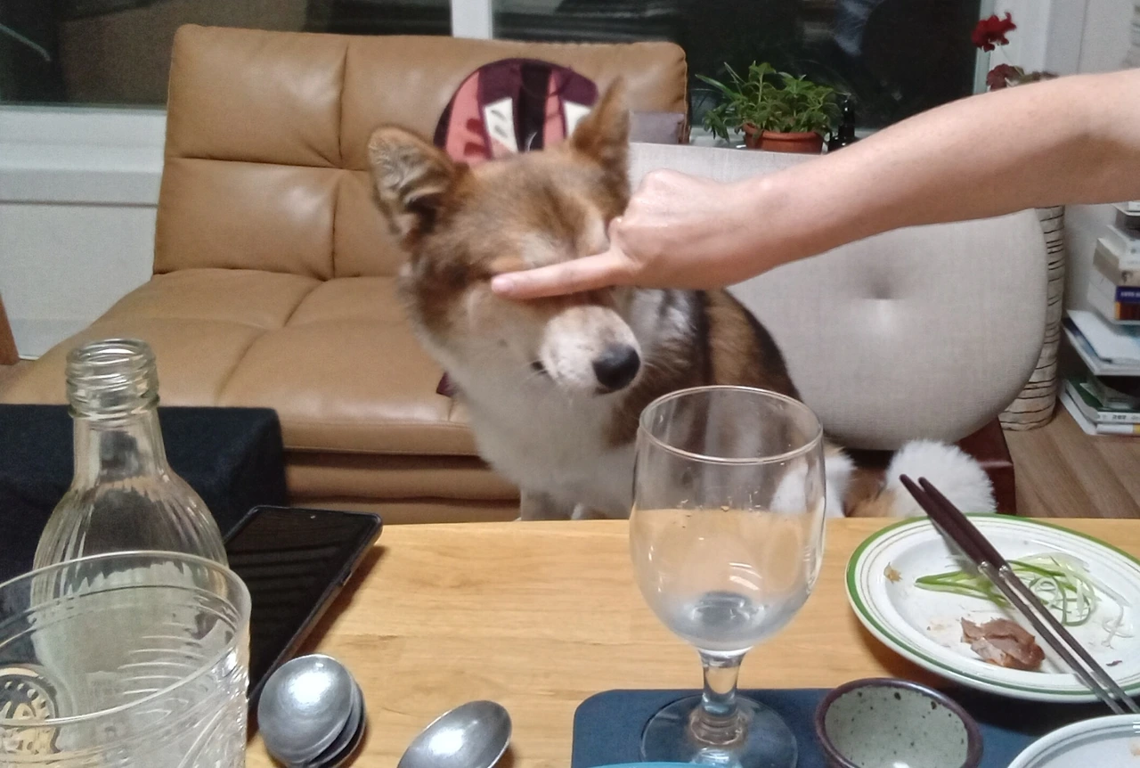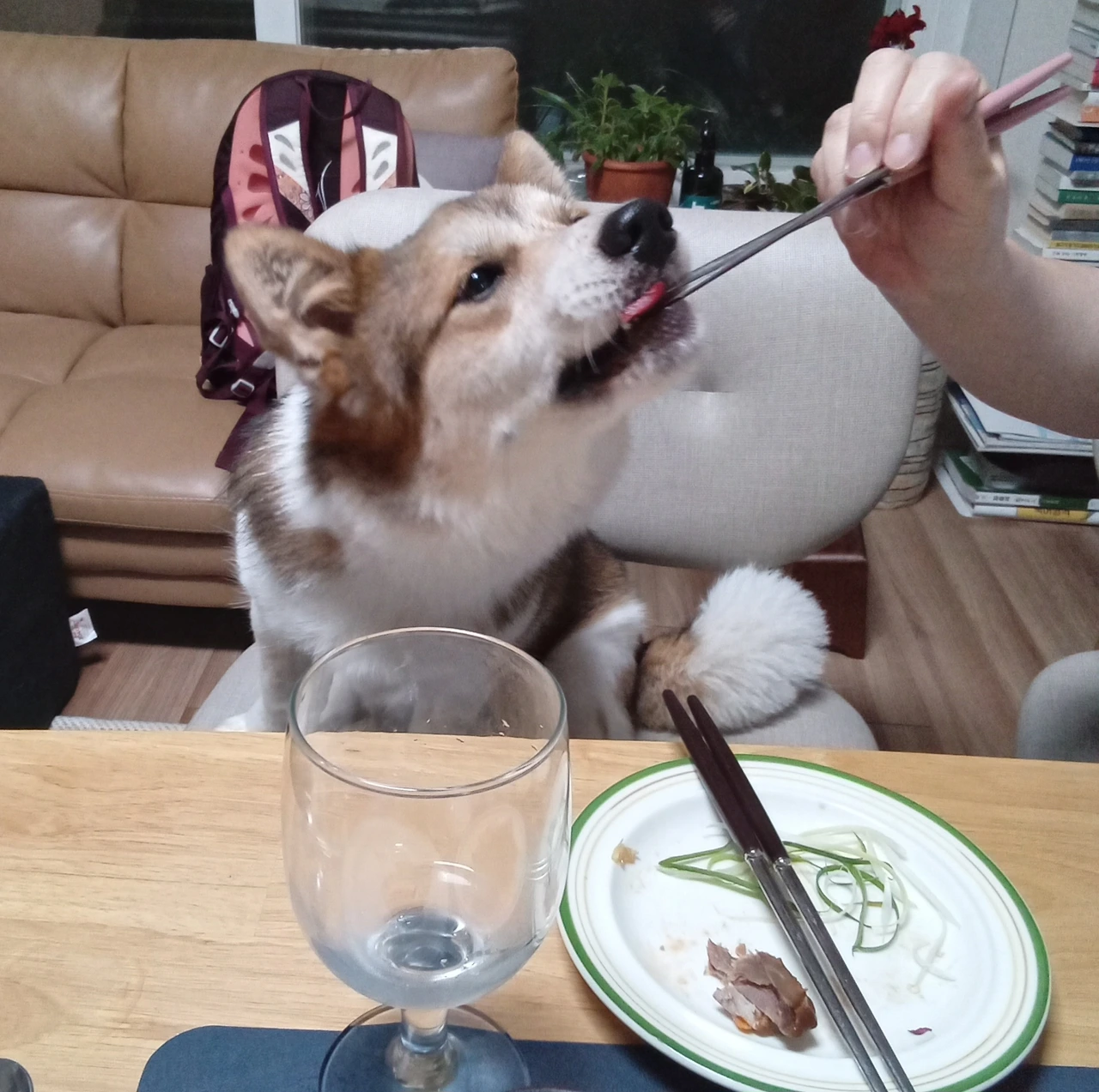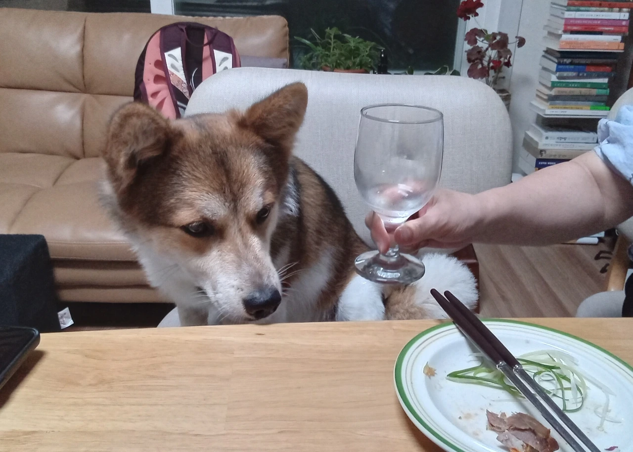 하며 놀러 온 이모가 맑은 소주가 든 잔을 내미니 코로 한 번 킁킁거리더니 고개를 움찔합니다. 그러곤 족발을 향해 레이저를 쏩니다.