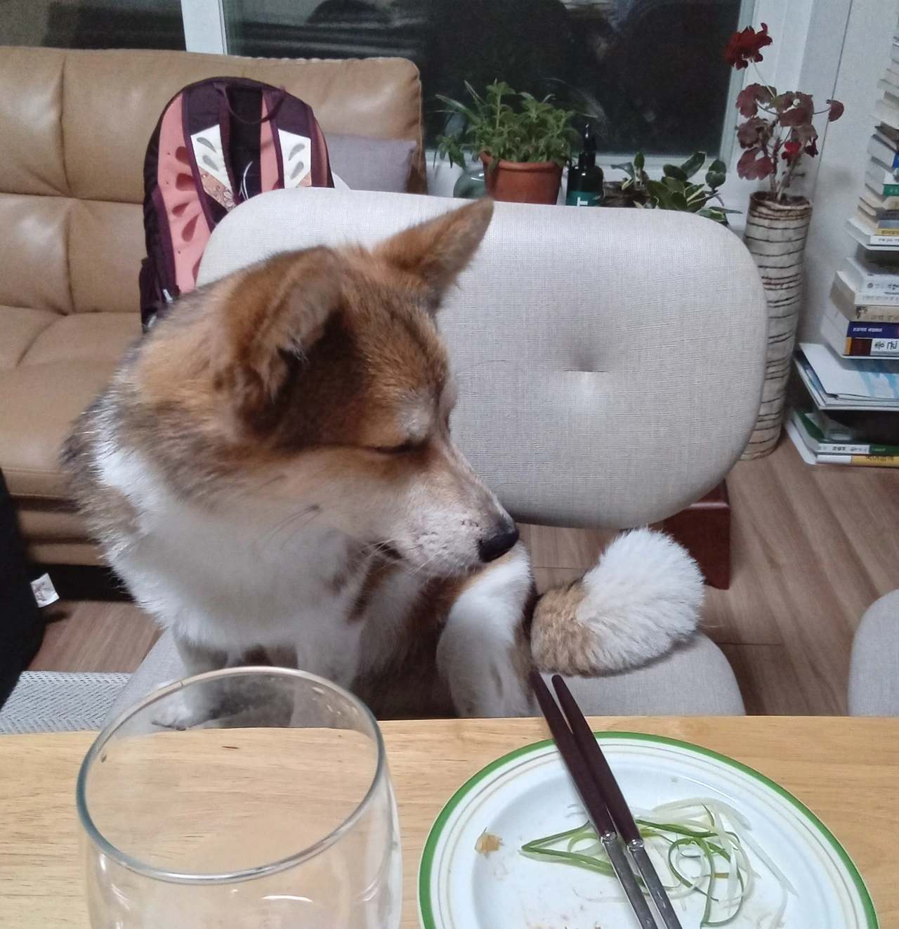 염치 불구 한 자리 차지하고 앉아 물러서지 않습니다. "어허, 투투 버릇없구나" 하고 나무라지만 못 들은 척합니다. 코는 쉴 새 없이 꼬물거리고 눈은 음식에 꽂혔습니다. 의자에서 내려가라고 등을 떠밀어도 몸에 힘을 똭~ 주고 버티기에 들어갑니다.