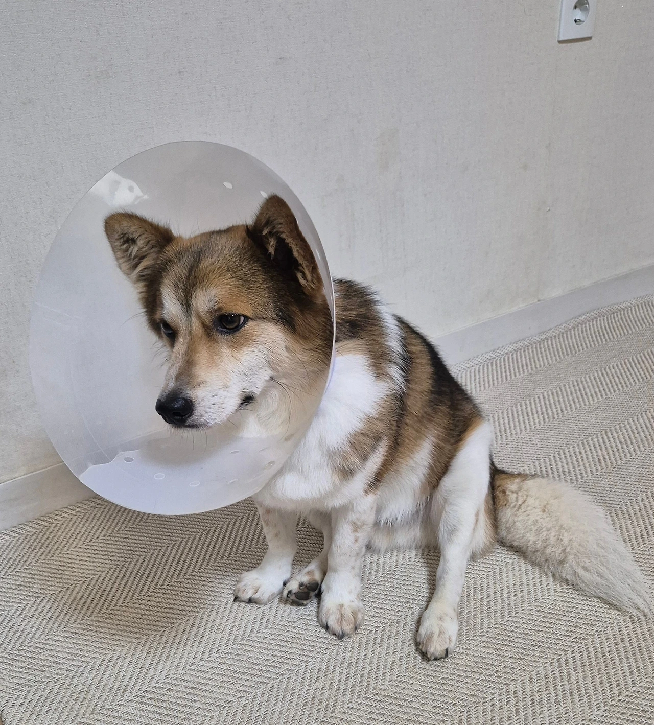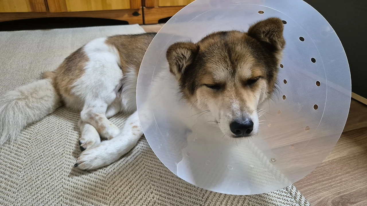 마취가 풀린 투투는 꼬리를 늘어뜨리고 헥헥대며 벌벌 떨었습니다. 투투도 엄마도 마음이 심란했습니다. 저녁에 집으로 돌아온 투투는 세상 우울한 얼굴로 고깔을 쓴 채 엎드려 있습니다. 고깔이 싫어서 자꾸 몸을 털어대고 어떻게든 다리를 핥아보려 하지만 할 수가 없습니다. 간식을 준다는 말에도 꼬리를 치지 않고 초승달 모양 흰자위가 가득한 눈으로 엄마를 쳐다보기만 합니다. 어쩝니까. 싫어도 고깔은 써야 합니다. 부디 상처가 잘 아물었으면 좋겠습니다. 부디 인대가 잘 붙어있으면 좋겠습니다. TPLO인지 용어도 생소한 수술은 안 받았으면 좋겠습니다. 일상에서 안녕하게 지낸다는 것이 얼마나 귀하고 감사한 일인지 또 한번 느낍니다.