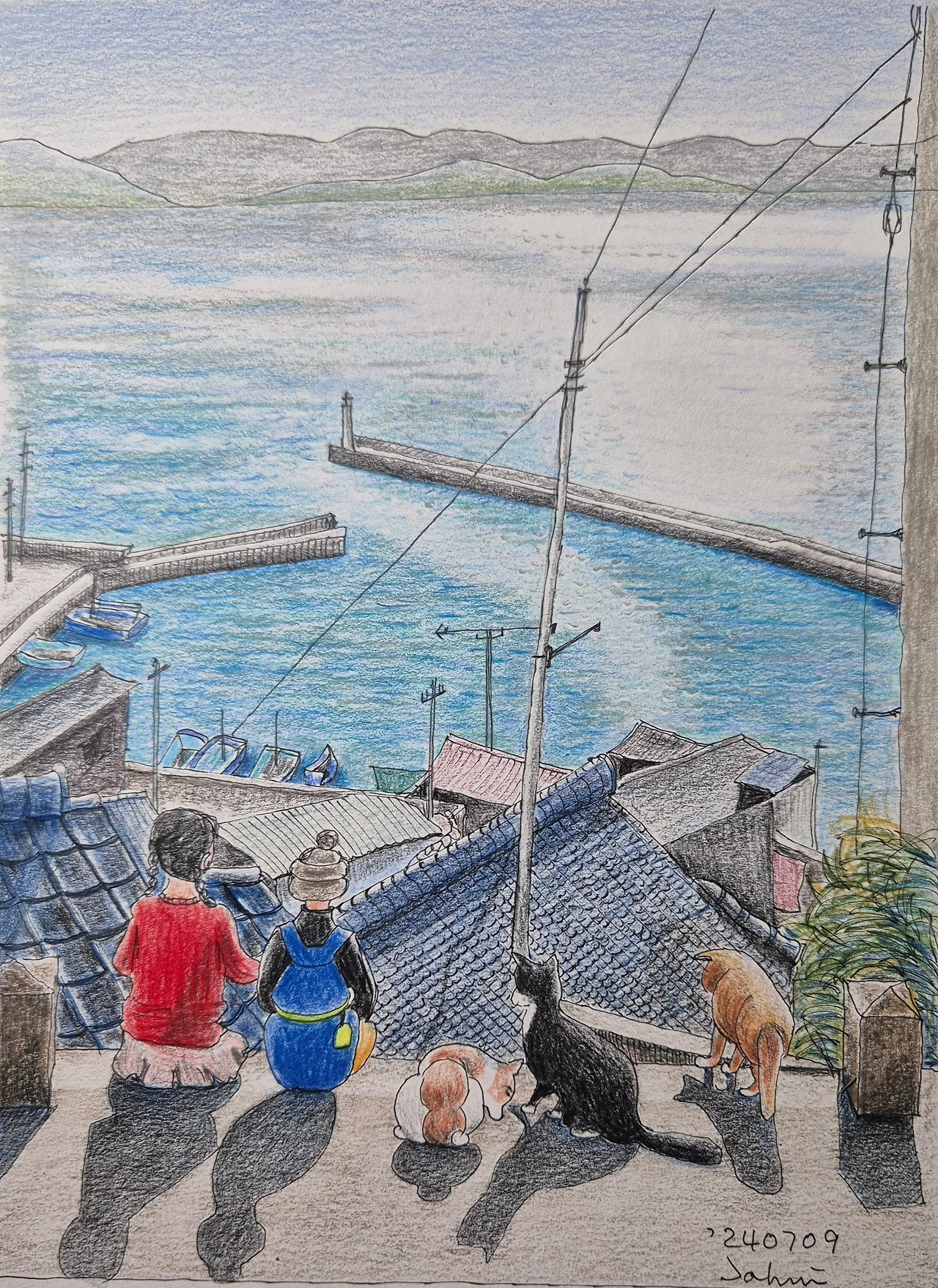 이제 생각은 그만하고 펜이 가는 대로 보이는 대로 그린다. 가까이 보이는 아이들과 고양이들, 기와지붕은 꼼꼼히, 마을로 내려갈수록 대상의 형태만 그린다. 바닷가에 정박해 있는 배들은 흉내만 내고 바다 건너 쪽 산들과 먼바다는 실루엣으로만 존재한다.