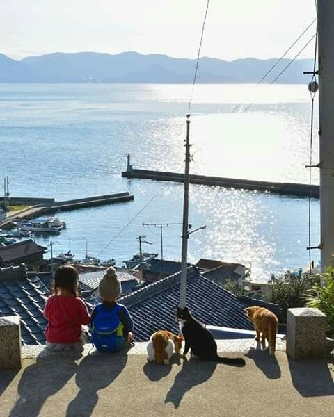 두 아이와 세 마리의 고양이들은 바다와 마을이 내려다보이는 곳에 앉아있다. 지대가 높은 것으로 보아 동네 중간쯤 되는 곳이다. 바다가 마주 보이는 언덕배기에 터전을 마련하고 있는 어느 바닷가 마을이 떠올랐다. 주황이나 파란색, 또는 하늘색의 지붕을 이고 꼬불꼬불한 골목길들이 집과 집으로 이어지는 그런 마을들. 남자아이가 털모자를 쓴 걸 보니 날이 좀 쌀쌀한 거 같다. 그 아이의 가방에는 작은 인형도 달렸다.