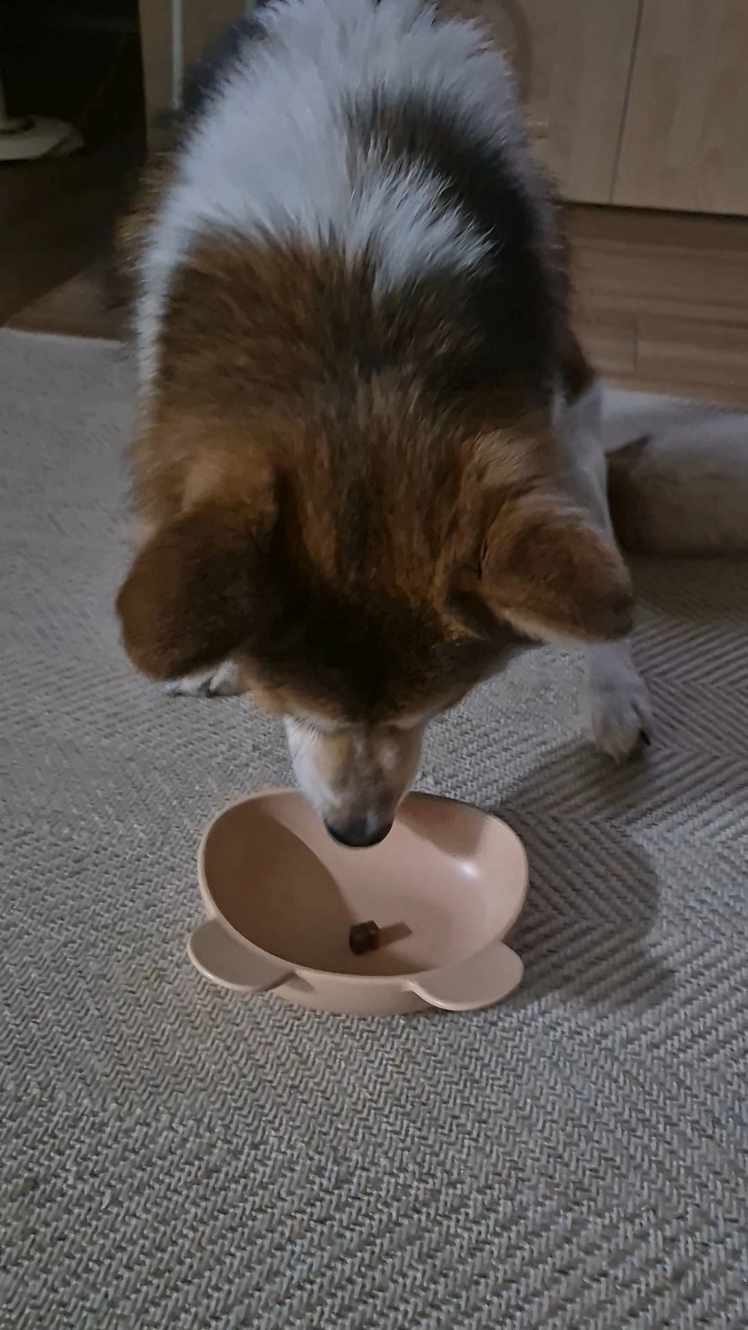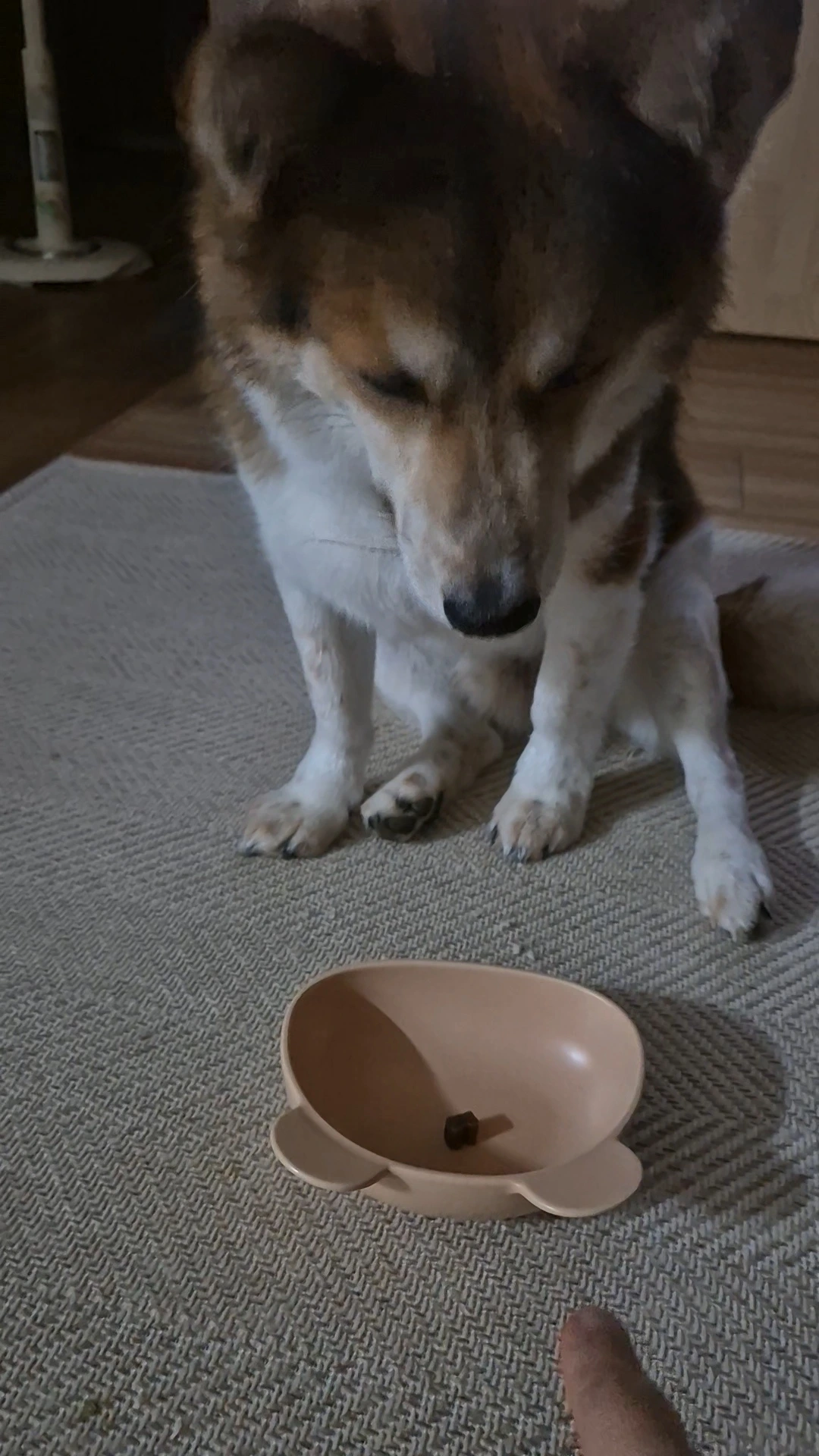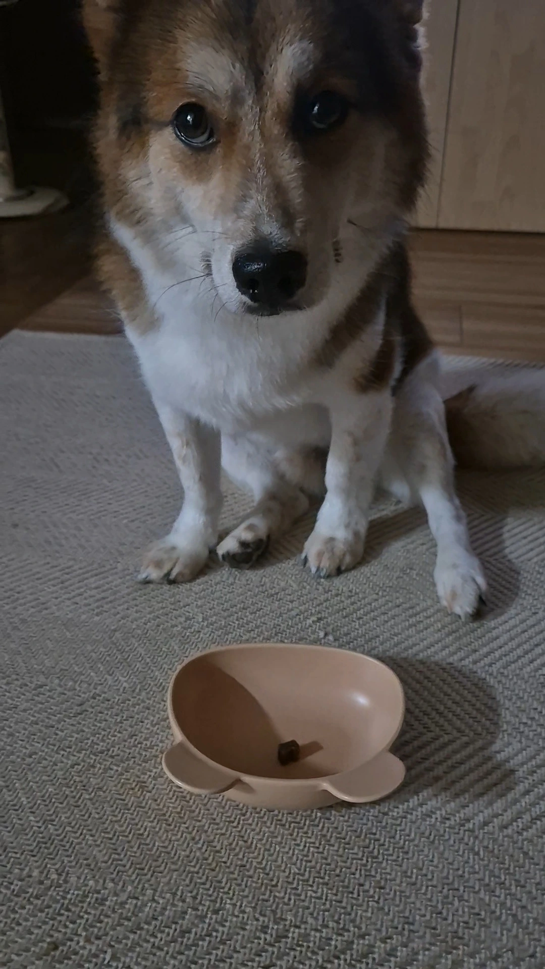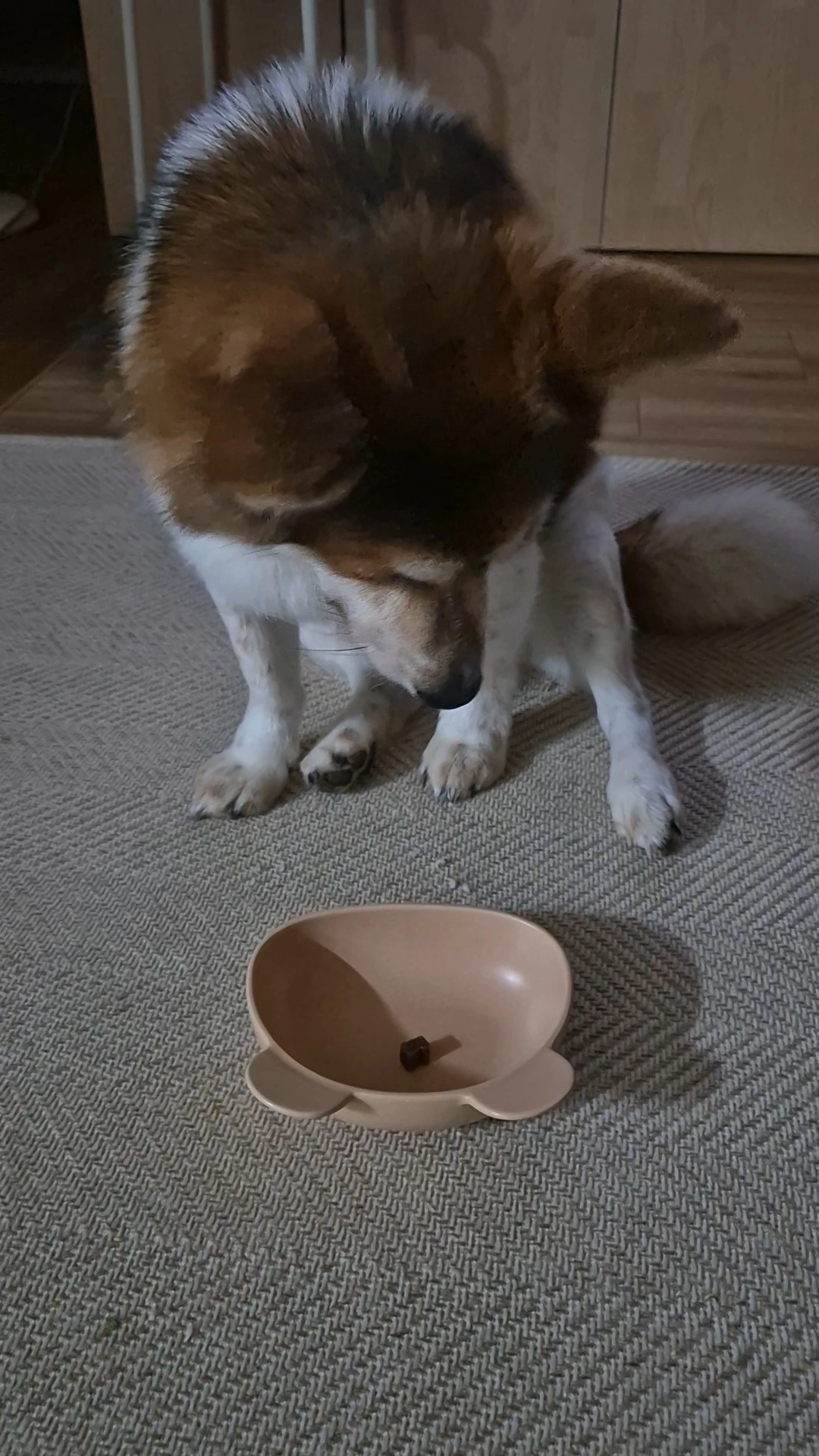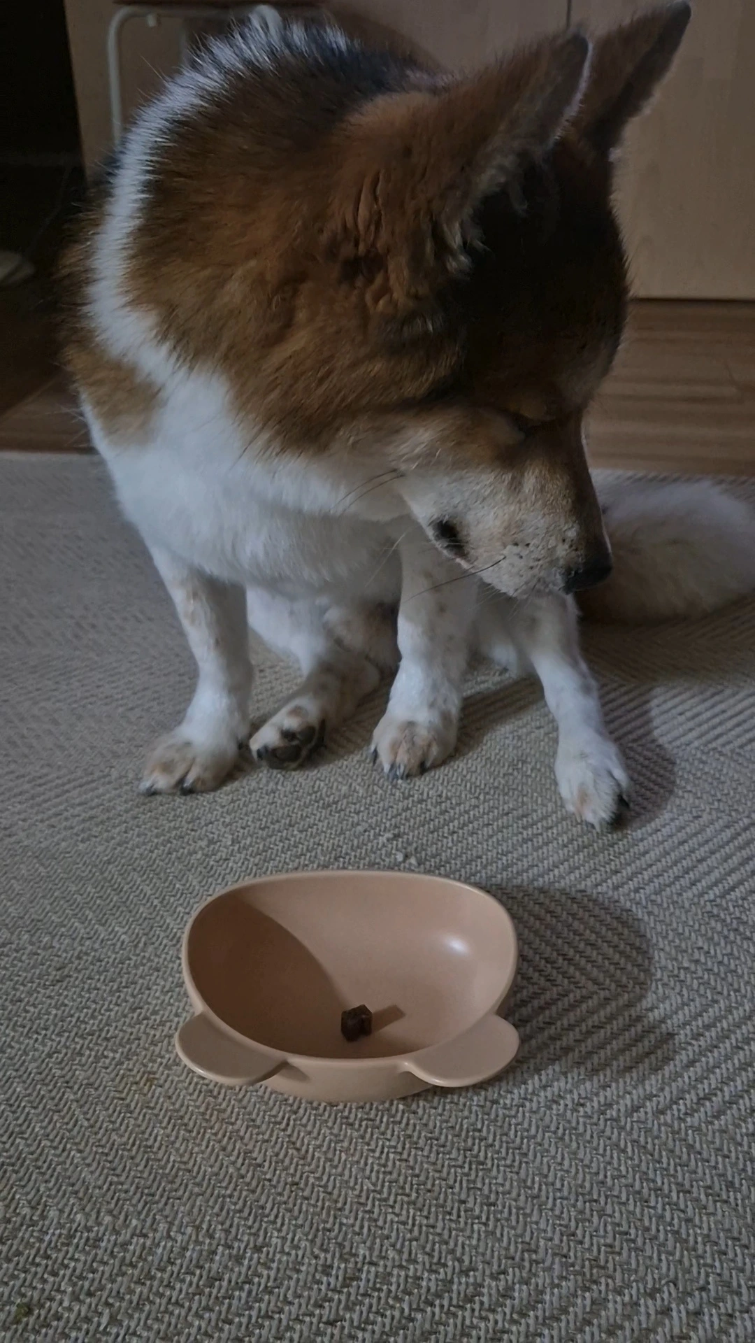 엄마가 드디어 먹으라고 말했습니다. 그런데 간식을 바로 먹지 않고 엄마를 바라봅니다. 진짜 먹어도 되나? 하고 확인하는 것 같습니다. 다시 한번 먹으라고 간식을 가리키니 간식이 아닌 엄마의 손을 봅니다.다시 먹으라고 그릇을 밀어주니 그제야 간식을 먹습니다. 한 개가 아쉬웠는지 그릇을 여러 번 핥아봅니다. 참고 기다린 투투가 대견해서 간식을 더 주었습니다.
