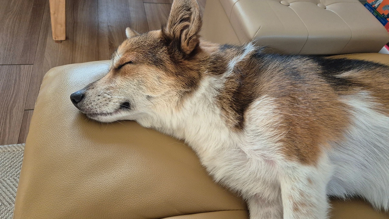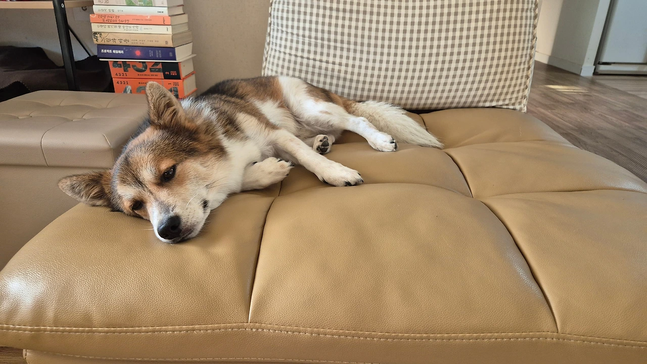 잠이 오느라 눈꺼풀은 무겁지만 엄마를 향해 공감을 표시합니다. 좋았다는 듯 꼬리를 한 번 흔들더니 툭 떨어뜨립니다. 꼬리도 무척 졸립니다. 산책 후 잠드는 투투의 모습은 집안을 평화로 가득 채웁니다. 투투가 편안해서 가족들도 집안 공기도 편안합니다.