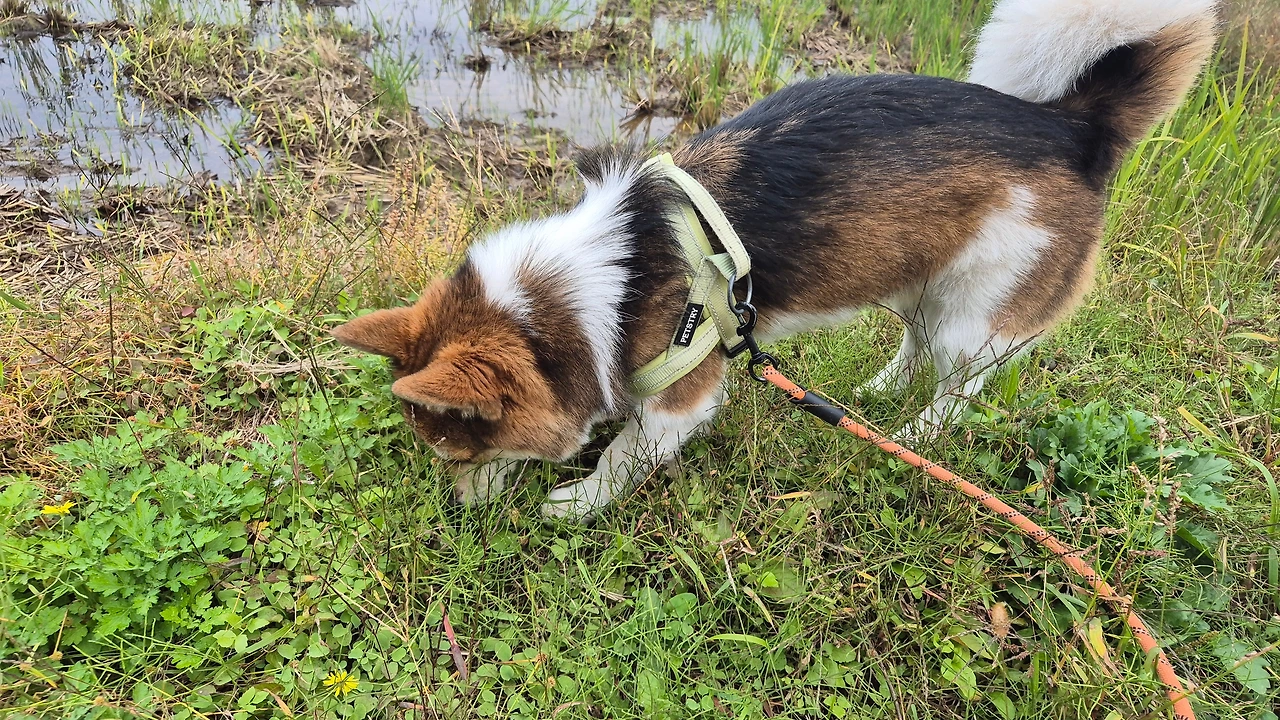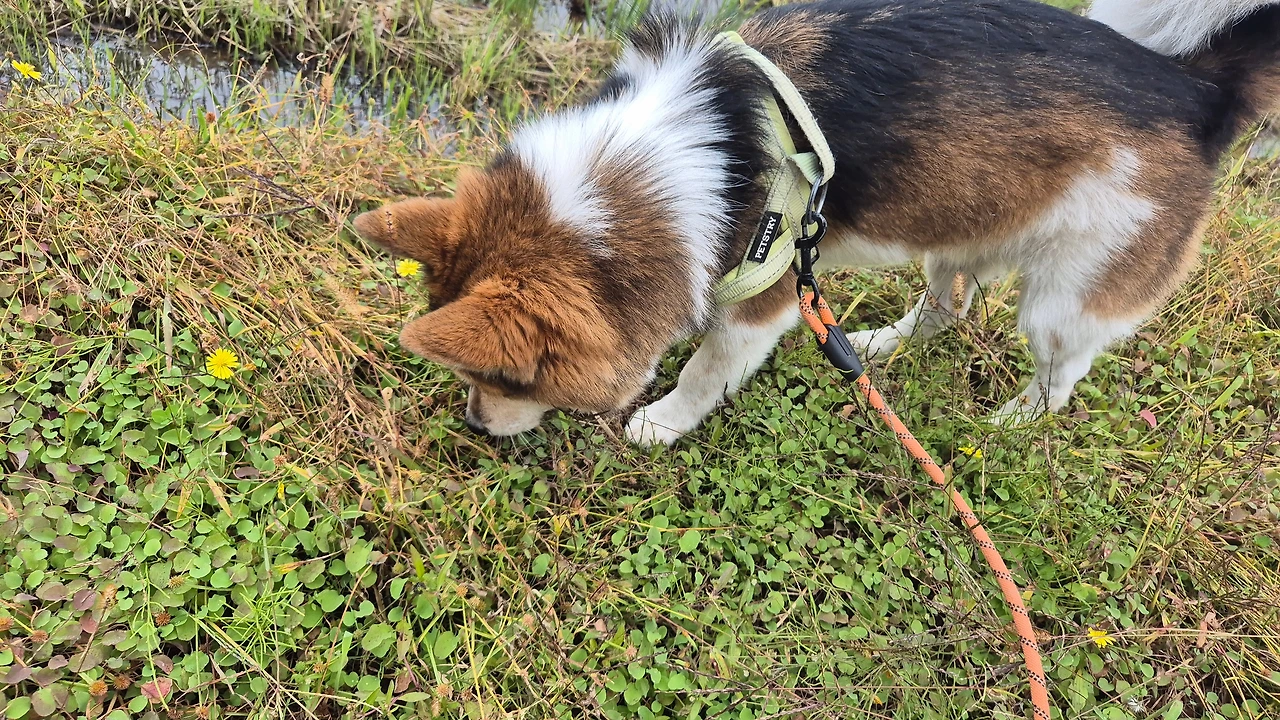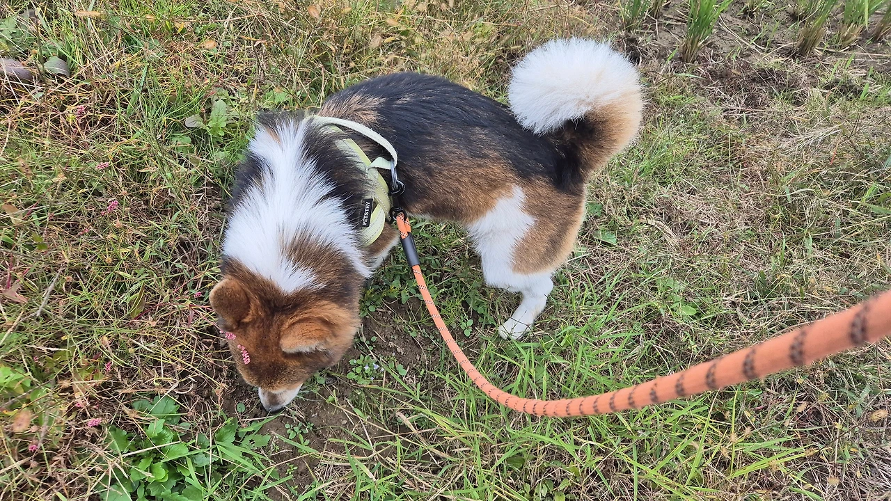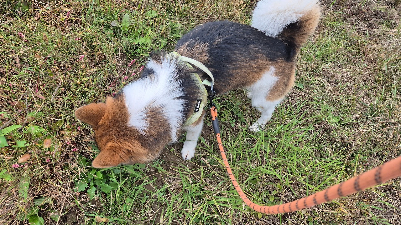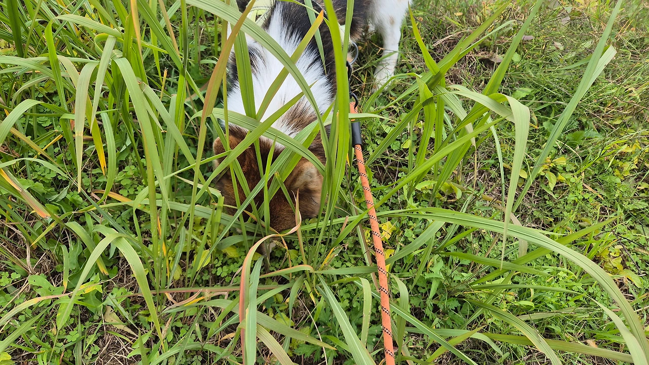 투투는 산책할 때 아스팔트로 포장된 길보다 풀이 난 곳으로 가는 걸 더 좋아합니다. 논둑길이나 길가에 풀이 난 곳으로 올라가 냄새를 맡으며 갑니다. 성인 남자를 경계하는 경향이 있어서 길에서 만난 사람을 향해 짖기도 하는데 냄새 맡기에 열중하는 날은 사람이 지나가도 관심이 없습니다. 심지어 간식을 내밀어도 모릅니다.