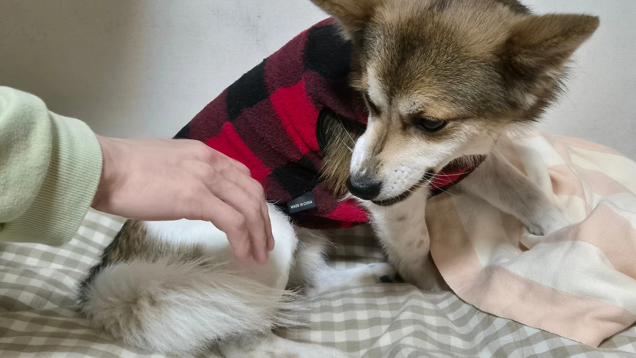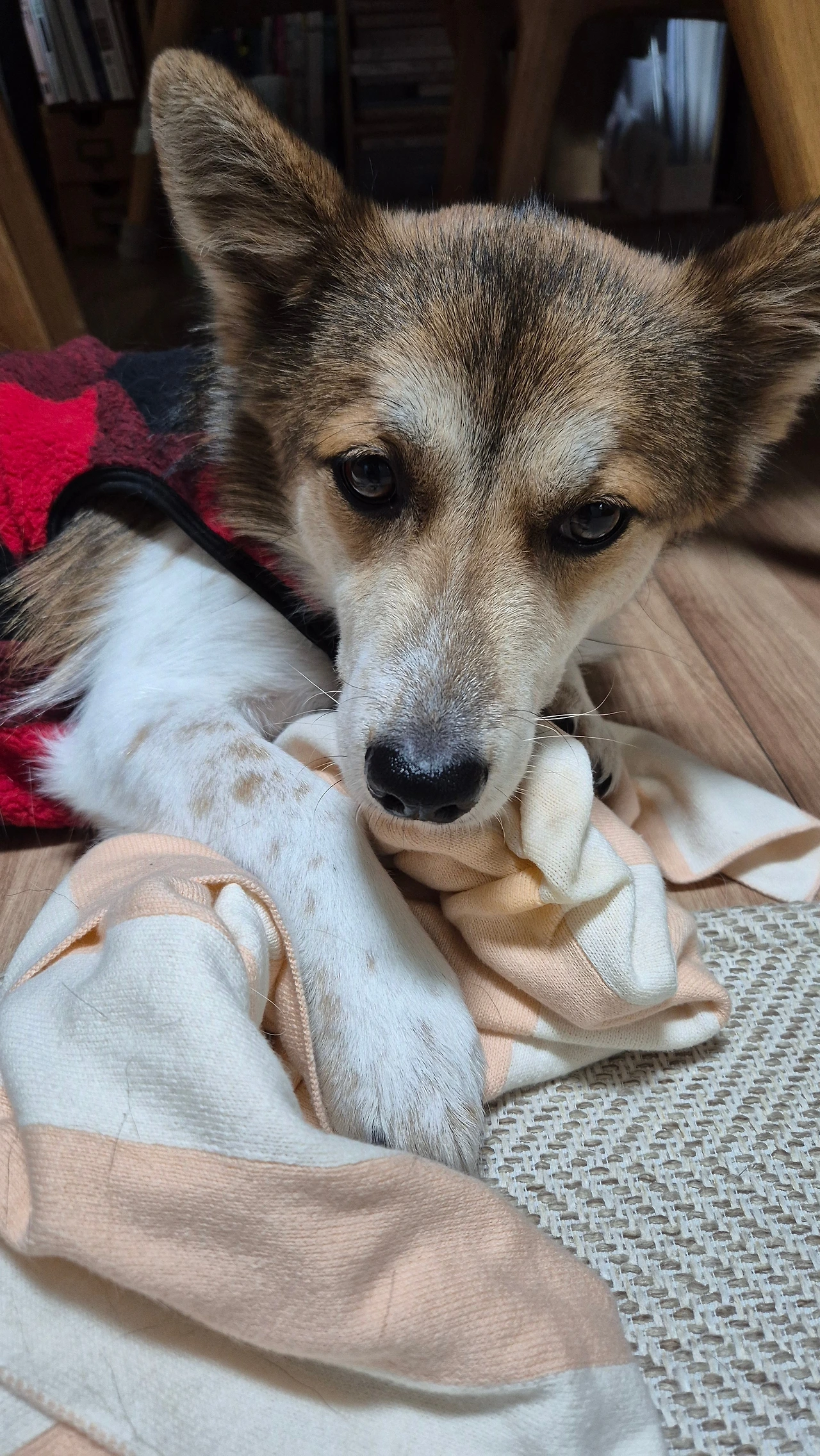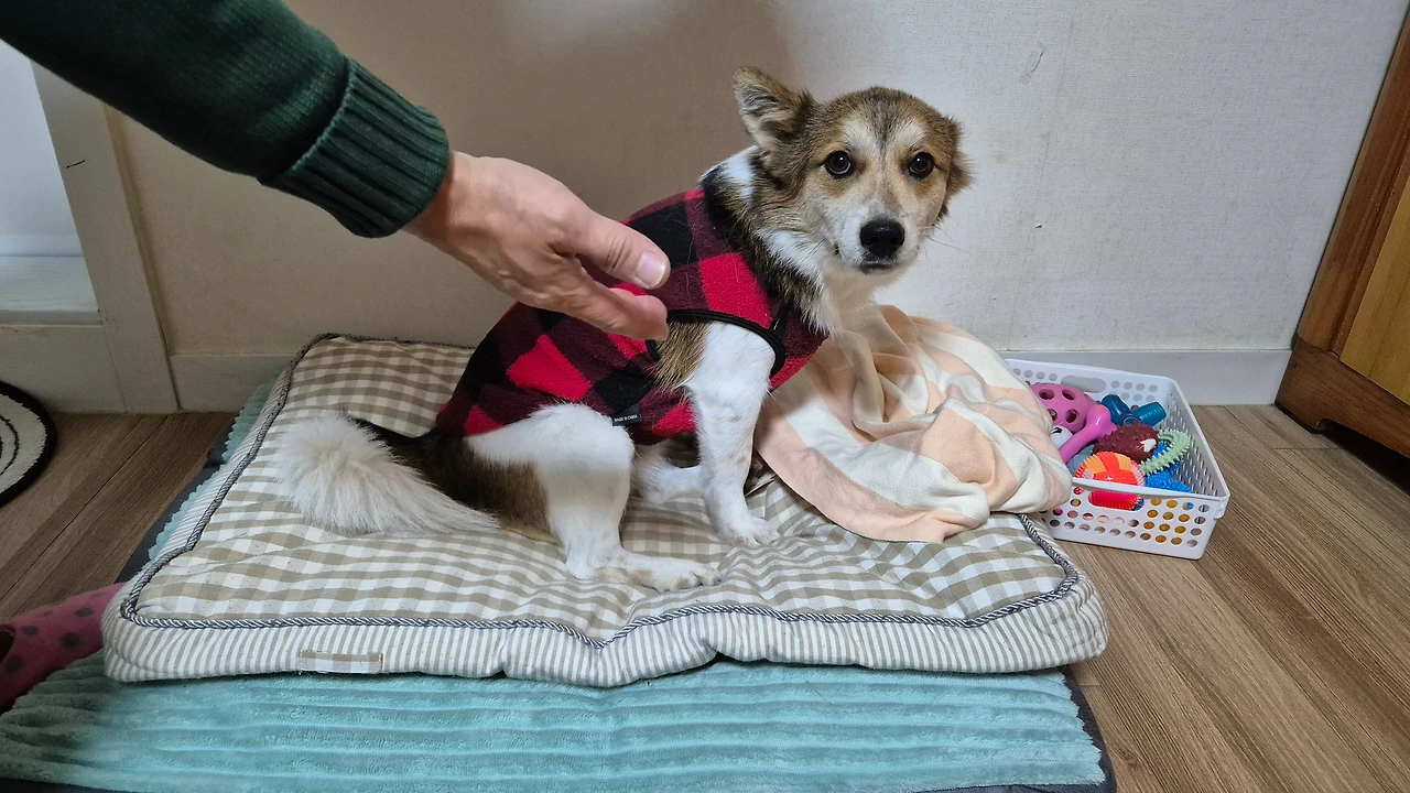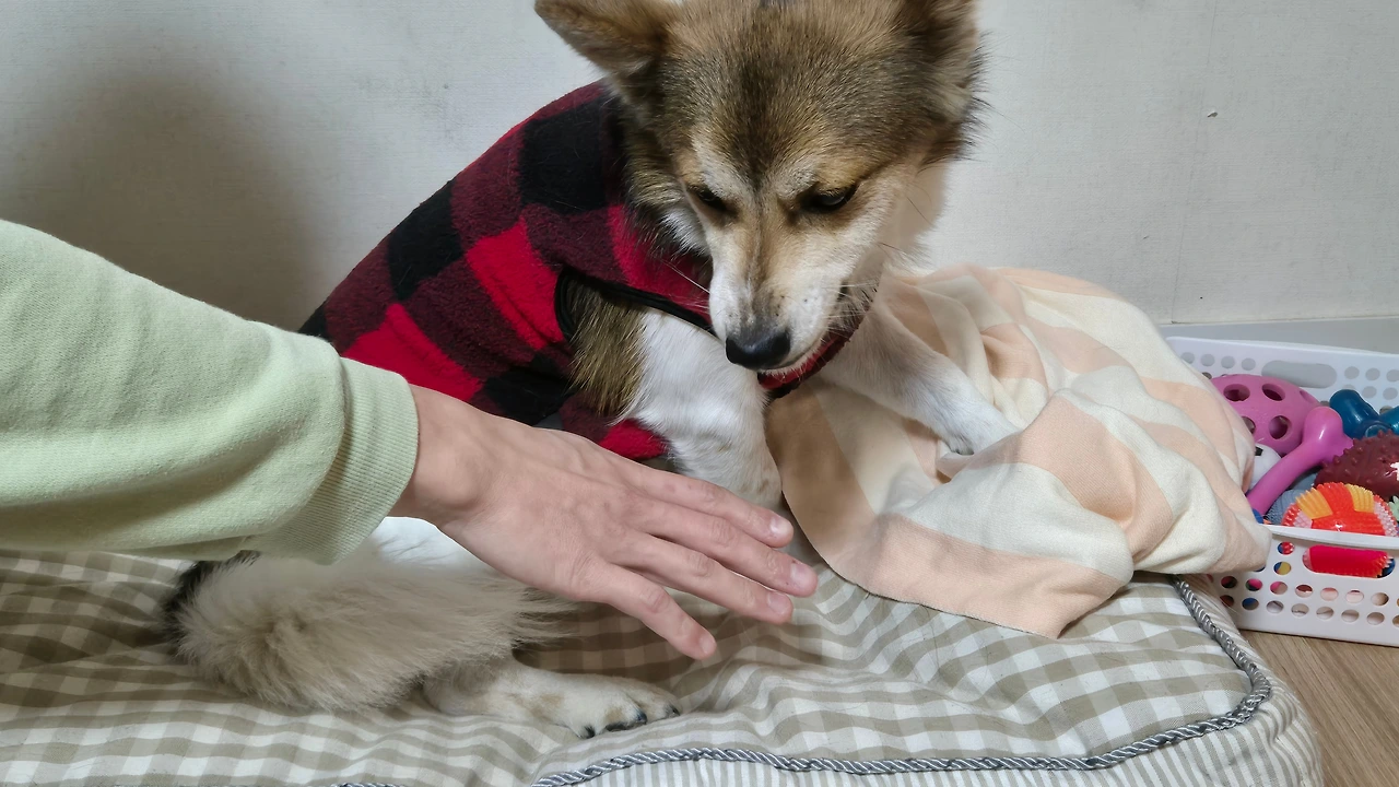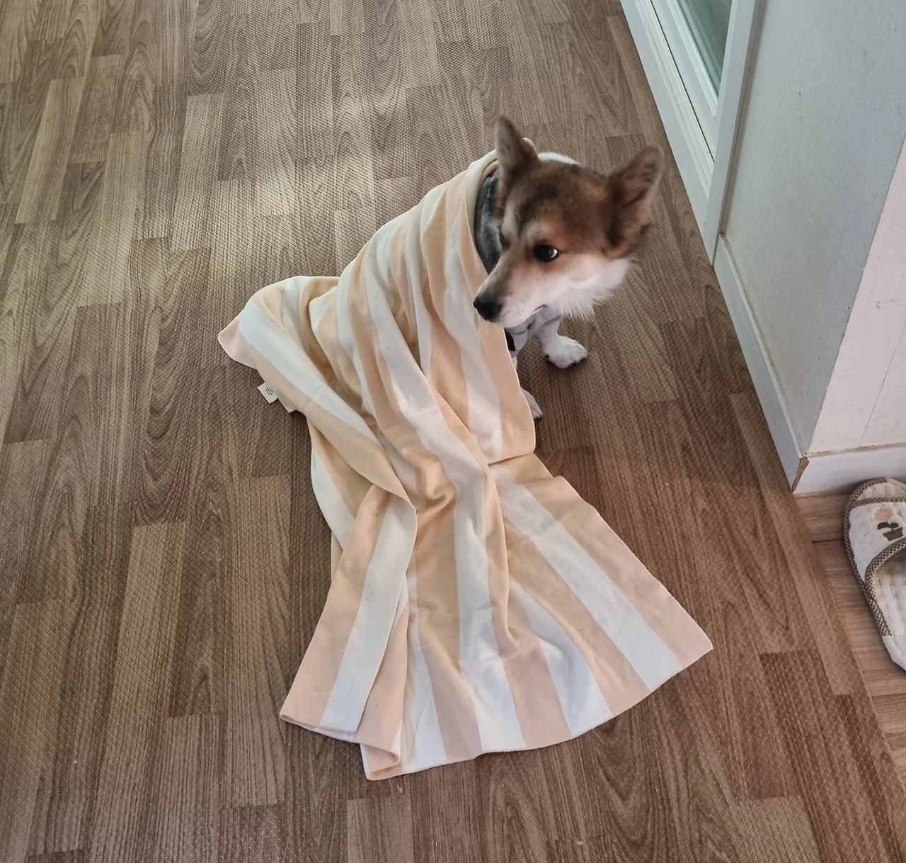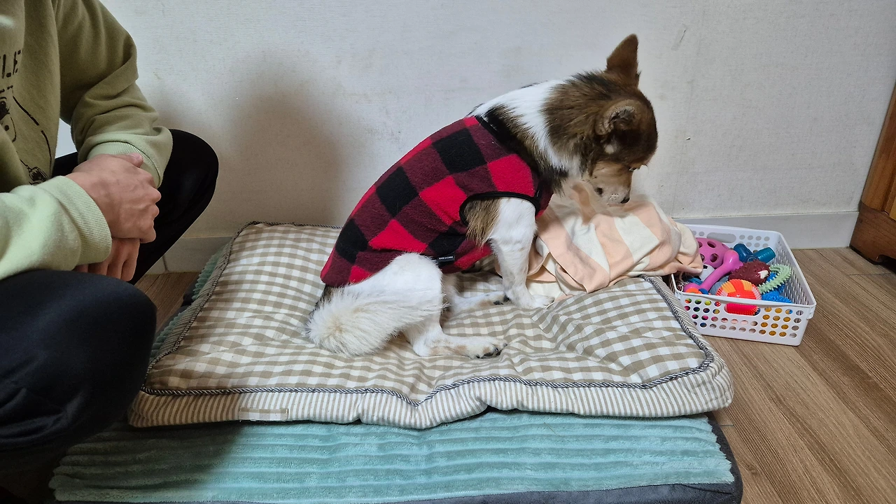 수영하러 간 엄마가 올 때가 되자 덮고 있던 담요를 두른 채 현관에 앉아 엄마를 기다리는 투투가 귀엽다며 형아가 사진을 보내왔다. 담요를 걷어가도 별다른 반응을 하지 않는다고, 착하다고 했다. 발톱도 얌전히 잘 깎고 엉덩이털 미용도 잘하는 투투. 또 하나 집착을 내려놓는 연습도 했다.