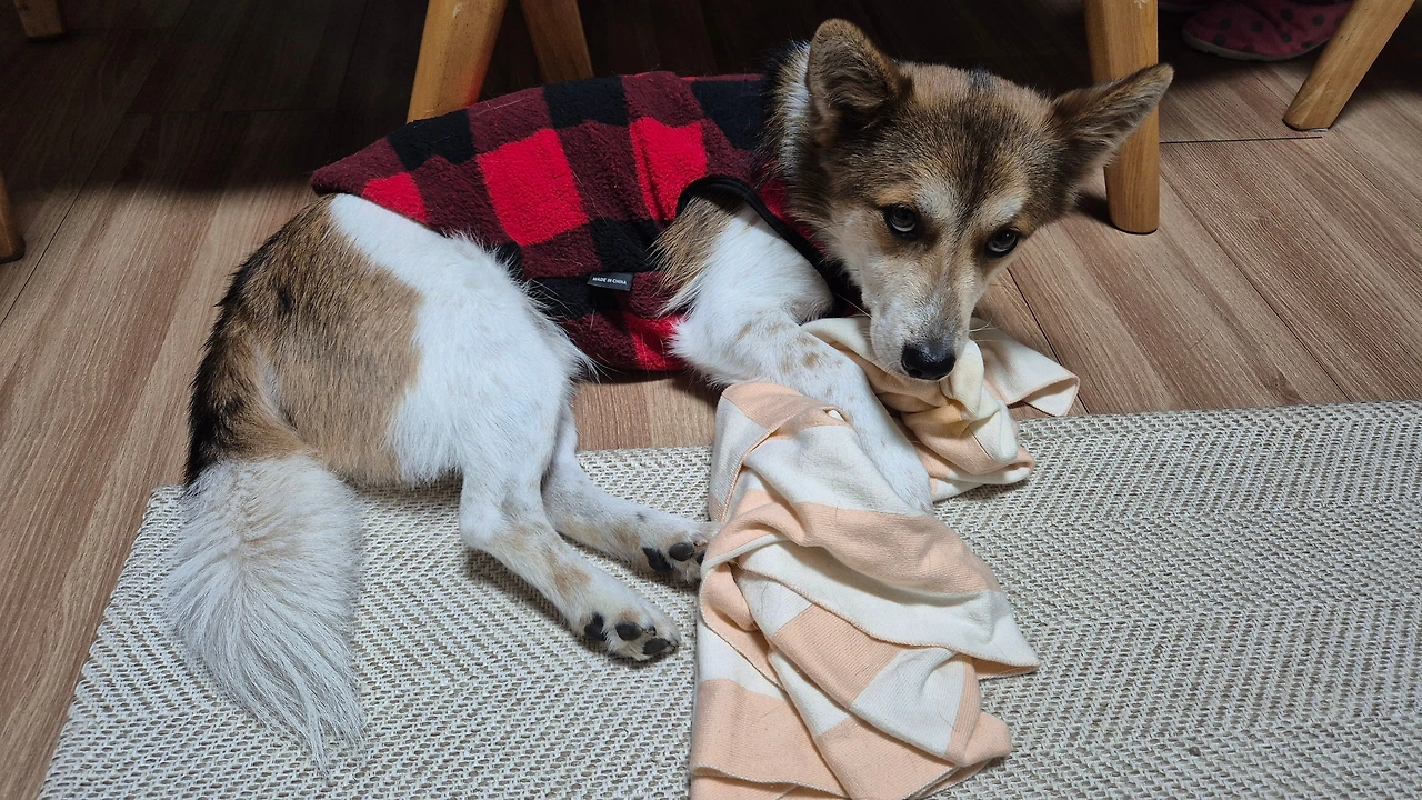 자기편을 들어준 엄마가 거실로 나가자 투투는 서둘러 담요를 물고 나가 엄마 옆에서 지키고 앉았다. 형아가 다시 어쩌나 보려고 주변에서 얼쩡거리자 낮은 소리로 "으르릉 " 경계를 했다.