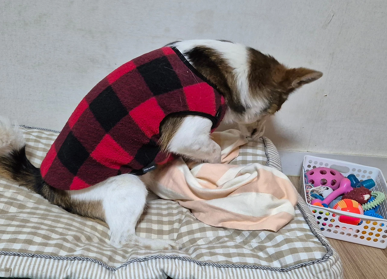 자기 전 쉬를 하고 들어 온 투투가 몸을 떨며 추워했다. 엄마가 담요를 꺼내 덮어주었고 투투는 아침까지 담요를 덮은 채 잤다. 보통은 담요를 떨쳐내 버리지만, 그날은 추위를 느꼈는지 자리이동도 없이 꼼짝없이 누워 잤다. 그 이후 투투는 담요에 대해 집착을 보였다. 새 장난감에 대한 집착은 더러 있었지만 며칠 지나면 집착이 사라지곤 했다. 이렇게 담요에 대해 소유를 주장하는 모습은 처음이다.