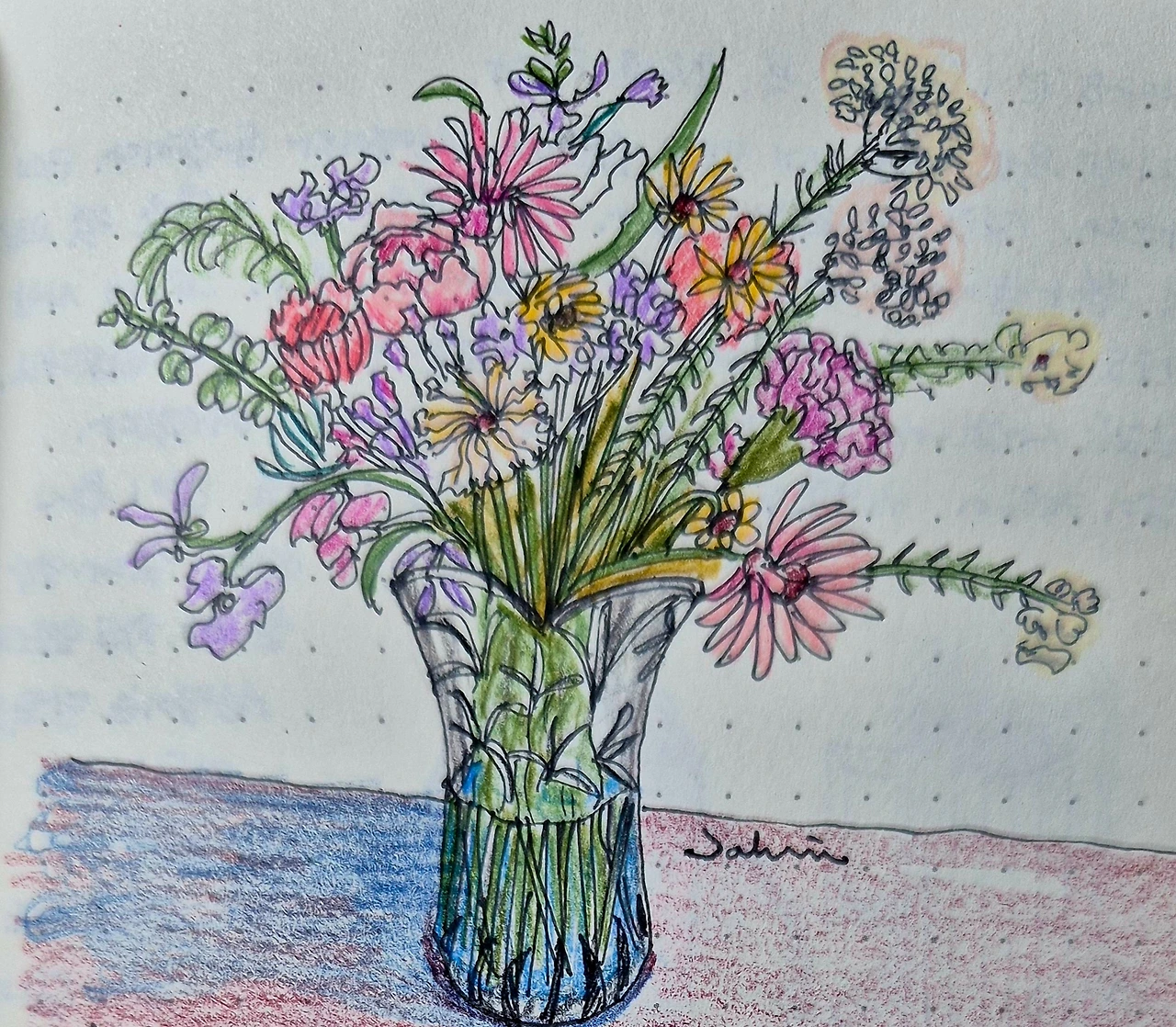 와인, 치즈, 떡볶이, 이혼해!, 웃음, 멋진 부엌 식탁에 놓인 꽃 한 다발과 부드럽게 쏟아지던 햇살에 뭉쳐있던 마음이 풀어지고 하수인 나는 그만 행복해졌다. 집에 와 꽃을 그리니 와인향과 꽃향이 다시 맴돌았다. 하수인척 하는 우리 집 고수님이 예쁘다고 했다. 근심으로 가득 차 있던 나는 꽃다발과 햇살과 대낮 와인에 홀랑 넘어가 웃었다. 틀림없는 하수다.