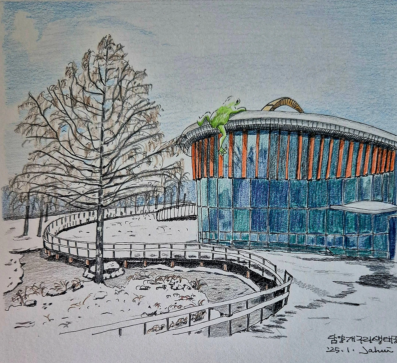 눈이 연일 내려 온통 눈세상이다. 개구리가 기어오르는 생태공원을 눈이 내리는 와중에 즐겁게 그렸다. 다시 담양을 향할 땐 이 생태공원에 꼭 가 봐야겠다. 건물을 오르는 저 개구리를 현장에서 다시 그리고 싶다.