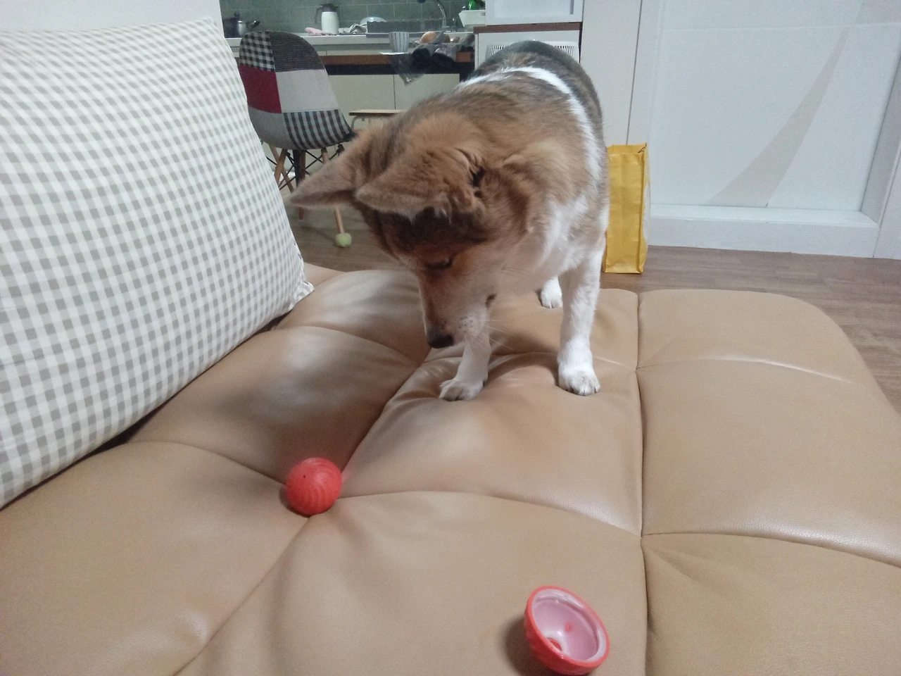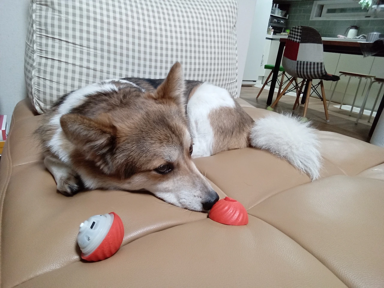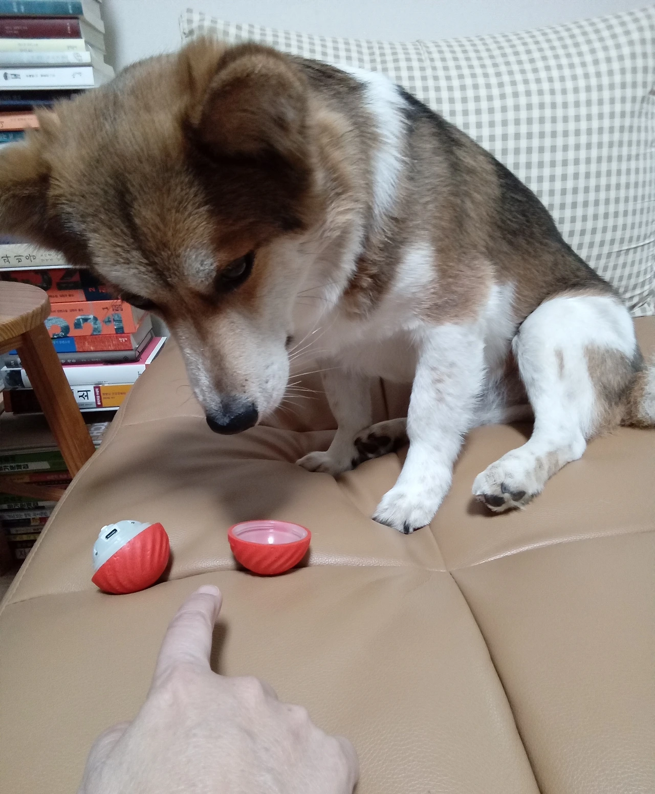 한 10분 놀았을까. 투투는 이제 공을 지키기 시작했다. 새 장난감을 주면 한동안은 장난감을 지키느라 간식이 코 앞에 있어도 먹지 않는다. 누구든지 공을 건드리면 가만두지 않겠다는 눈이다. 버튼을 어떻게 눌렀는지 공은 멈춰 버렸다.