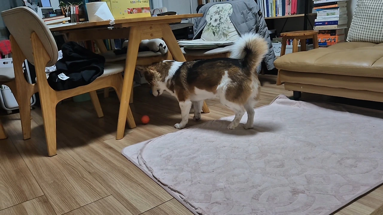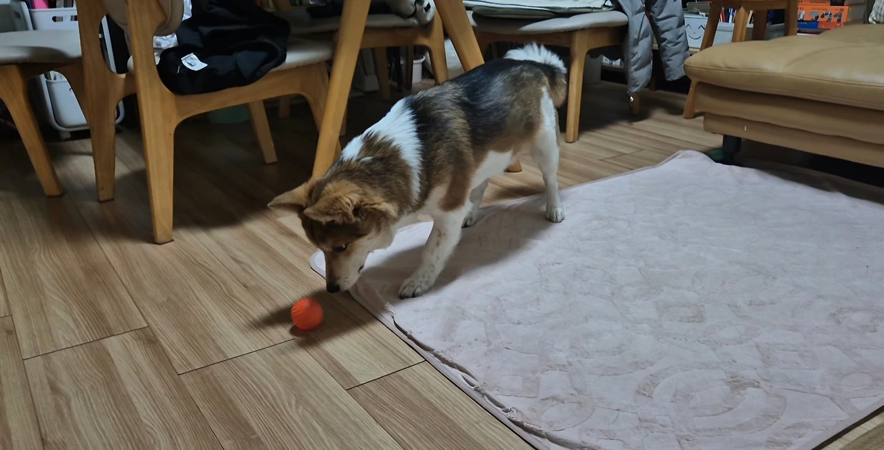 소리와 함께 공은 오발탄이 되어 마구 굴렀다. 겁을 낼 줄 알았던 투투는 의외로 흥분하여 신나게 공을 쫓아다녔다. 신났다.
