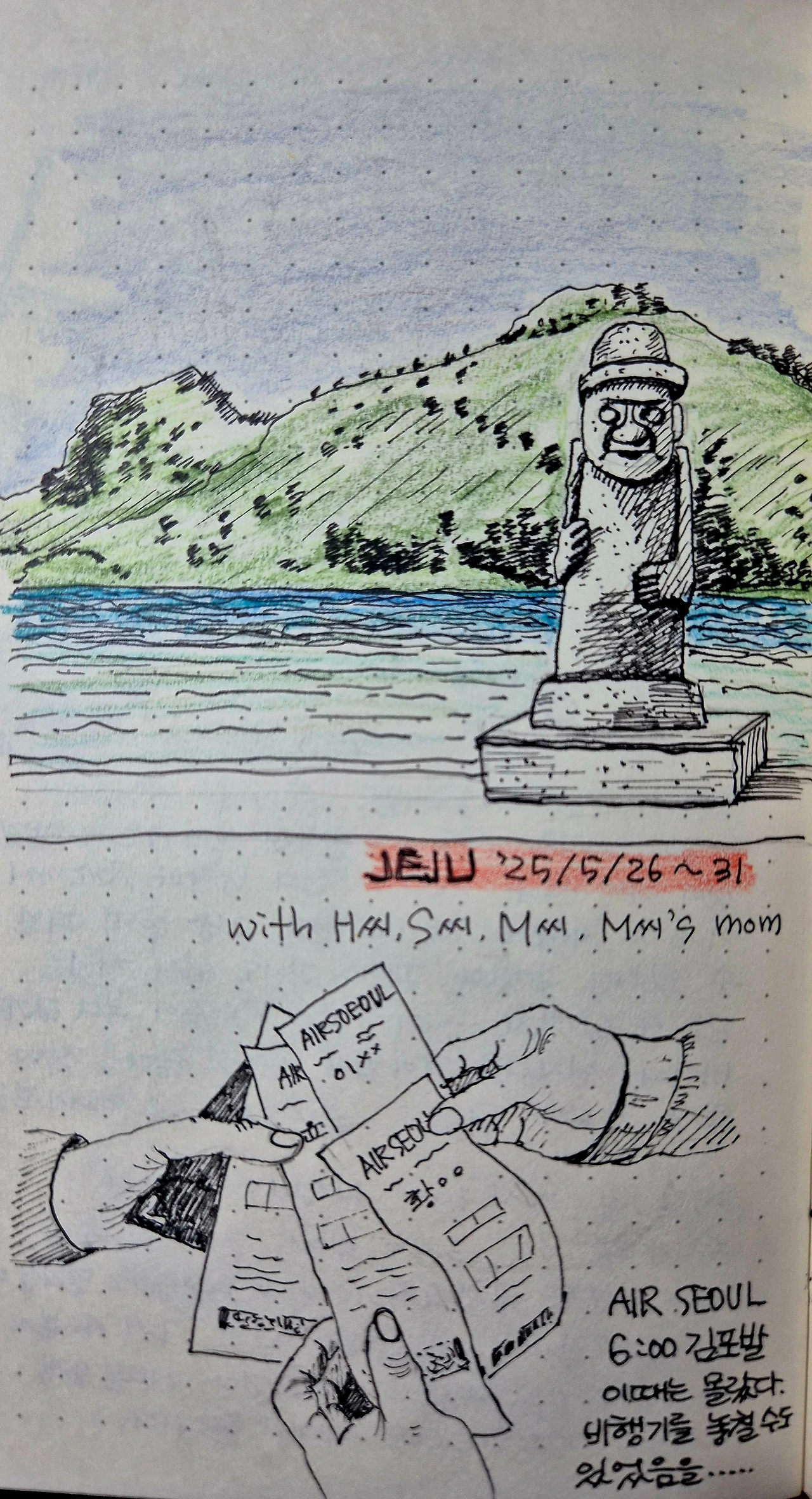 그러나 6시에 출발할 비행기는 6시 24분에 이륙했다. 짐만 싣고 비행기는 타지 않은 일부 승객들이 짐을 빼겠다고 한 이유 때문이었다. 허, 참 그럴 수도 있구나, 생각하는데 몇몇 승객들이 거칠고 무례하게 승무원에게 항의했다. 항의하는 데에도 지켜야 할 것이 있거늘 도대체 왜들 목소리가 그리 큰 것인지.... 이어폰을 끼고 눈을 감아버렸다. 제주에 도착하니 7시 24분. 하늘은 조금 흐렸지만 날씨는 괜찮았다.