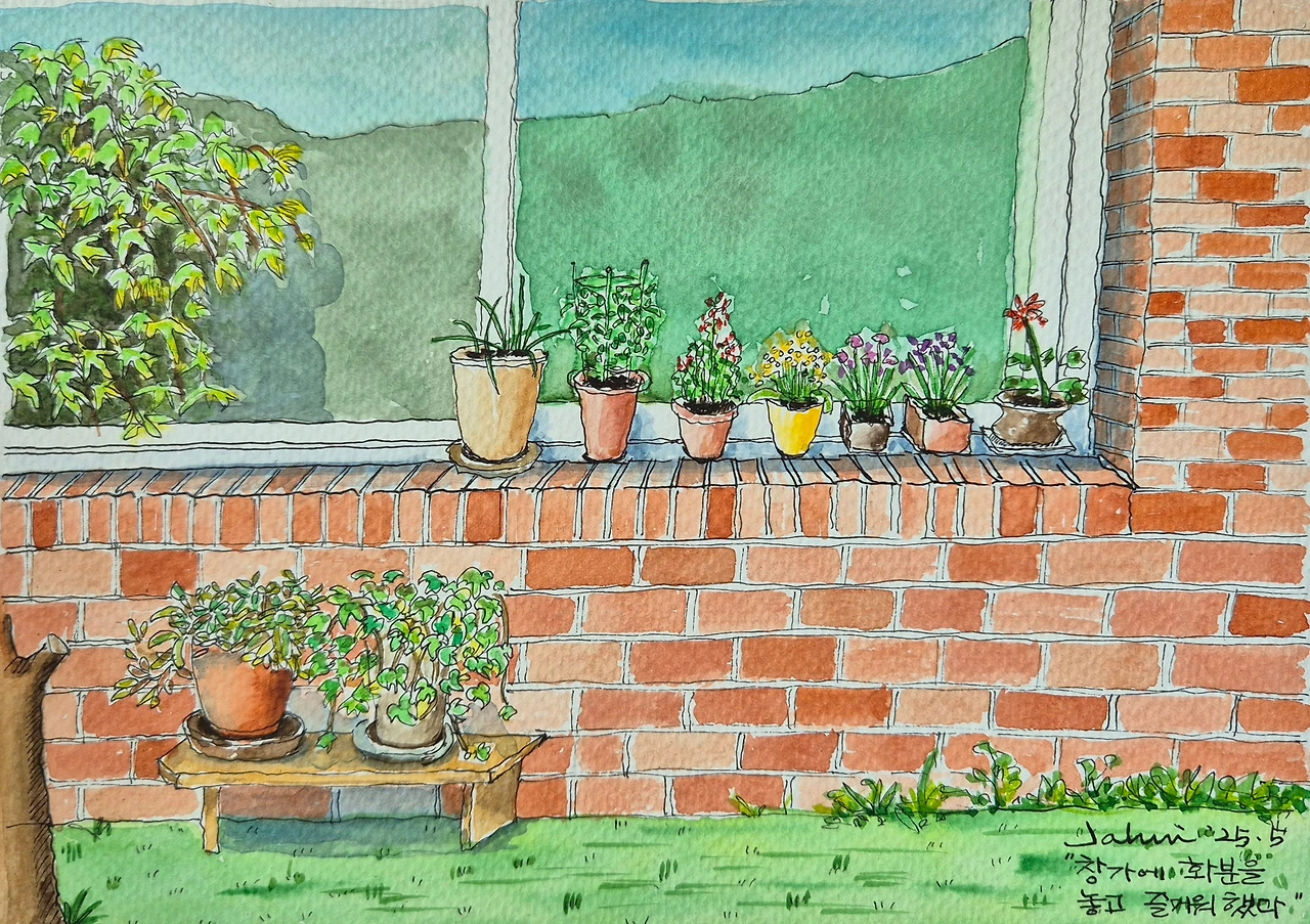 화분이 놓인 창가가 예뻐서 펜을 꺼냈다. 요즘은 만년필 특유의 사각거림에 끌려 만년필 드로잉을 자주 한다. 창에 비친 앞산의 실루엣과 하늘이 선명하다. 그림을 그리는 동안 스멀스멀 올라오는 욕심과 불안이 특유의 탄성력으로 다시 떠오르다가 사라졌다. 찰박거리는 물소리를 들으며 수영할 때 일어나는 몰입의 자유를 느꼈다. 남편에게 보이니 벽돌이 예쁘다 한다. 벽돌이? 그럴 땐 잘 그렸다~ 하는 겁니다. 그 소리 들으려고 남에게 보이는 거니깐~. ㅎㅎ 그래? 자~알 그렸소. ㅋ 고맙소~.