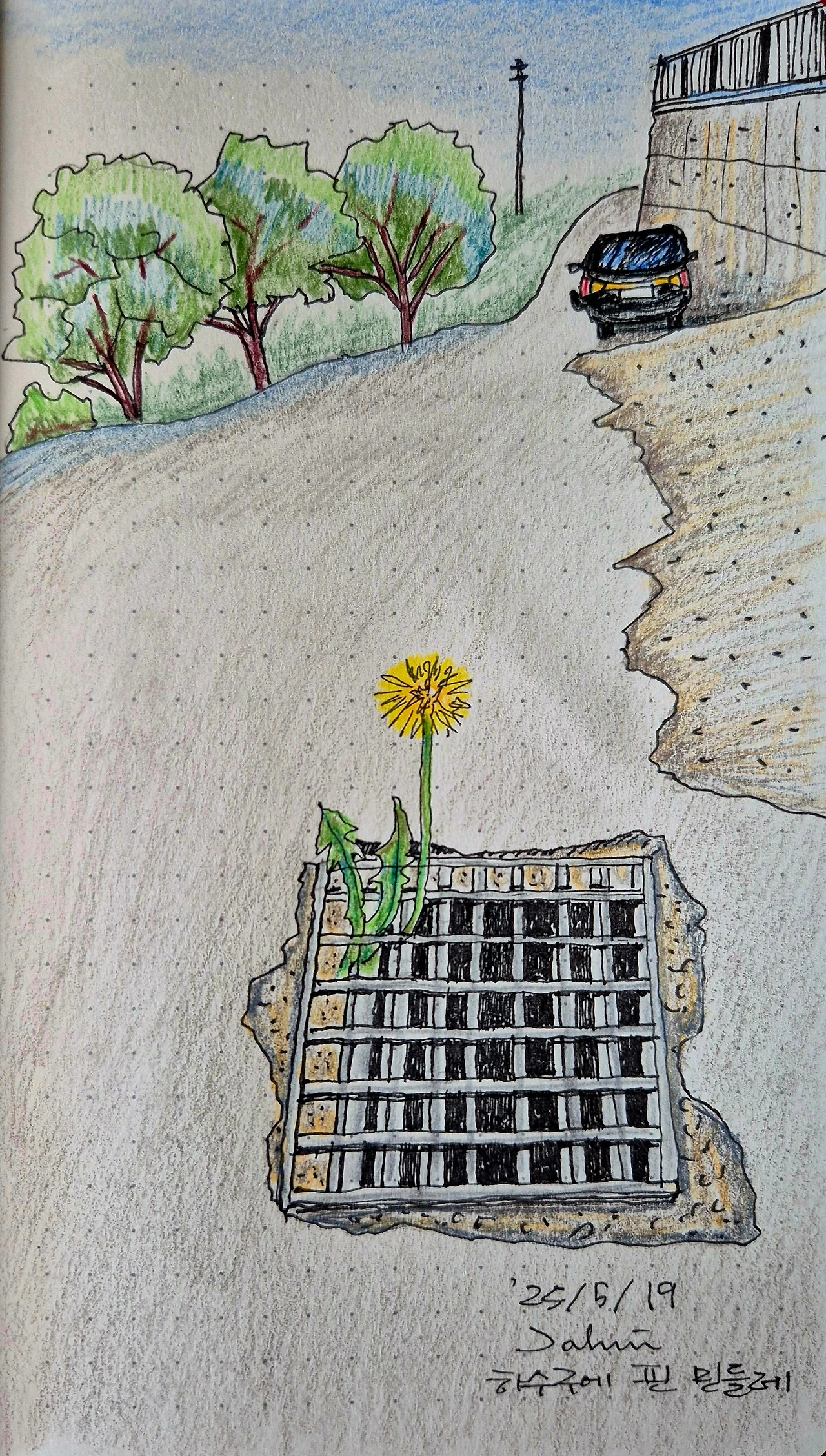 아침 산책길, 도로 가운데 설치된 하수구 안쪽에서 피어 난 민들레꽃 한 송이를 보았다. 꽃이 벌어진 지 단 몇 초도 안 된 것처럼 깨끗하고 장한 민들레였다. 하수구 안 쪽에서 고개를 세우고 있는 민들레꽃은 매우 크고 당당에서 차마 범하기 어려웠다.