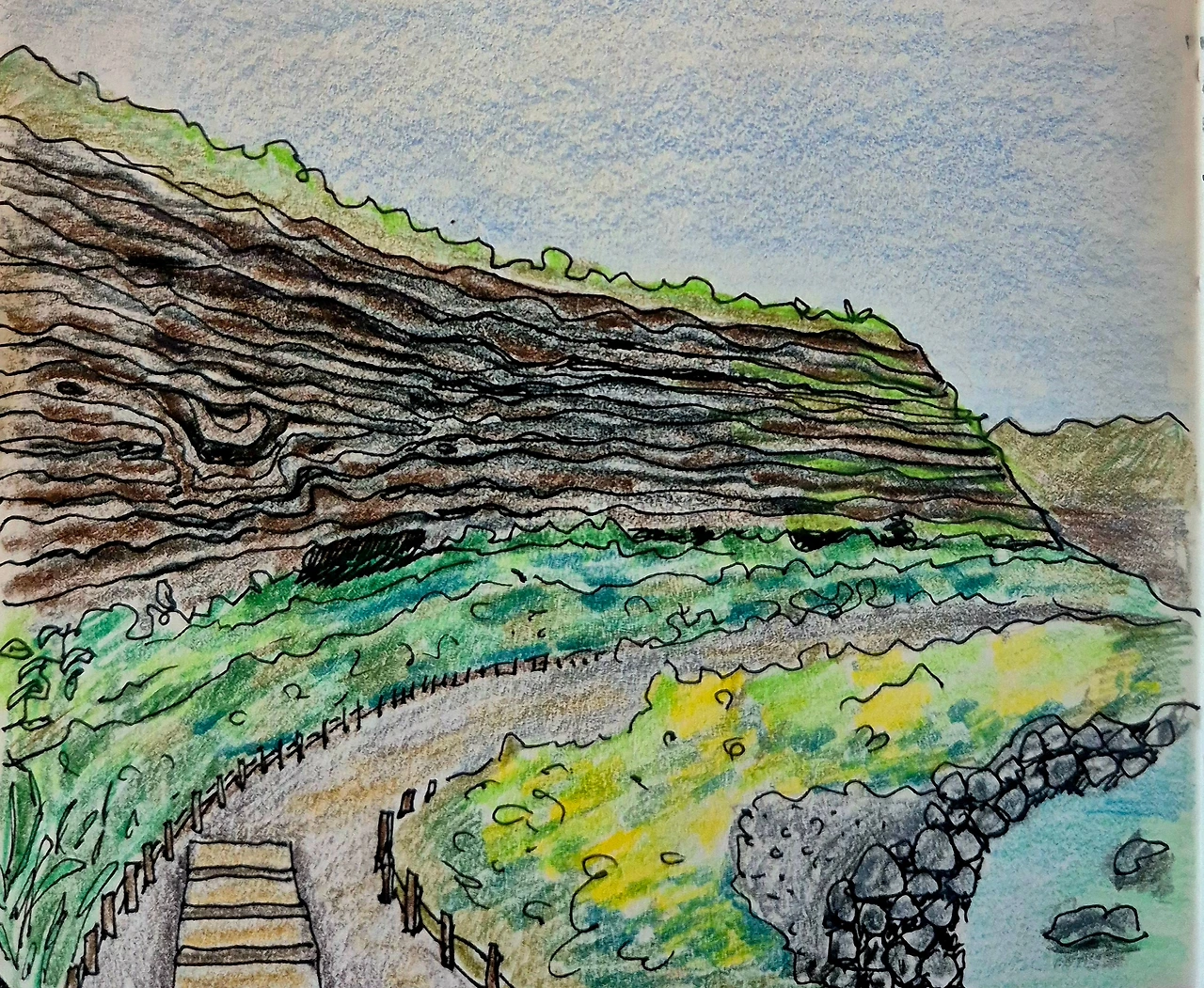 절벽 아래 조성된 길을 따라 지질트레일이 펼쳐져 있는데 쉽게 볼 수 없는 풍경이라 그런지 매우 인상적이었다. 이름 모를 노란 꽃들이 무리 지어 피었고 잎들은 모두 도톰한 것이 제주 바람의 영향인 것 같았다. 거뭇거뭇 바다에 잠긴 현무암에 옥빛 파도가 일렁였다. 비통한 지난 역사는 이곳에서도 보였다. 과거 일제 강점기 때 일제가 벙커로 사용한 흔적이 보였는데 지질 트레일 맨 아래층에 동굴로 남아 있었다. 족히 예닐곱 개는 되었고 어떤 벙커는 매우 커서 1개 소대가 상주할 수 있을 만큼 크고 넓었다. 벙커들이 처음엔 몹시 언짢고 슬펐지만 그 역시 피할 수 없는 지질트레일의 역사이고 일부라고 생각했다.