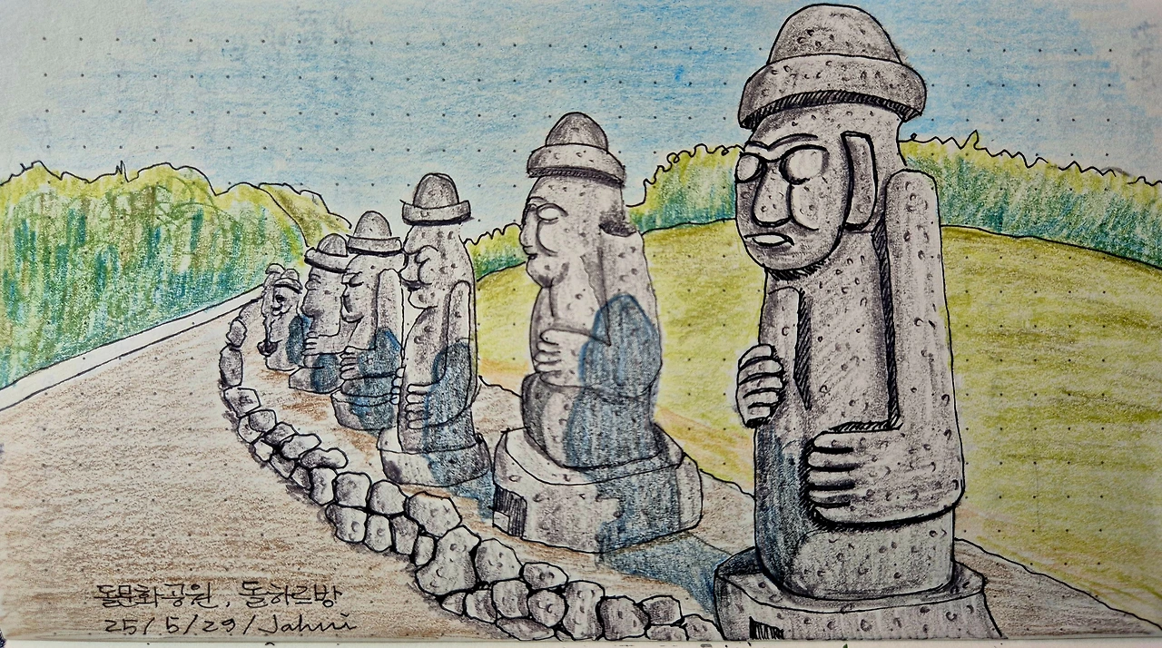 돌문화공원은 교육적으로도 훌륭한 장소였다. 각종 돌 조형물과 거석을 배치한 공원은 오름 앞에 자리 잡고 있어서 그 자체가 하나의 자연이었다. 인위적인 것들을 최대한 배제한 모습이 마음에 들었다. 하늘 연못이라는 인공 연못 주변으로 인스타용 인생샷을 찍기 위해 사람들이 줄을 서고 있었지만 우리는 웃으며 지나갔다. 넓은 잔디 마당과 계절마다 달리하는 꽃들을 조성해 놓아서 산책하기에도 그만이다. 눈 가는 곳마다 수국이 한창이었다.