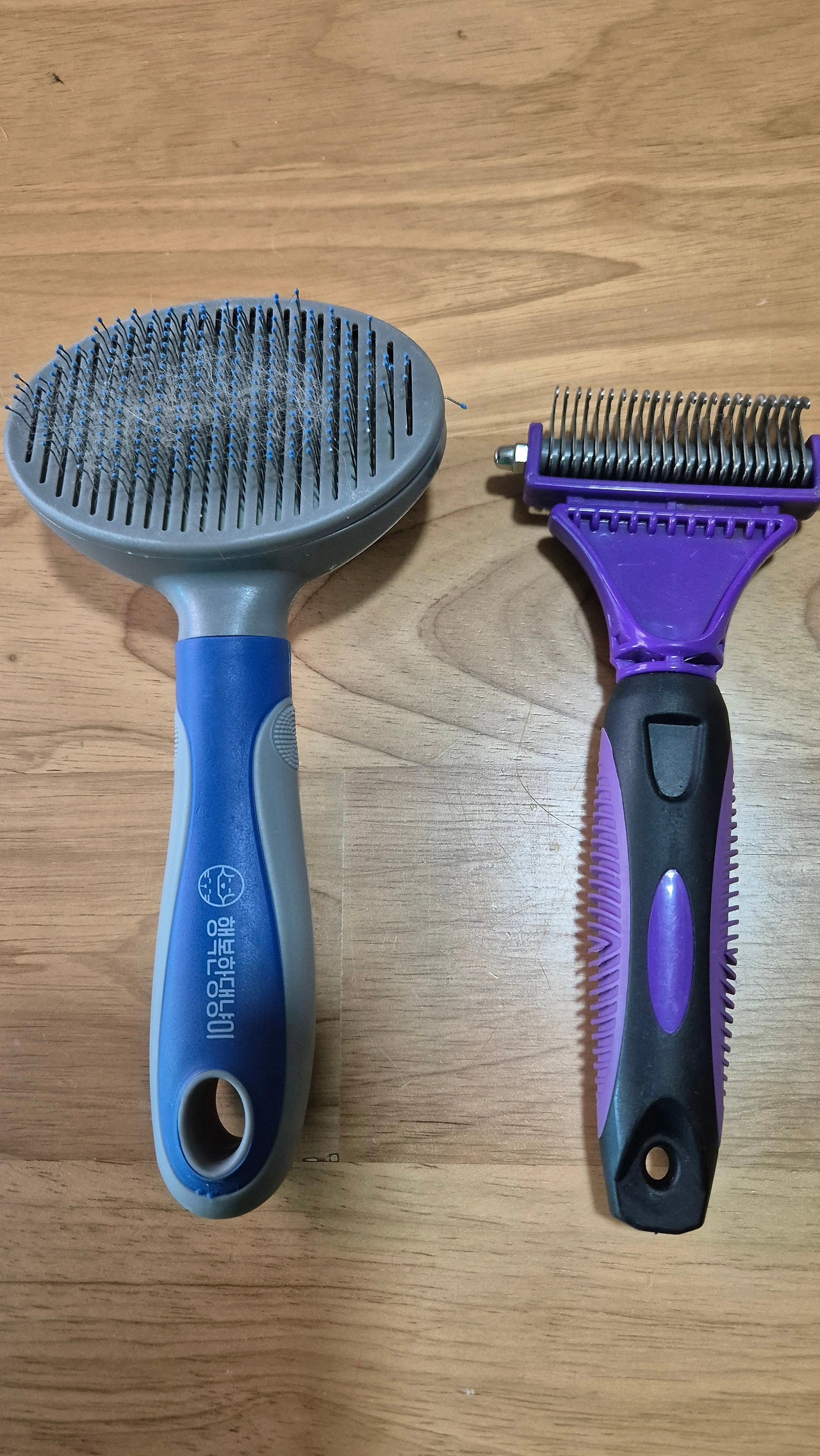 여러 번의 아이템을 거쳐 정착한 두 개의 빗입니다. 그런데 투투는 보라색 빗을 싫어하고 파란색 빗은 그나마 협조를 잘 합니다. 보라색 빗으로 빗을 때마다 근육이 움찔움찔하며 도망을 가곤 합니다. 엄마의 입장에서는 보라색 빗이 아주 편하고 속이 시원할 정도로 빗겨져서 선호하는데 투투가 싫어하니 잘 쓰지 않습니다.