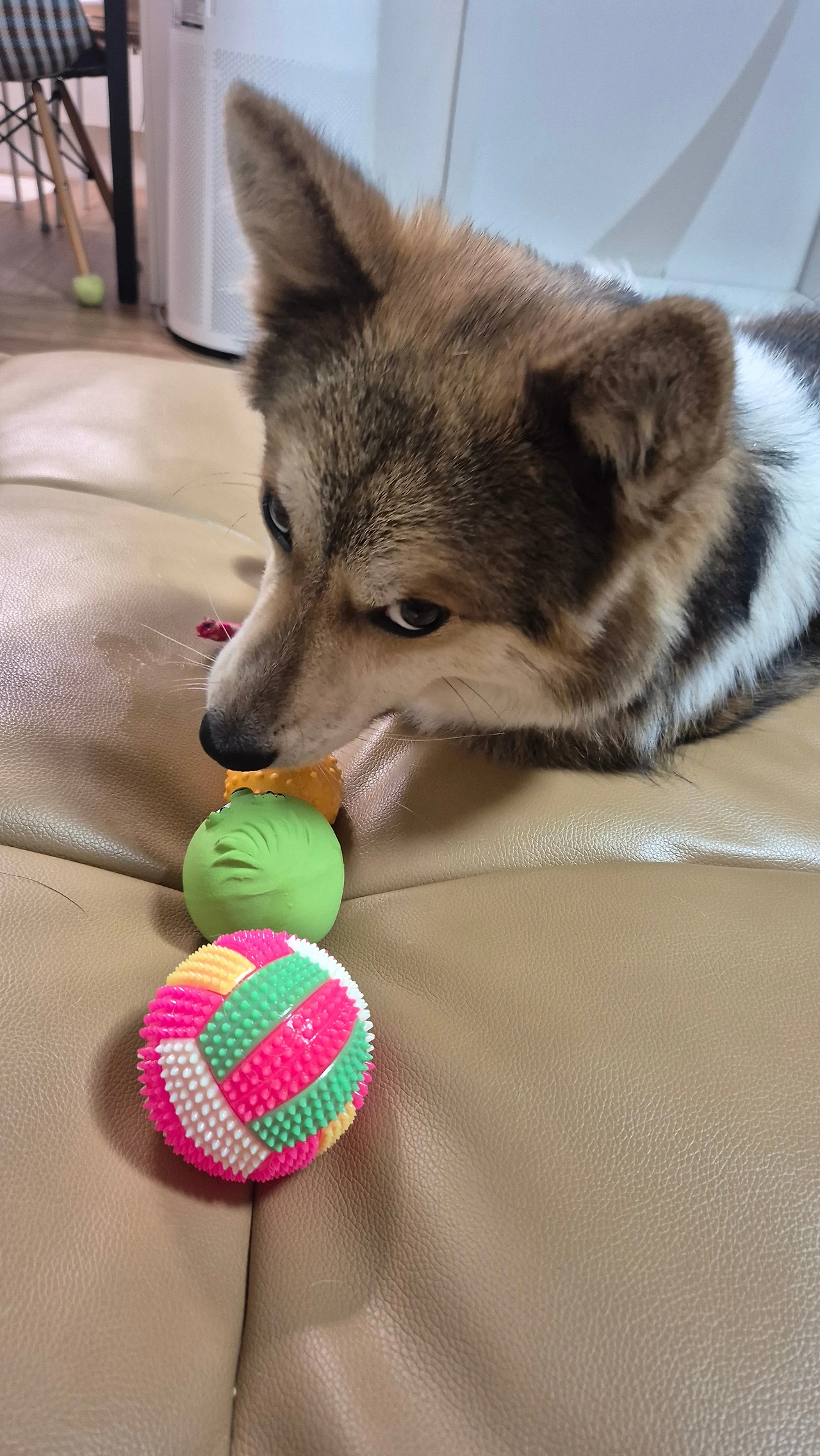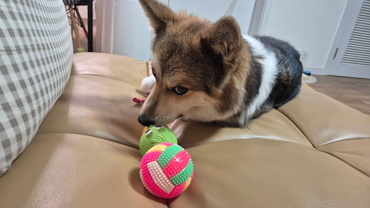 엄마가 칭찬하며 공을 던져주었습니다. 삑삑 삑삑, 신나게 놀았습니다.