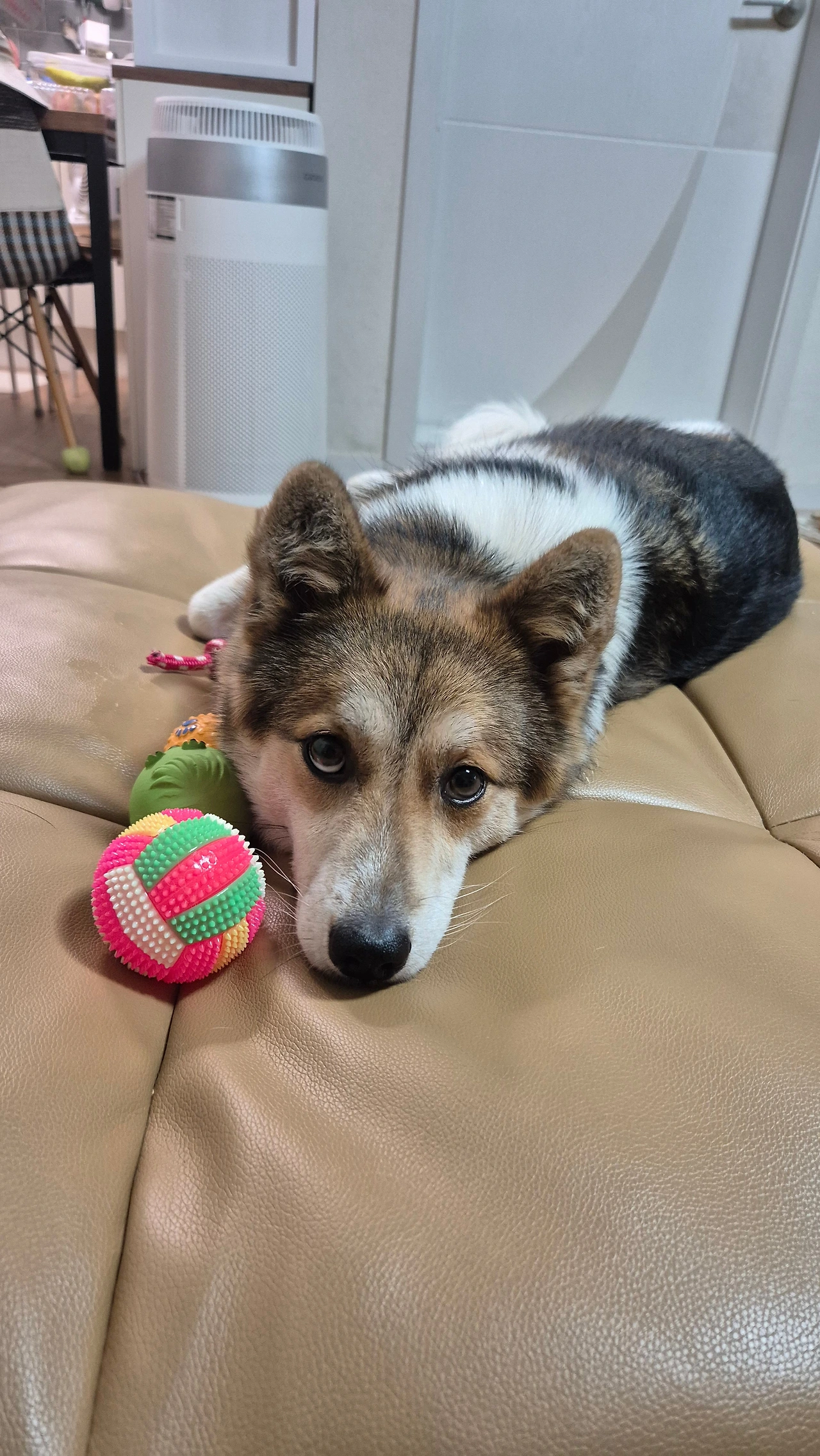 아빠는 순순히 내주지 않습니다. 손 줘, 발 줘, 돌아라, 엎드려라, 파이팅 해라 하며 투투의 애간장을 녹입니다. 다시 손! 하는 소리에 인내심이 한계에 달한 투투가 "아르릉, 아으흥~" 하더니 낑낑 댑니다. 그 모습을 보고 아빠가 웃습니다. 새 장난감을 받은 투투는 "삑삑 삑삑" 거리며 신나게 뛰어다녔습니다. 한참을 놀던 투투는 물을 "찹찹찹찹" 마시곤 장난감을 모두 소파 위로 올려놓고 지키기 시작합니다.