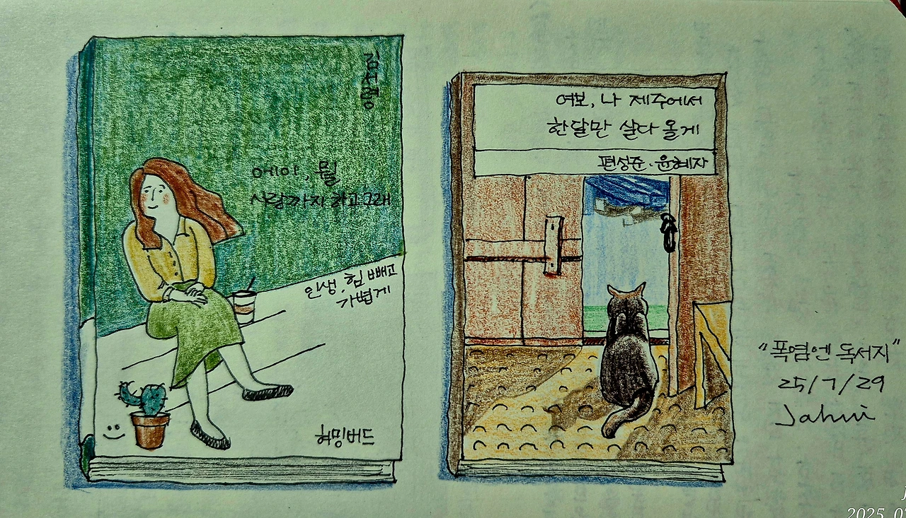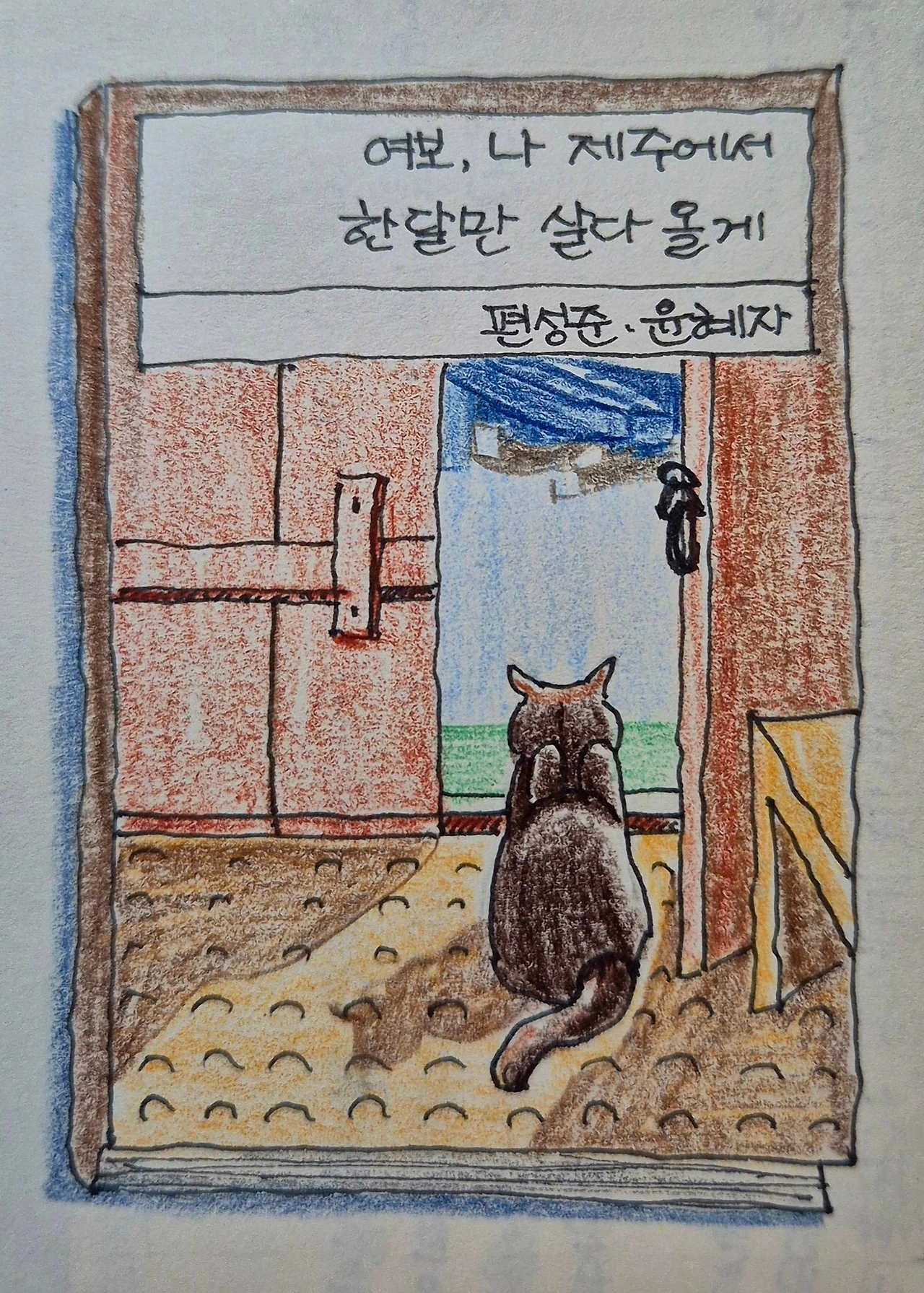 오늘도 푹푹 찐다. 아침마다 우리 집 개와 함께 집을 나설 때마다 무섭다. 38도라고 했다. 온몸을 휘감는 불기운에 둘 다 머뭇거렸다. 나란히 뽕나무 그늘에 서서 서로 얼굴을 쳐다보았다. 내 마음을 읽었는지 고맙게도 나무 그늘 아래에서 볼일을 보는 우리 집 개. 진심으로 고마워하며 마당 그늘 속으로 얼른 들어왔다. 아침이라 그늘은 제법 견딜만하다. 댕댕이 투투는 그늘진 잔디에서 2차 볼일을 보고 나는 그 옆 파라솔 아래에서 편성준 작가님의 '여보, 나 제주에서 한 달만 살다 올게'를 마저 읽었다.