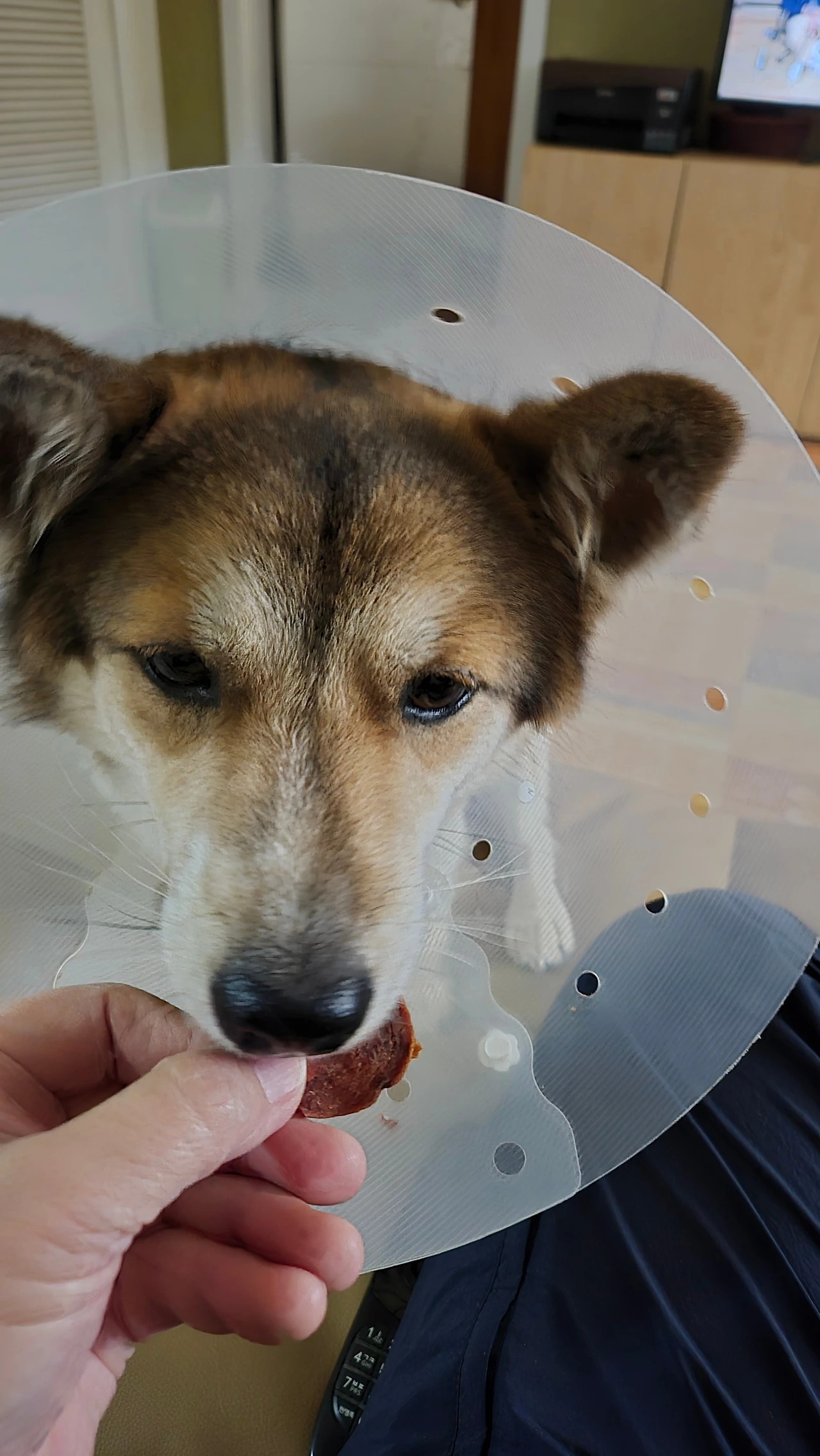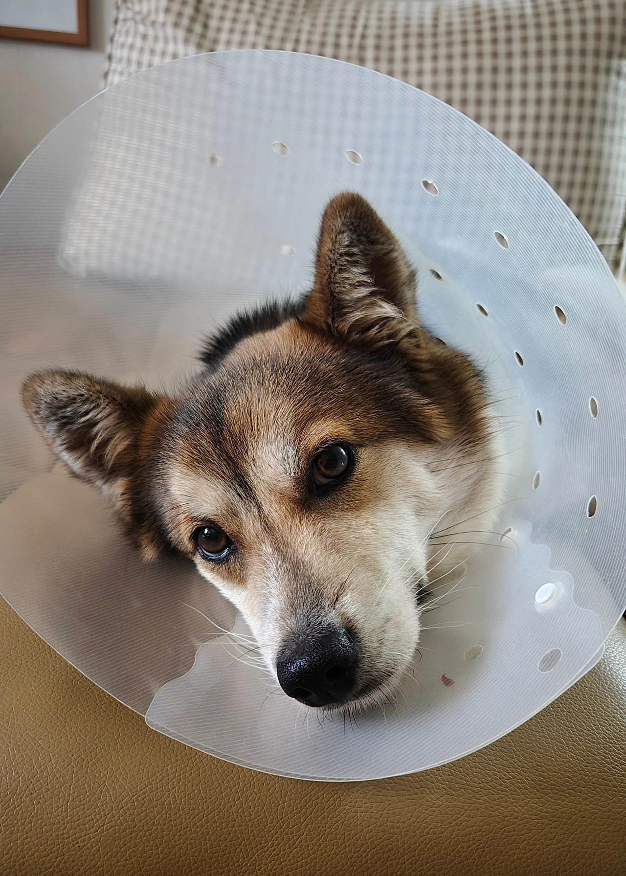 투투는 요즘 재미가 없습니다. 넥 카라를 착용 중이거든요. 오른쪽 뒷다리를 무슨 이유에서인지 자꾸 핥아서 염증이 생겼는데 낫지 않습니다. 2년 전 다리를 수술하며 박았던 핀도 뺐는데 무엇이 투투를 거스르게 하는지 다리를 핥아대는 통에 아침마다 피가 맺힐 정도입니다. 처음엔 밤에만 넥 카라를 했지만 별 효과가 없어서 하루 종일 착용한 지 한 주가 지났습니다. 매일 소독하고 처방받은 연고를 바릅니다. 그래서 투투는 사는 게 재미 없다는 얼굴로 엄마를 바라봅니다.