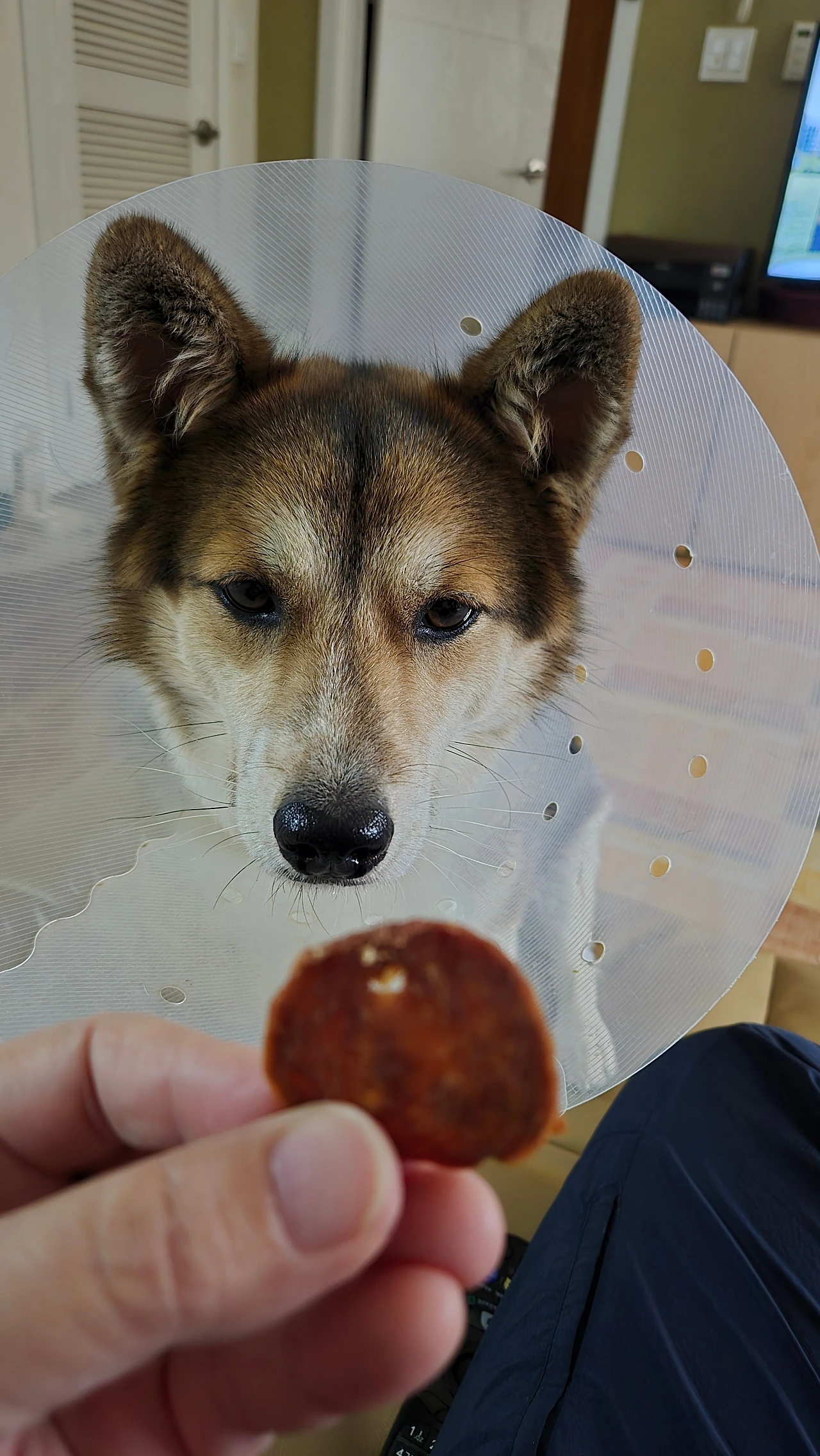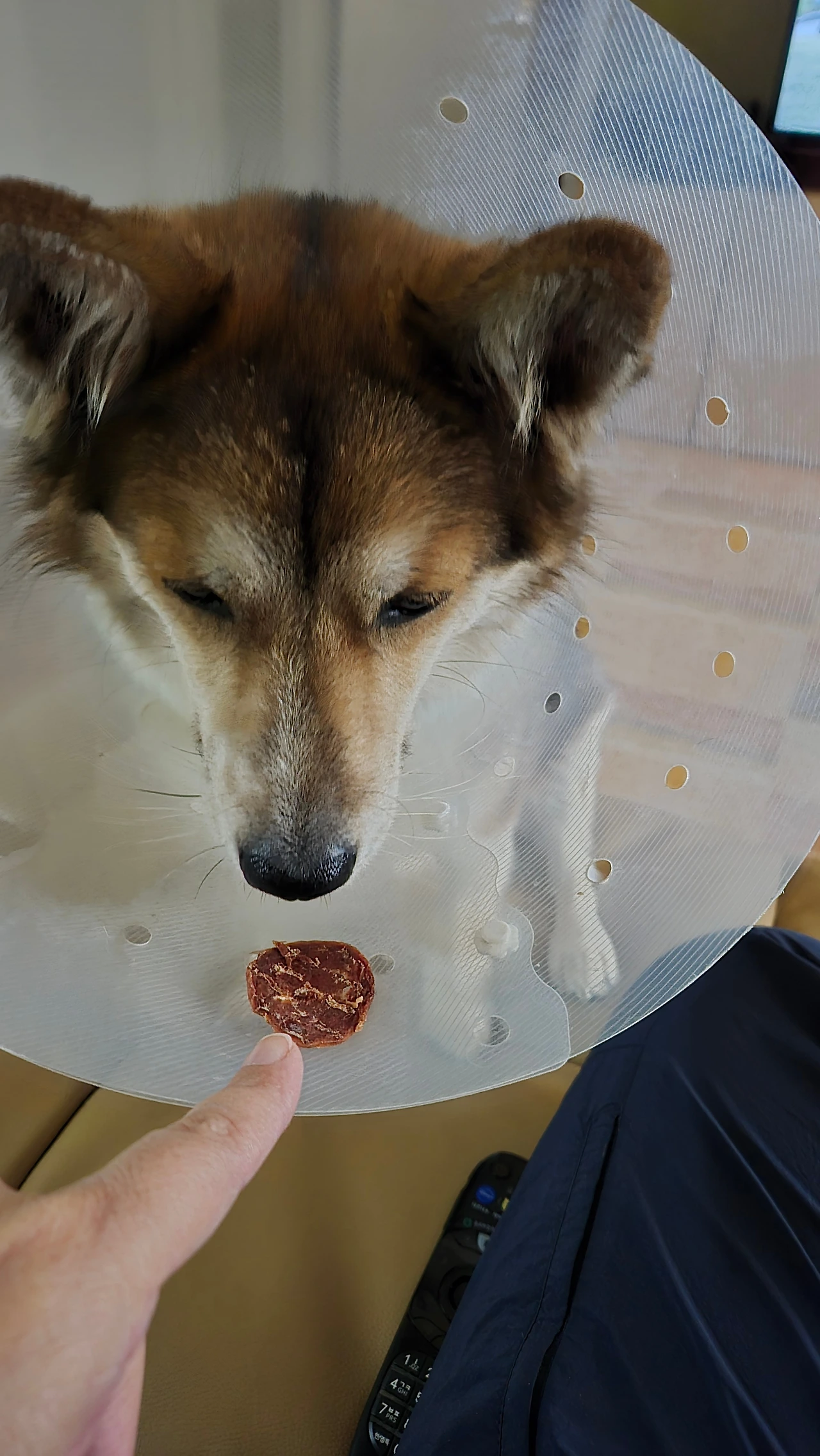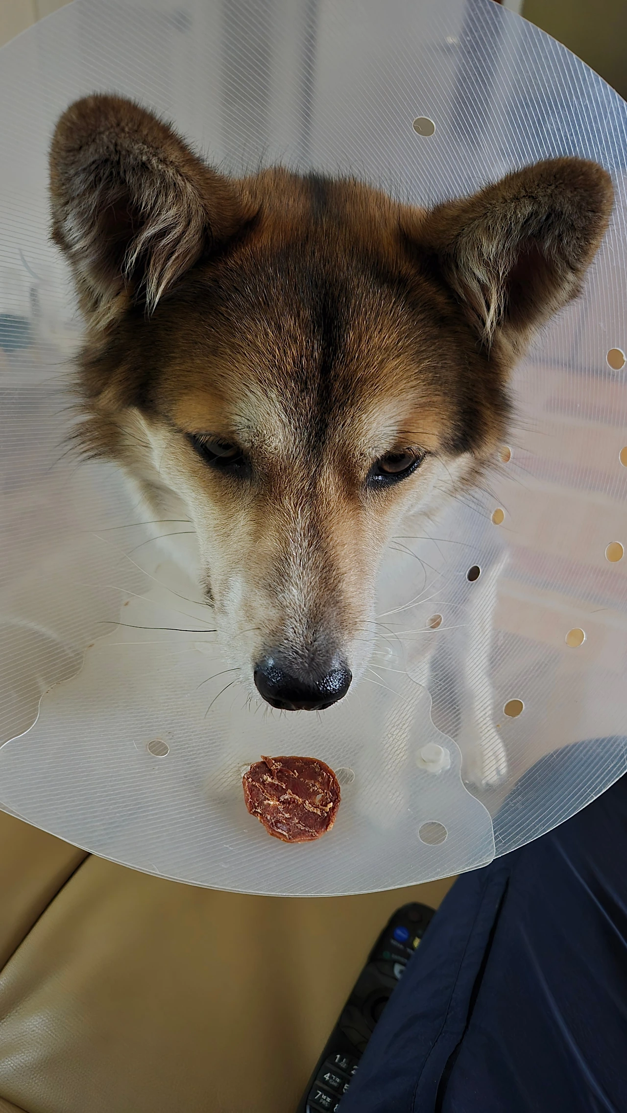 자, 투투. 지금부터 나비하는 거야. 꼬리를 치며 겅중거리던 투투가 자리에 앉더니 간식을 보고 기다립니다. 엄마가 "나비~"하며 간식을 놓았습니다. 넥 카라에 간식을 둔 건 너무 한다고요?ㅎㅎㅎㅎ그렇군요. 엄마가 너무합니다. 투투를 더 관찰하고 싶어서 그랬습니다. 아주 가까이 간식을 놓아도 참고 기다릴 수 있는지를요.