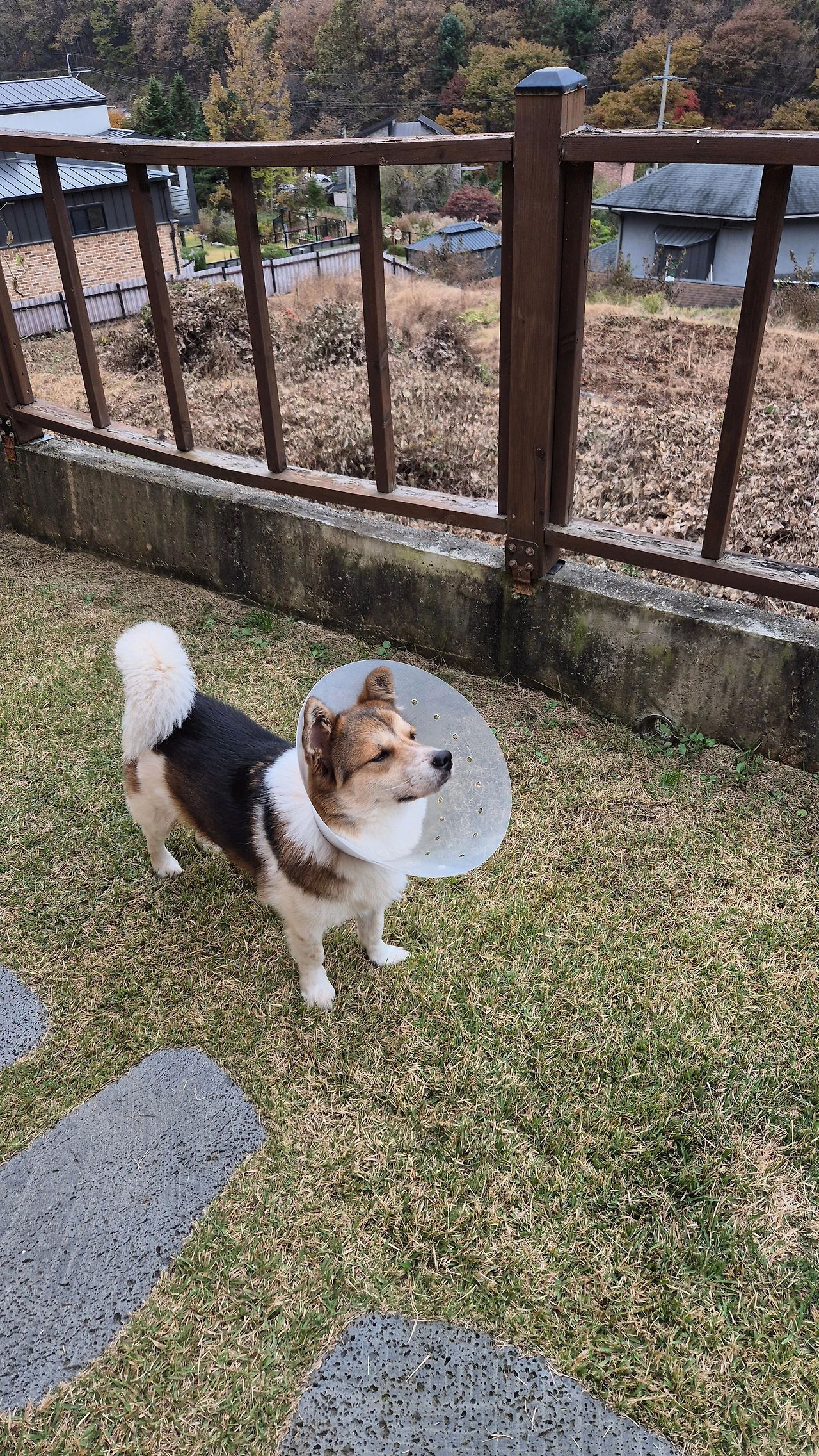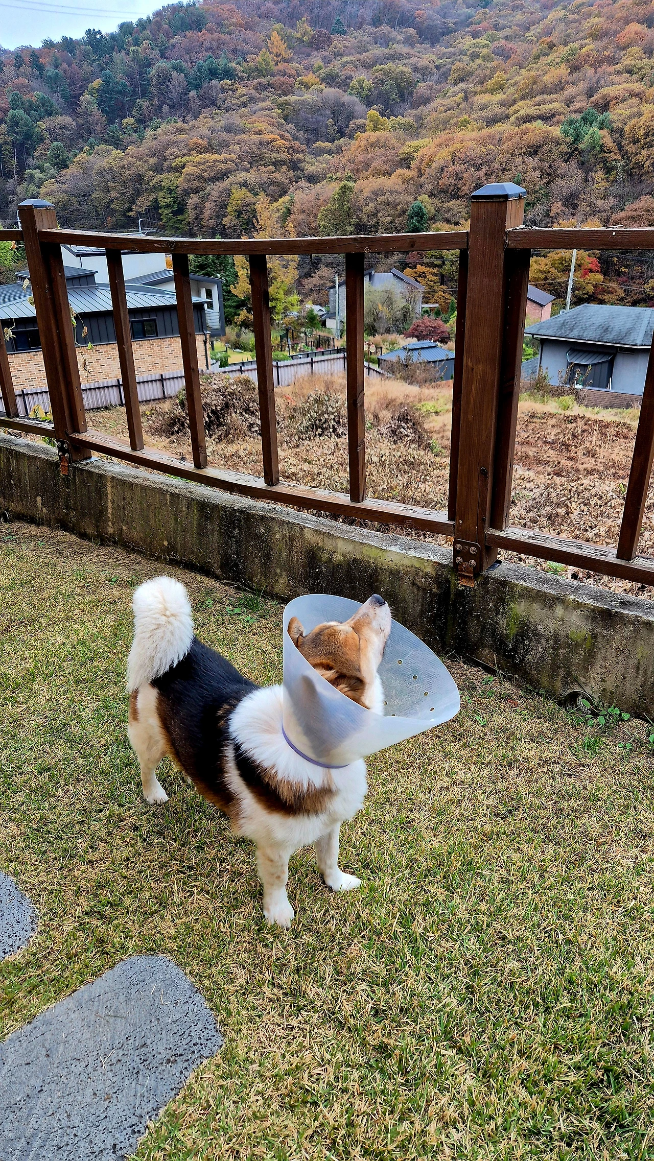 잘 기다리는 투투가 대견합니다. 마지막 간식은 기다림 없이 바로 주고 우리는 다정하게 마당으로 나가 가을 풍경을 감상했습니다. 투투 다리도 곧 나을 것입니다.