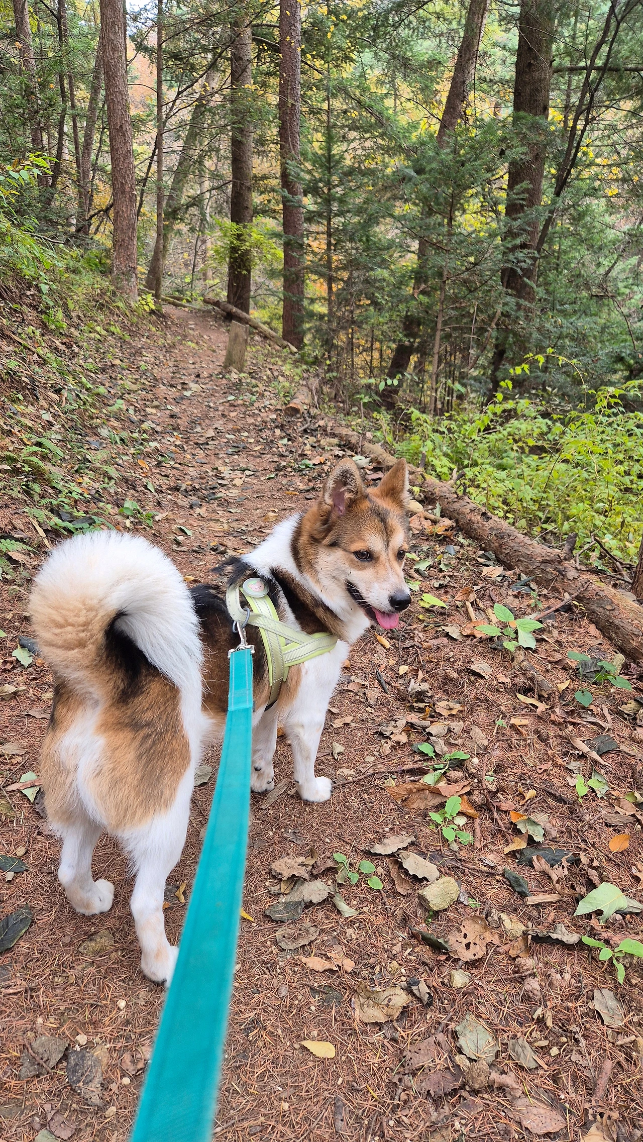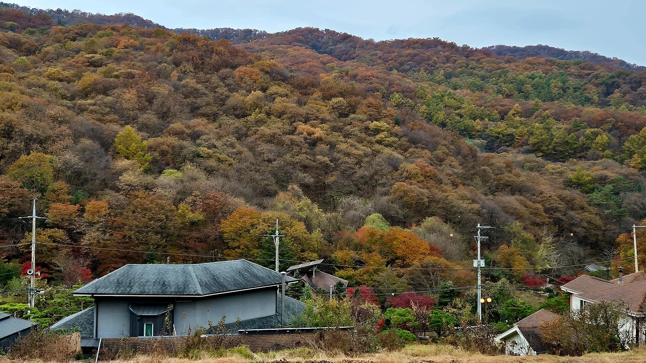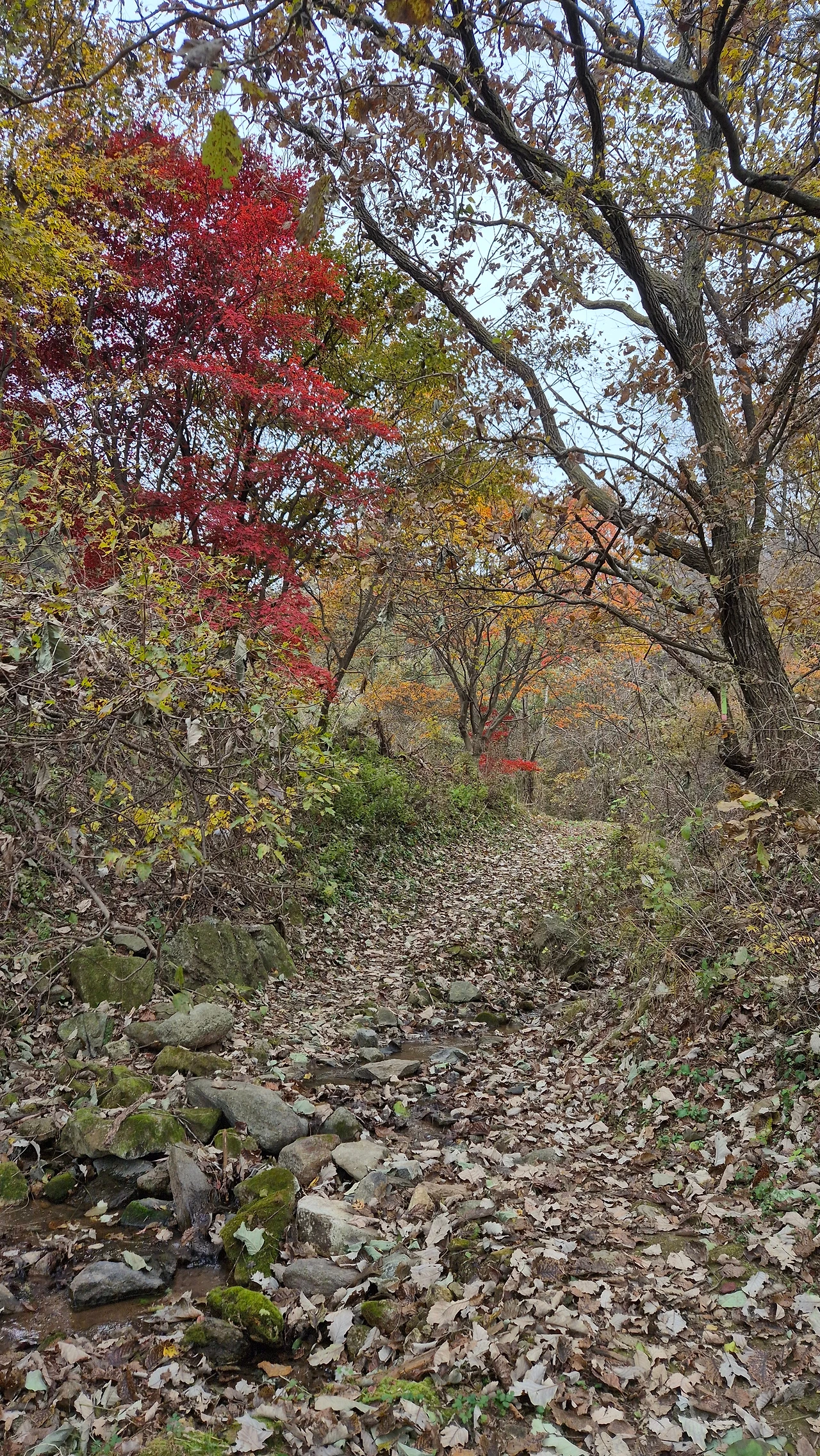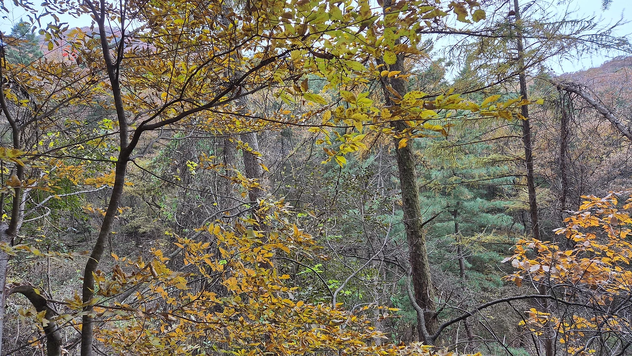 전나무 숲 사이로 난 오솔길도 지나갔습니다. 투투는 앞만 보고 가지 않습니다. 그 모습이 엄마는 인상적입니다. "투투!"하고 엄마가 부르면 돌아보고 "가자." 하면 앞장서 가는 투투와 엄마는 말이 통하고 뜻이 통합니다. 산비탈길도 내려다보고 목을 빼고 계곡 아래도 쳐다봅니다. 올 단풍은 화려하진 않고 수수합니다. 색이 빠져 엷은 주황과 노랑, 희미한 연둣빛이 어우러진 숲이 아름답습니다.