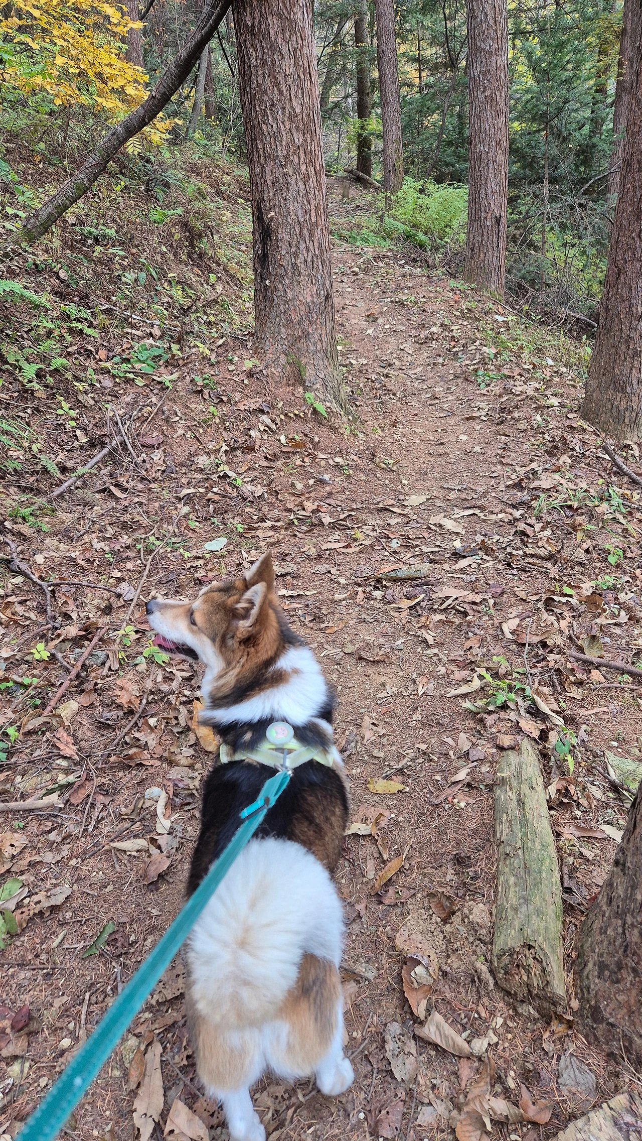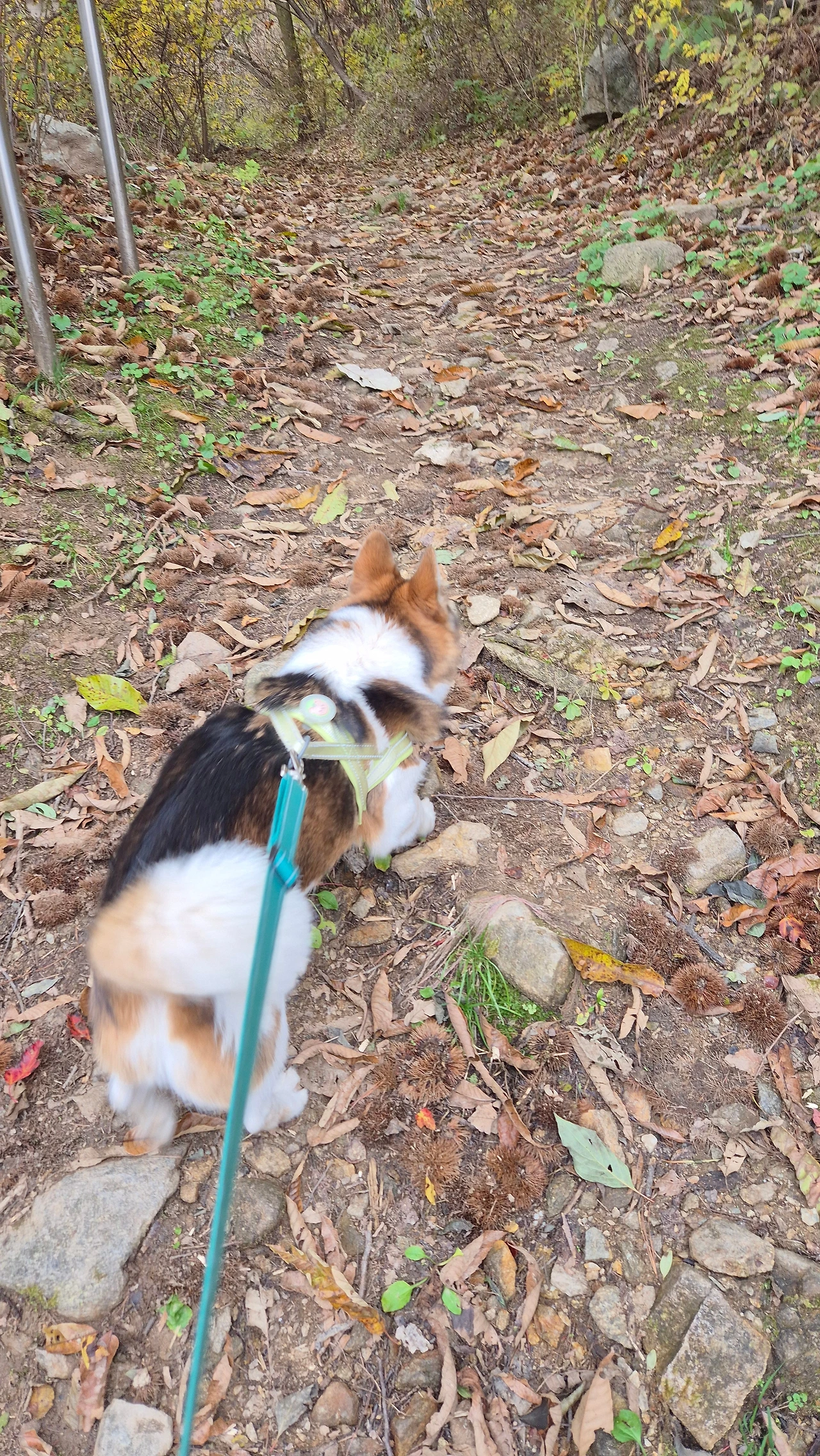숲에 들어오니 계절이 훨씬 깊다는 걸 알겠습니다. 비가 내리면 기온은 크게 내려가겠지요. 기온이 내려간 숲도 참 좋습니다. 그런데 너무 건조합니다. 바람 부는 사이로 싸라락 전나무 잎들이 떨어집니다. 전나무 숲 옆으로 난 길로 가면 약수터가 있는데 투투가 물냄새를 맡았는지 방향을 틉니다. 모퉁이를 돌면 약수터인데 투투가 멈칫하더니 가지 않겠다고 합니다. 등산객들이 약수터에서 물을 마시며 쉬는지 왁자하게 떠드는 소리가 들렸습니다. 물 안 마실 거야? 약수터 사진도 찍어야 되는데? 투투와 엄마는 발길을 돌렸습니다. 내려올 땐 엄마가 앞장을 섰습니다. 투투 걸음이 조금 느려졌거든요.