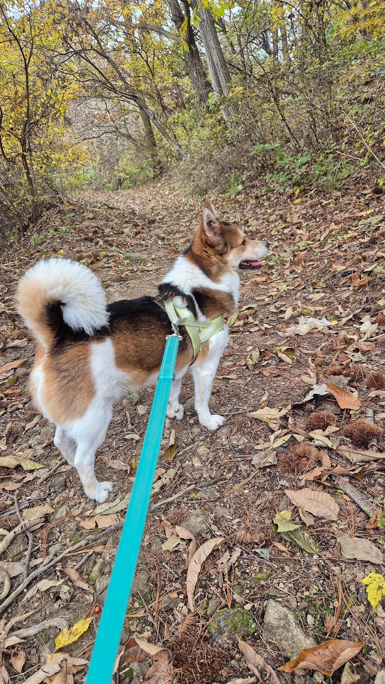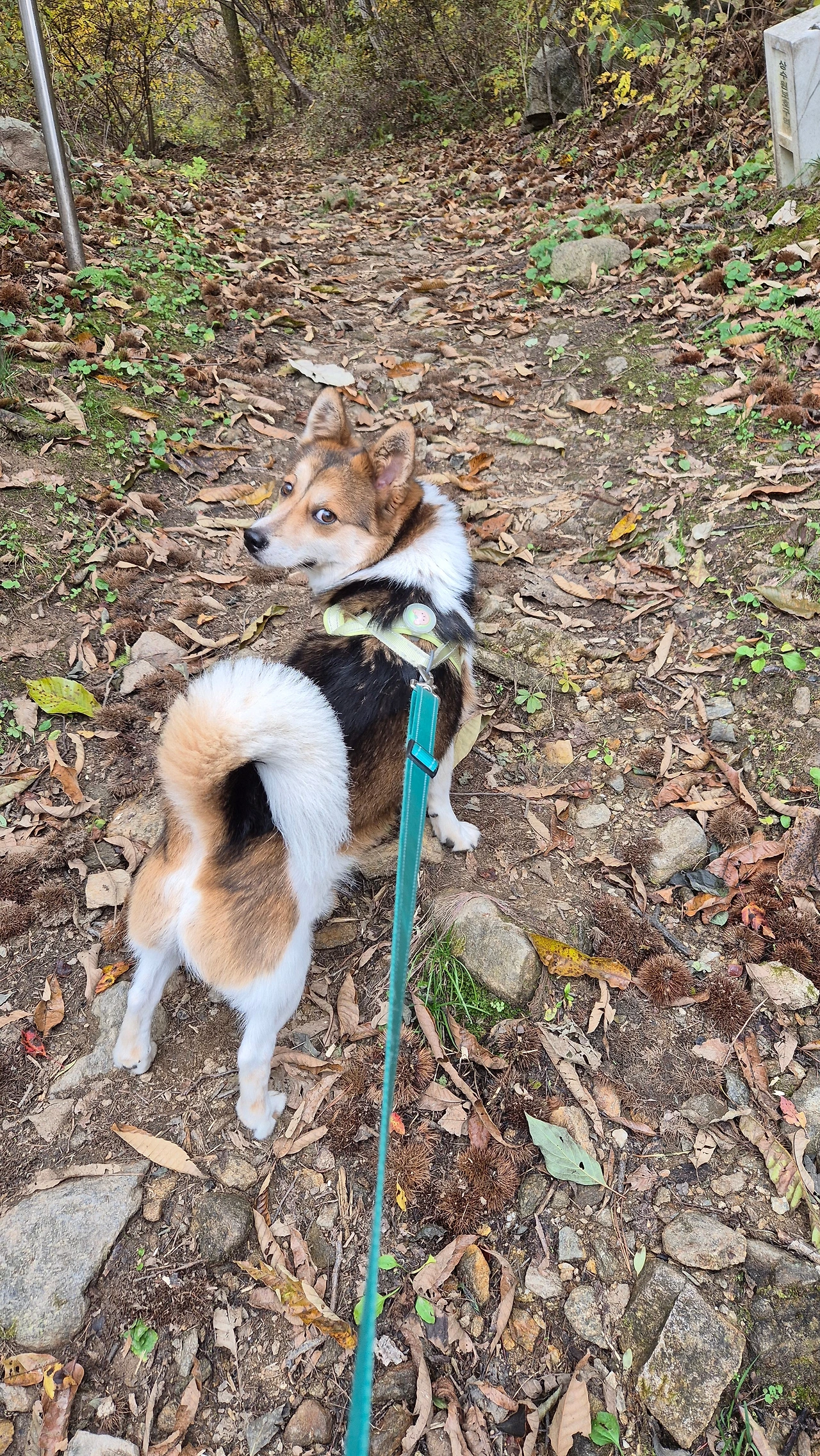 날이 너무 환해서, 잎이 가득 쌓여있을 저기 보이는 앞산으로 산책을 가기로 했어요. 산행이라고 해야 더 맞을 것 같군요. 오르락내리락 왕복 1시간 정도 걸리는데 꽤 땀을 흘려야 합니다. 그동안 3,40분 정도 짧은 산책을 해왔기에 투투 다리도 괜찮지 않을까 생각했습니다. 게다가 도저히 방구석에서 책이나 뒤적이기엔 날이 아깝습니다. 투투가 좋아서 약간 흥분을 합니다.