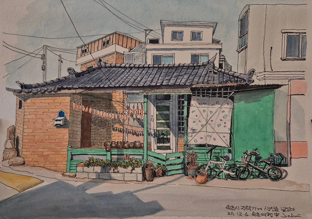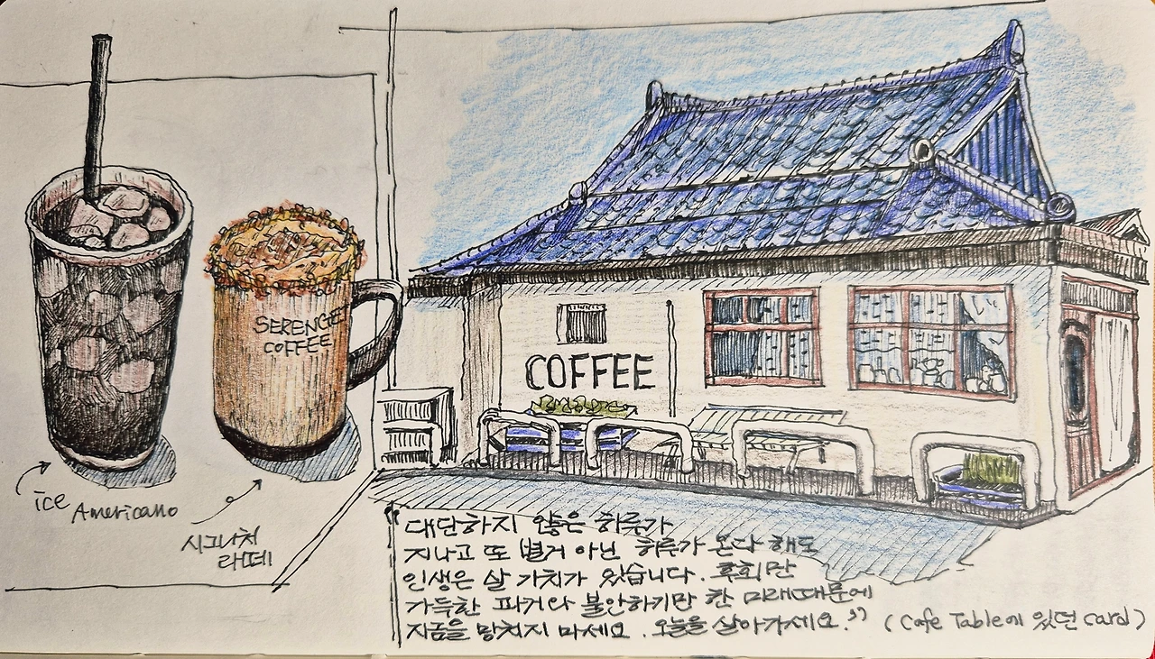 생일자를 위해 갔던 속초행은 이 그림으로 마무리되었다. 그림을 보니 그때 그 장소와 그곳에 있던 사람들의 표정, 주고받은 말들, 들고 있던 커피 향 등이 되살아 난다. 어반 드로잉은 한 장의 usb다. 그림 한 장에 여행의 기억과 감정이 고스란히 담긴다.