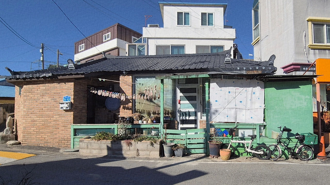 이번 여행은 잘 풀리지 않는구먼, 입맛을 다시며 돌아 나오는데 환한 햇살 속에 민트색 집 한 채가 짠~하고 나타났다. 데크와 낮은 대문에 민트색 칠을 했고 빨랫줄엔 가자미와 오징어가 꼬들꼬들 매달려 있었다. 지붕은 새로 얹었는지 햇살이 튕겨나가고 걸려있는 생선들 뒤로 선명한 그림자가 쪼로록 매달려 있는 것이 눈에 들어왔다.