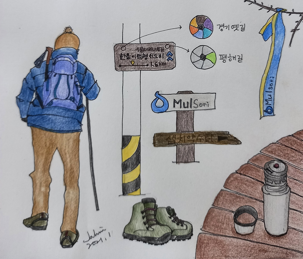트래킹 차림의 사람들이 동넷길을 따라 길을 올라가는 모습을 종종 보곤 했다. 어디로 가는 걸까? 궁금했다. 그러던 어느 날, 예의 한 무리가 청명한 햇살 속을 지나가고 있는 것을 보았다. 위쪽으로 난 길은 막다른 동넷길인데 거기 뭐가 있다고 저리 가는 것일까? 다른 길이 있는 거야! 충동적으로 모자를 집어 들고 서둘러 그들이 사라진 길로 가보니 동넷길 중간쯤 오른쪽으로 작은 이정표가 보였고 그 이정표는 숲길을 가리키고 있었다. 계곡물이 흐르는 옆으로 좁은 길이 이어지더니 이내 그늘 진 시원한 숲이 나왔다. 숲은 입구부터 우거져서 제법 어두웠고 길 끝이 보이지 않는 오르막이어서 나는 되돌아왔다. 다음 날 제대로 장비를 챙겨 가보니 그곳은 한낮에도 시원하게 그늘이 지는 숲길이었고 서너 개의 등산로가 시작되는 곳이었다. 알고 보니 물레길이라고 알려진 걷기 코스의 하나로 고맙게도 그 길은 바로 집 앞에 있어 언제든 숲길로 향할 수 있었다. 내가 사랑하는 전나무 숲과 선물 같은 약수터가 있는 곳. 그 날 이후 나는 이 숲길을 걸었고 주말에 가족과 함께 걷다가 본격적인 걷기를 시작한 후는 거의 날마다 걷는 곳이 되었다. 나의 걷기는 이 숲길을 발견한 이후부터 시작되었다.